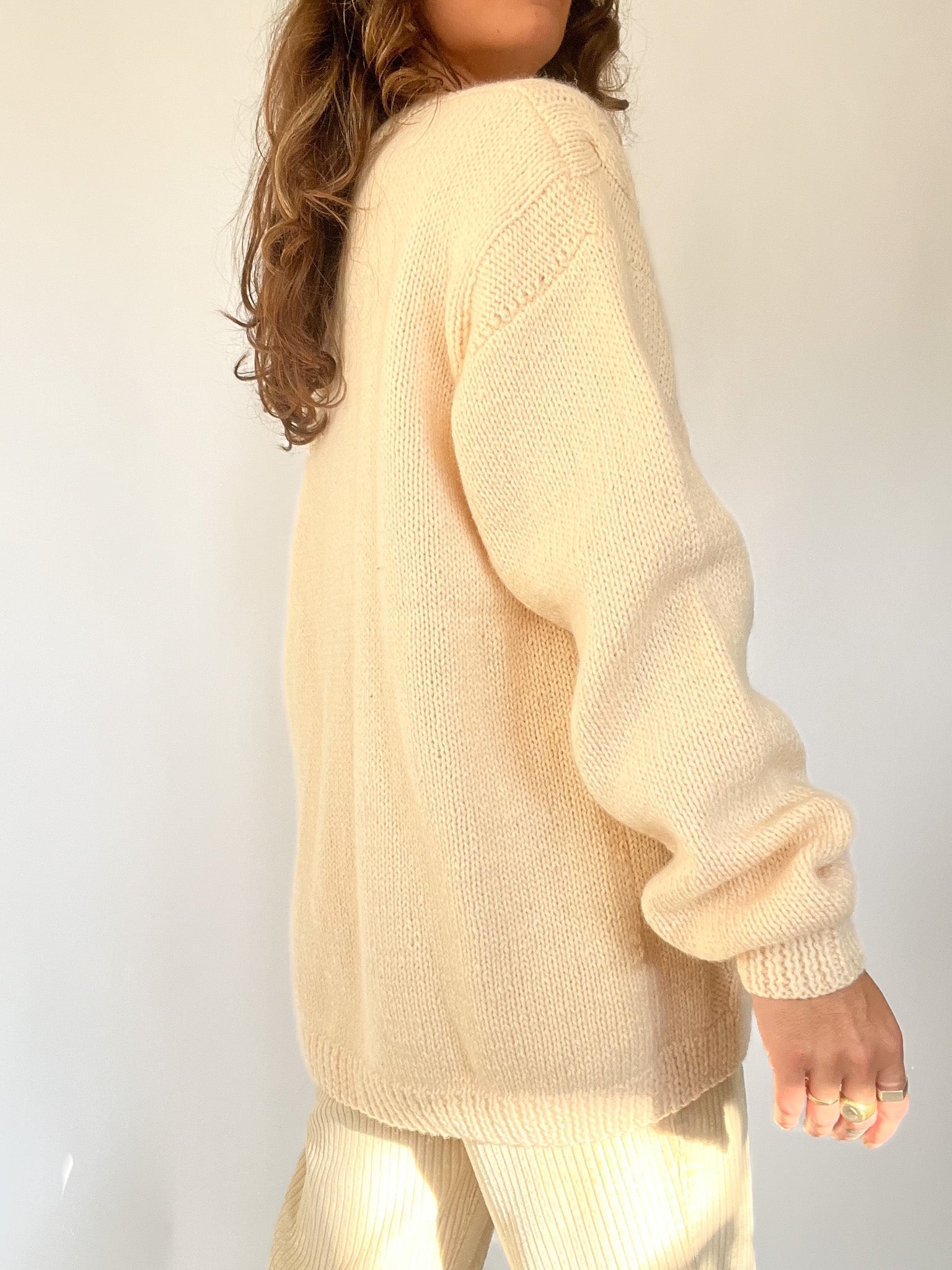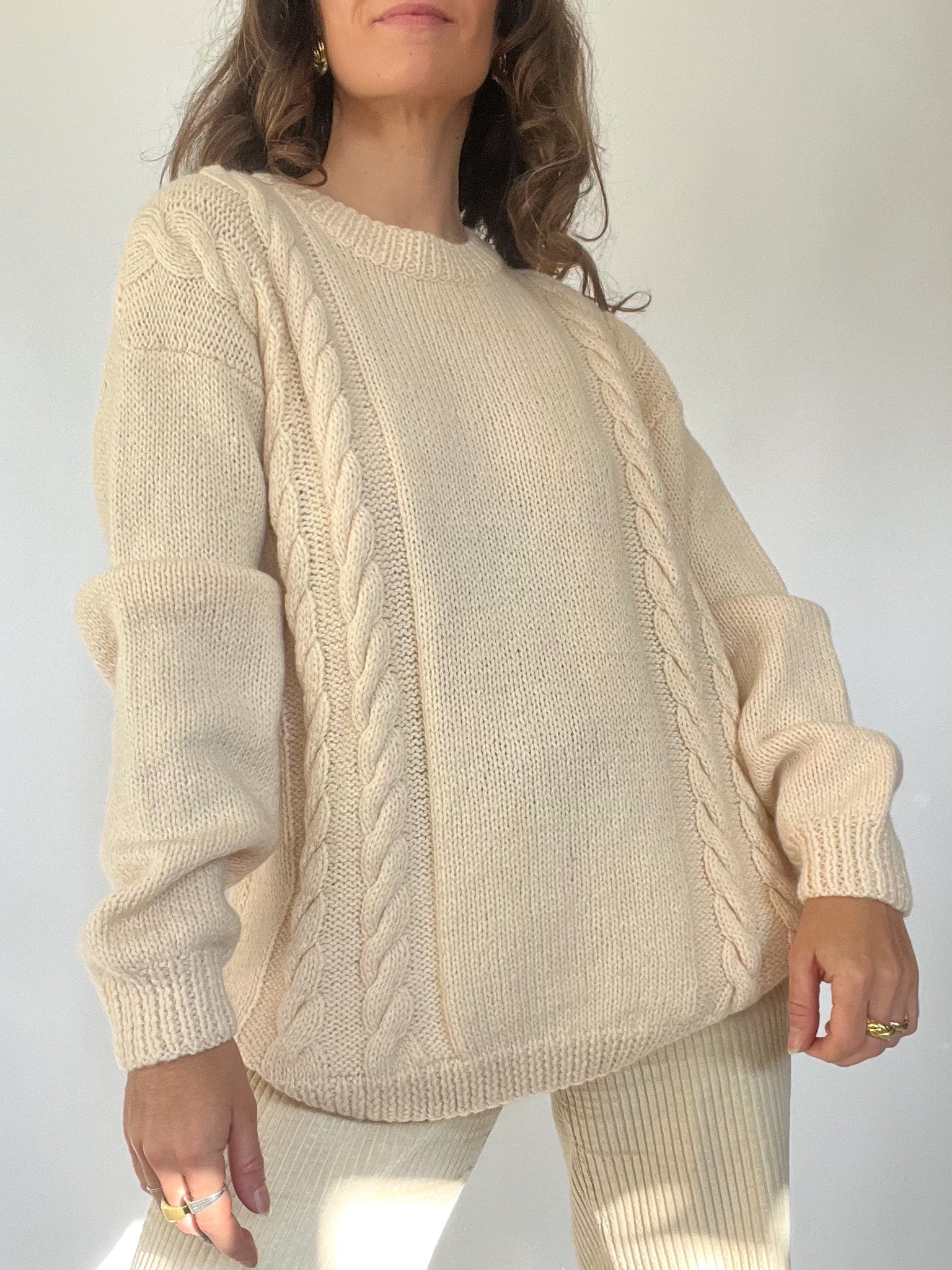 Embrace the warmth and softness of this vintage cream pullover, designed with elegant cable knit details running down the sides. Its relaxed fit and classic silhouette make it a timeless staple, ideal for cozy layering during chilly seasons. The neutral tone allows for versatile styling, pairing effortlessly with various textures and colors.