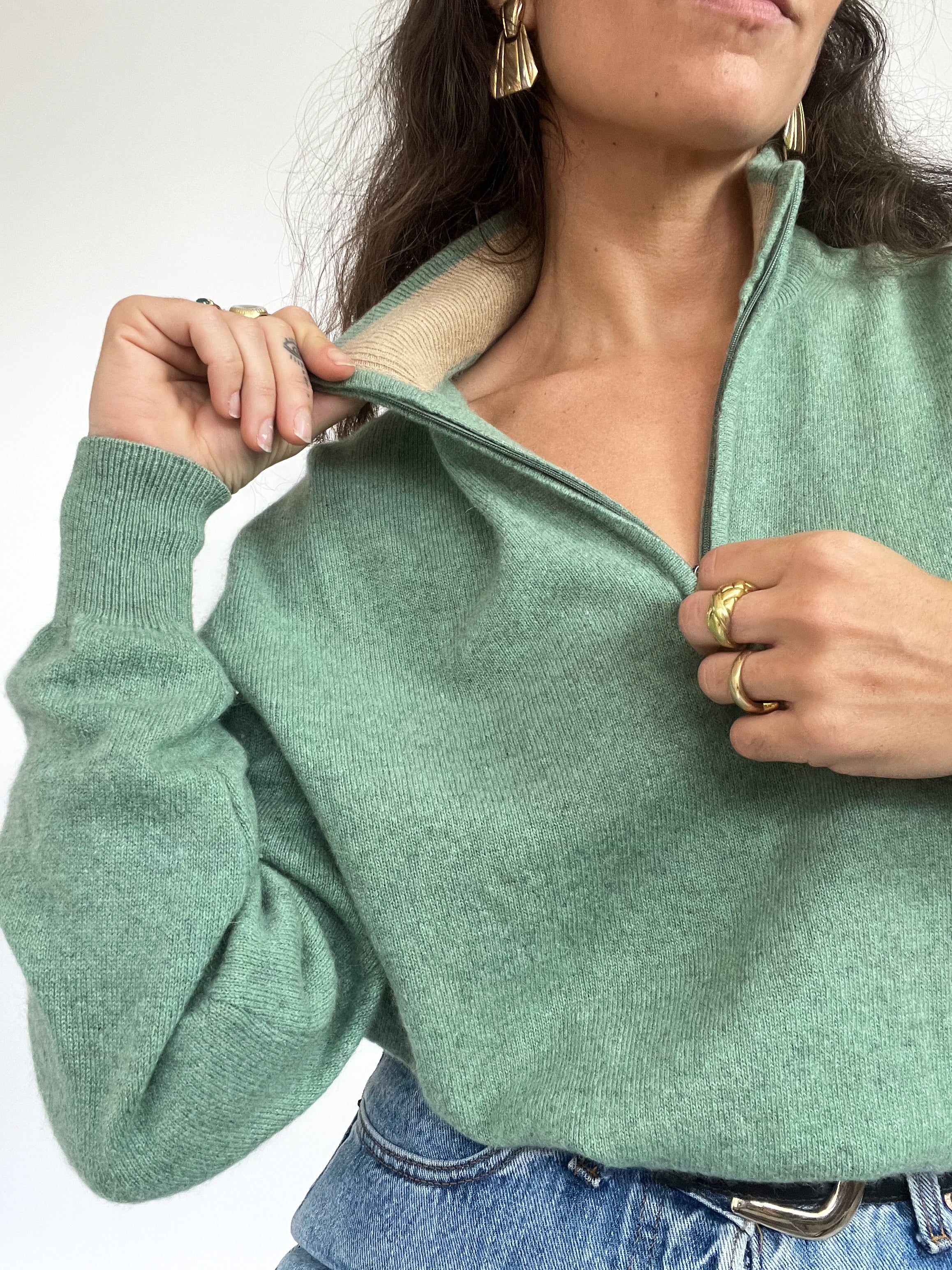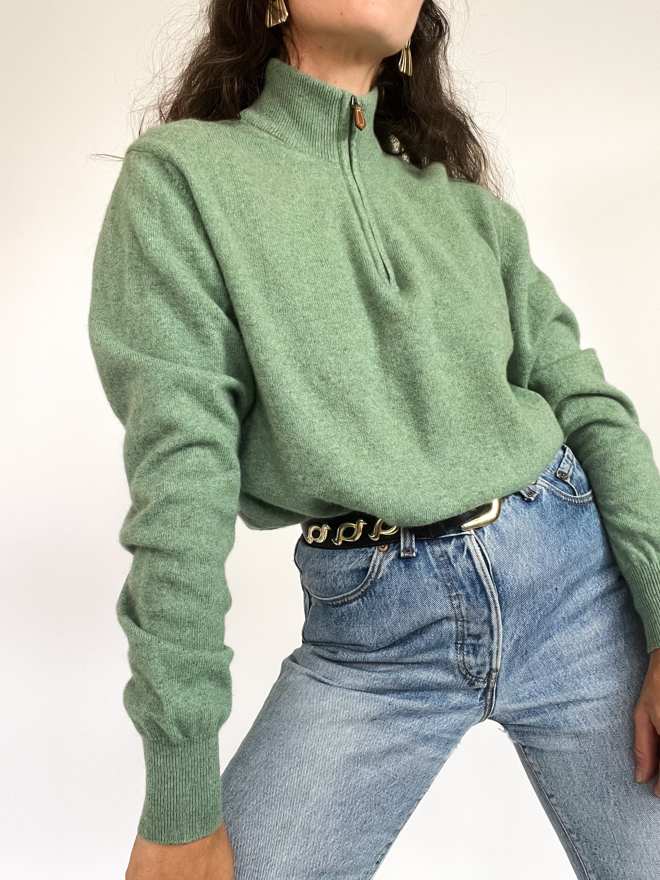 This vintage green zip-up pullover is a timeless piece, perfect for adding a casual yet chic vibe to your wardrobe. The soft green hue pairs beautifully with jeans or casual trousers. Featuring a half-zip neckline with a leather tab, it’s both functional and stylish. The sweater’s ribbed cuffs and hem ensure a snug and comfortable fit.