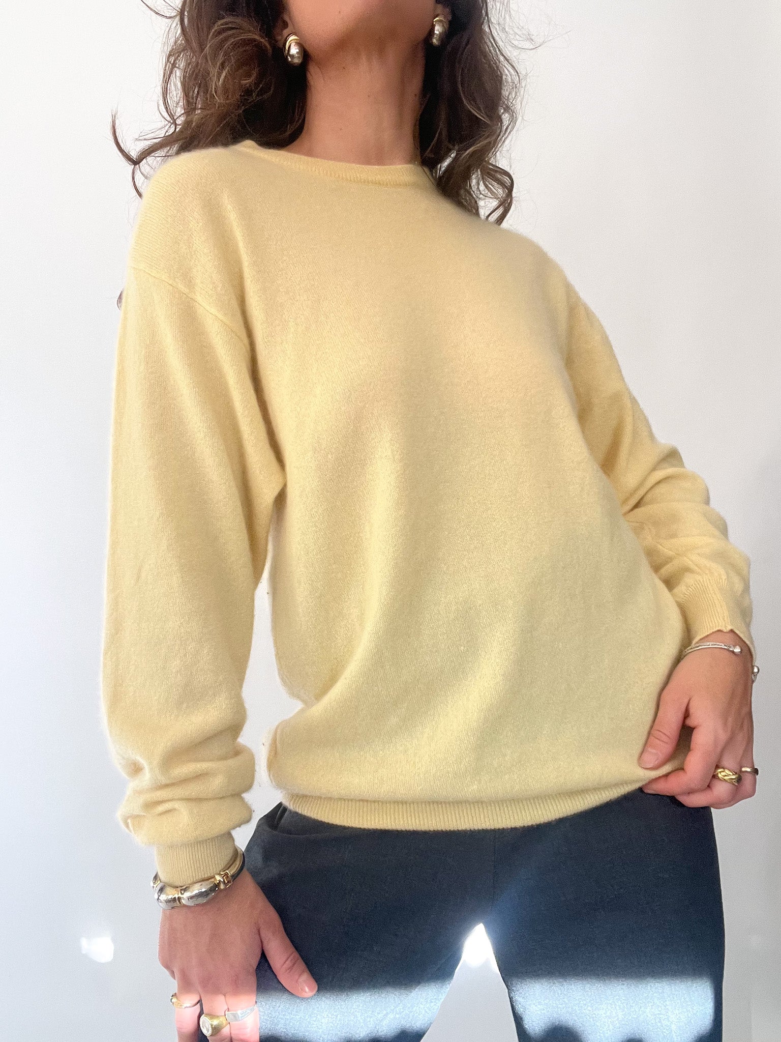 This elegant butter-yellow pullover is crafted from soft, luxurious cashmere, offering an understated sophistication perfect for everyday wear or layering. With its classic crew neckline and relaxed fit, it blends simplicity with effortless chic, making it a timeless wardrobe essential.