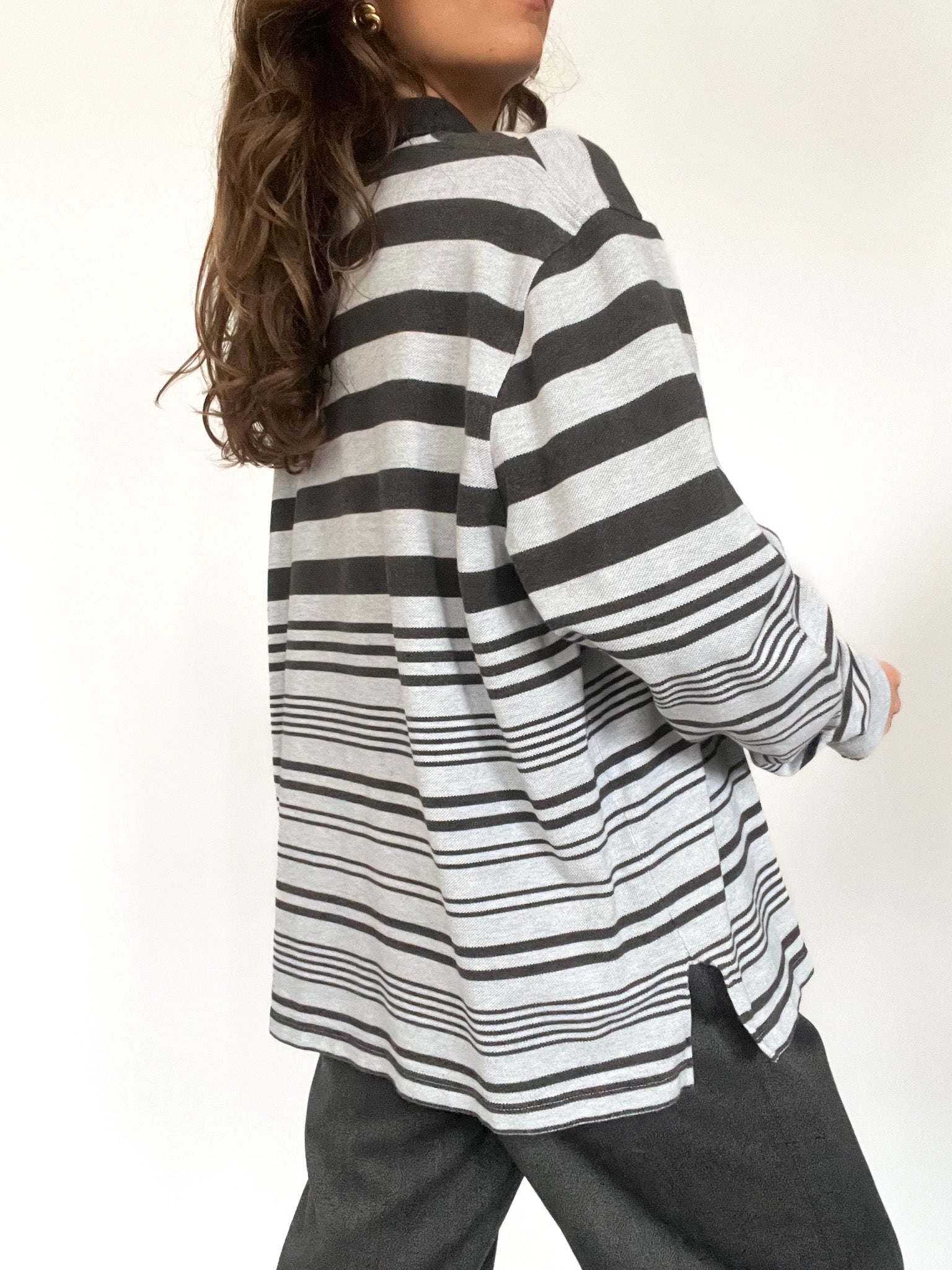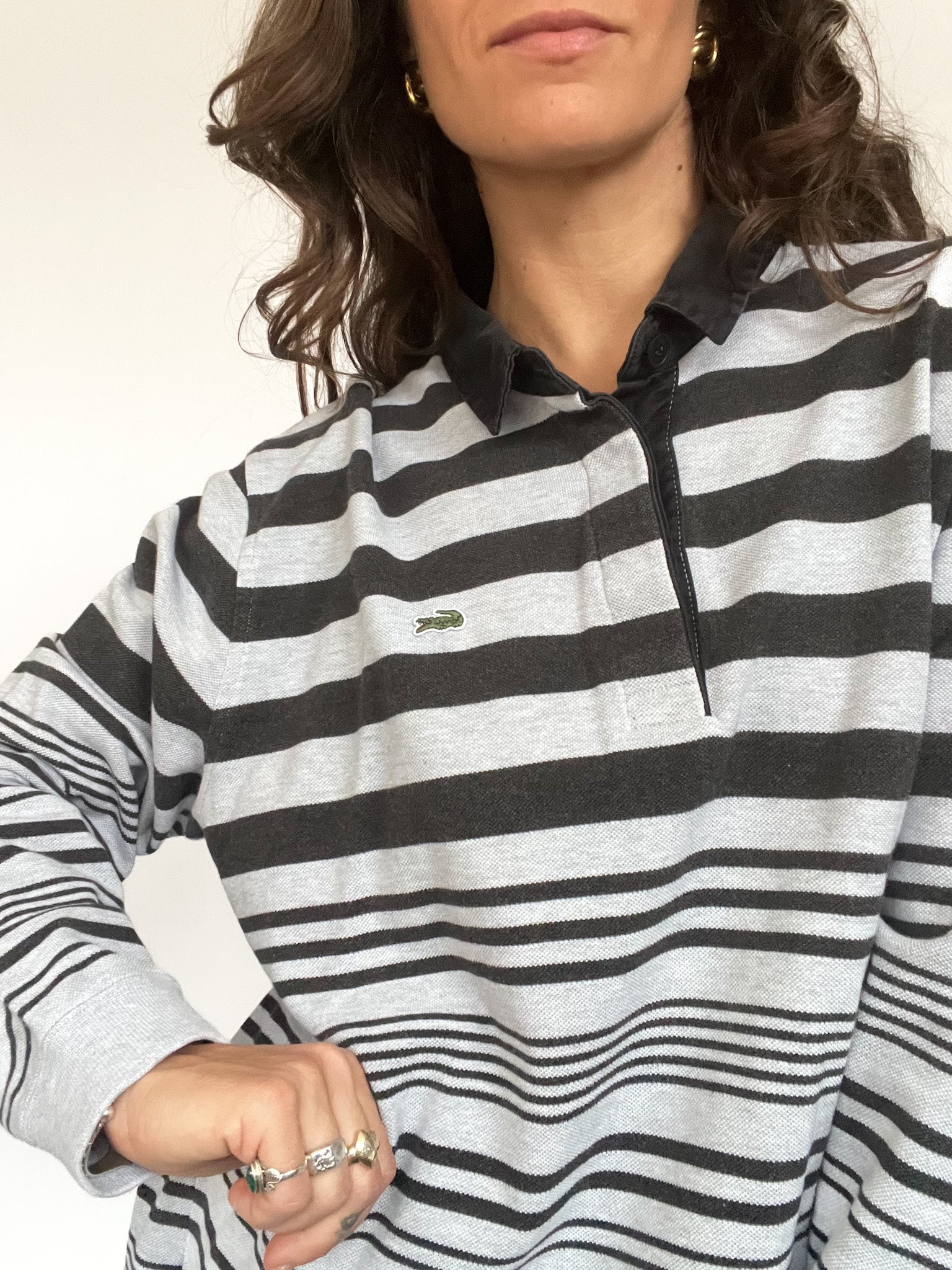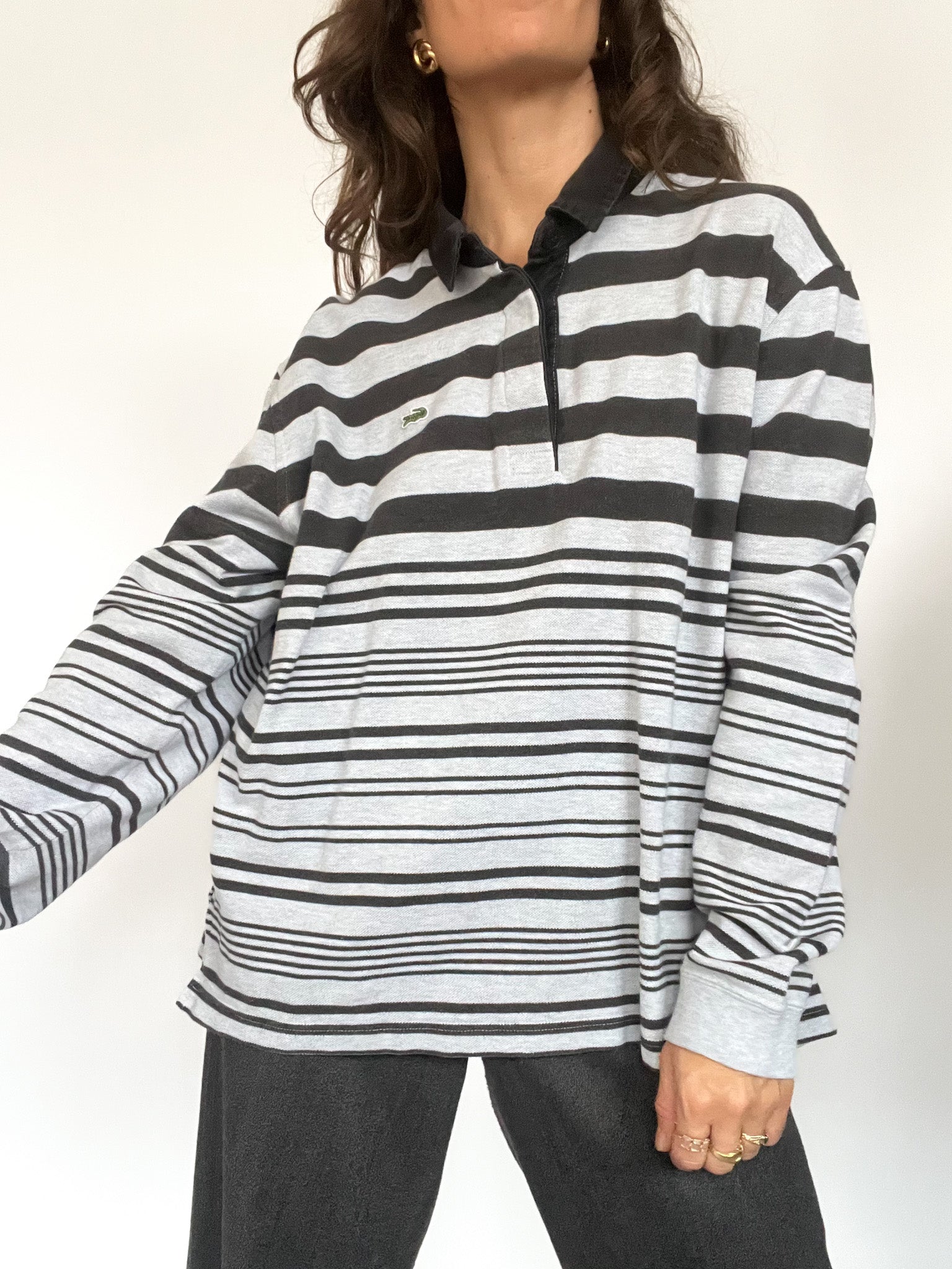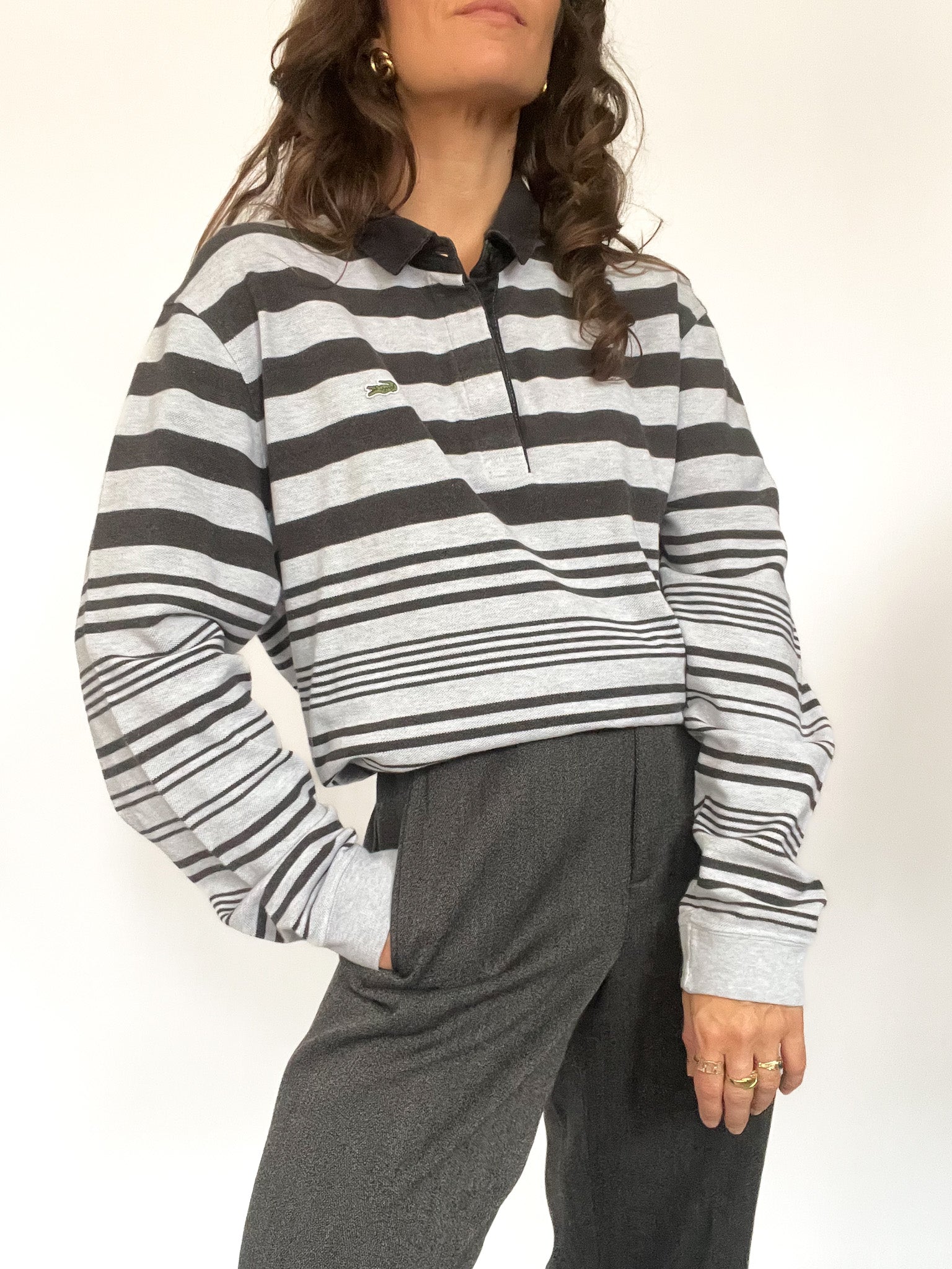 A classic and effortlessly cool vintage Lacoste rugby shirt featuring a bold striped pattern in shades of grey and black. The oversized fit and structured collar with a concealed button placket give it a relaxed yet sporty vibe. The embroidered Lacoste crocodile logo on the chest adds an iconic touch, while the ribbed cuffs provide a snug fit.