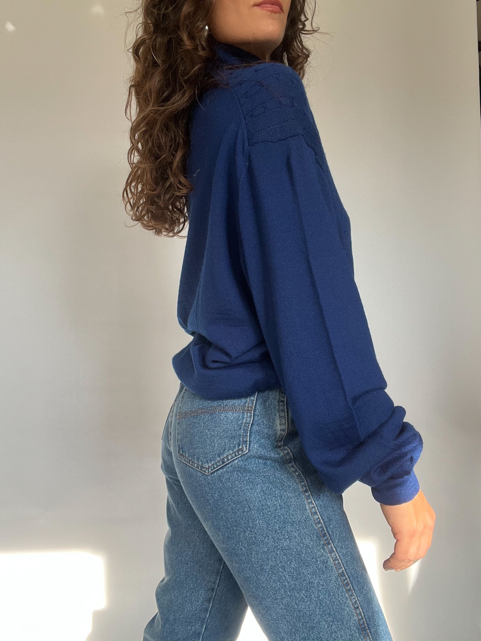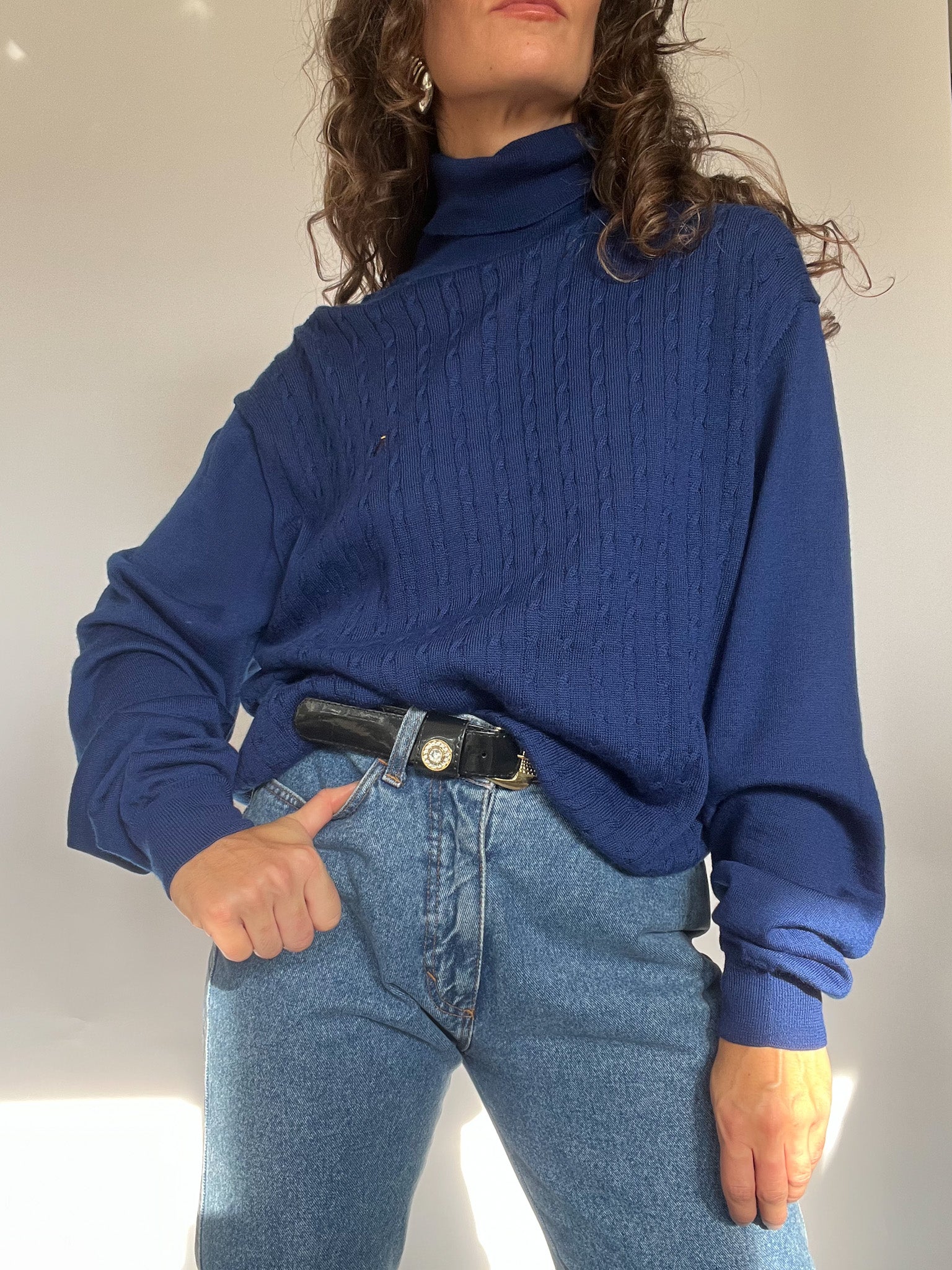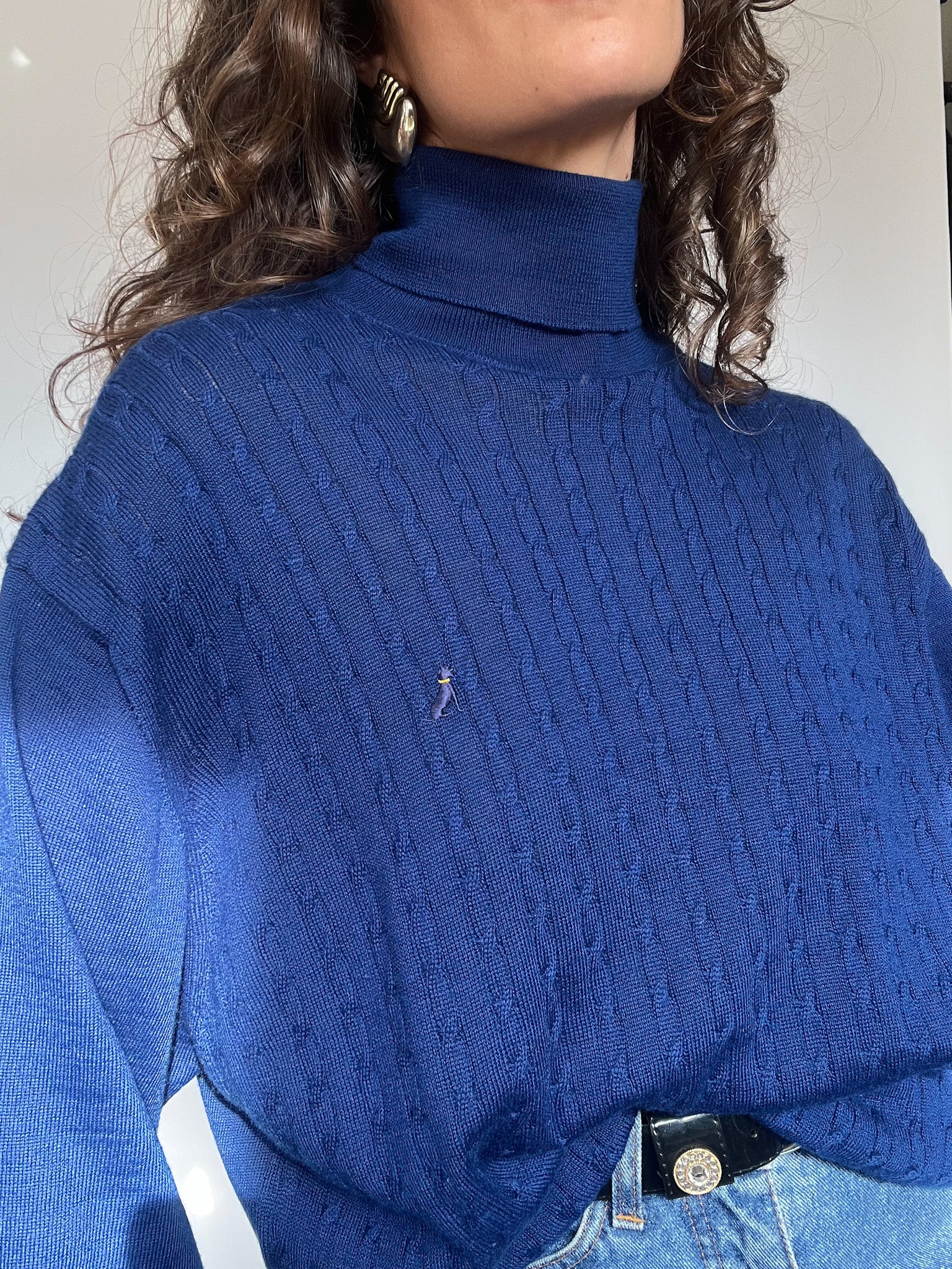 Crafted in a deep navy blue hue, it features a fine cable-knit detail on the front, balanced with soft, smooth sleeves for an unexpected contrast. The embroidered Polo logo subtly enhances its refined aesthetic, while the high roll neck offers a sophisticated silhouette. With its relaxed fit and lightweight knit, this piece layers effortlessly over any outfit, making it perfect for a polished yet cozy look.