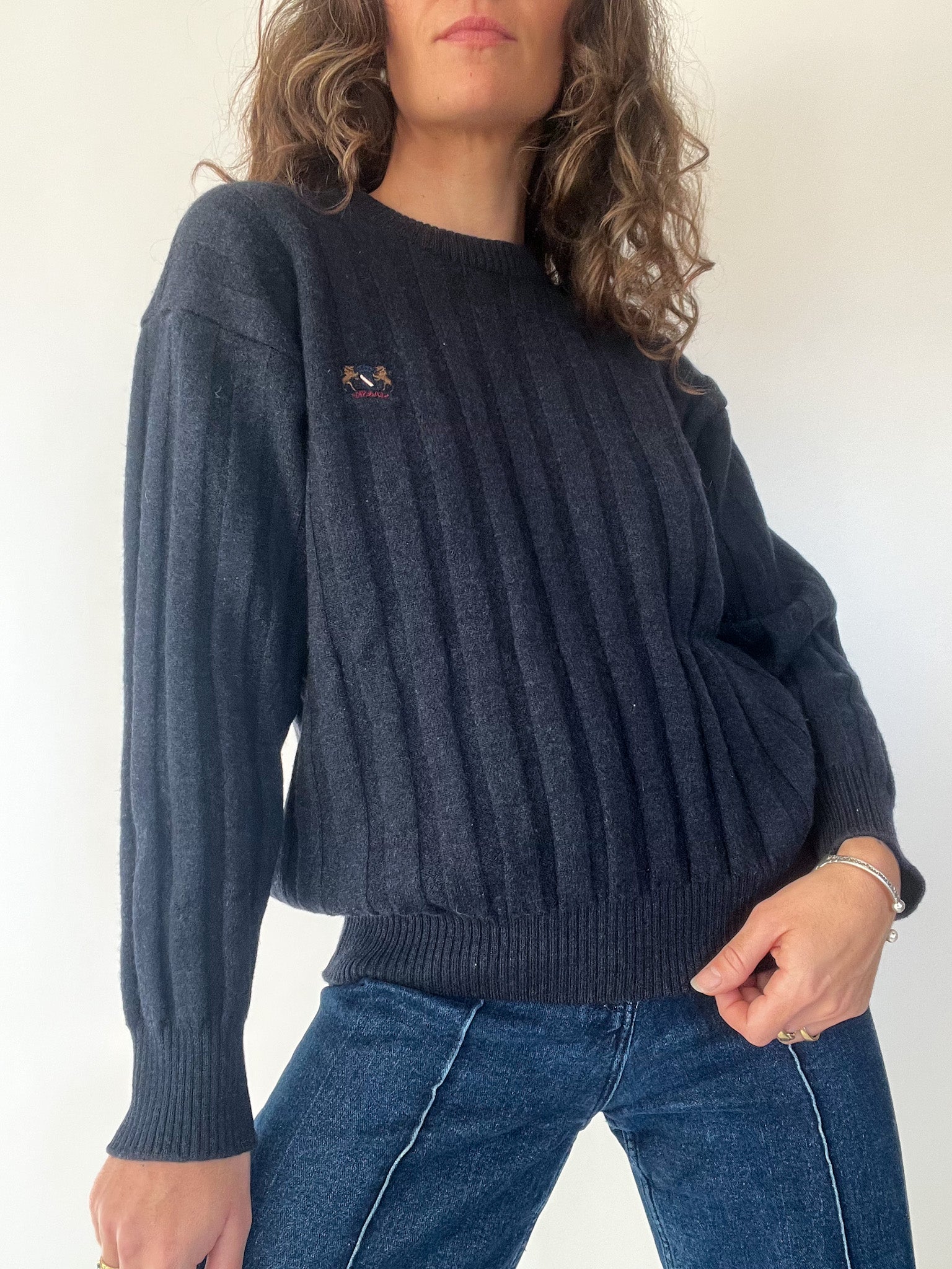 This timeless pullover features a navy blue color with elegant vertical ribbing, creating a flattering silhouette. A subtle embroidered crest on the chest adds a touch of vintage charm and sophistication.