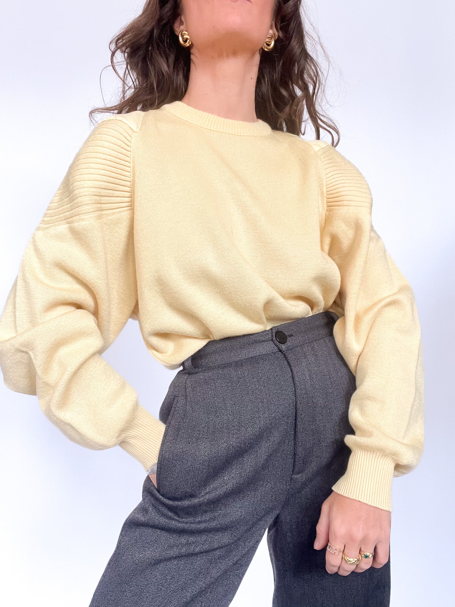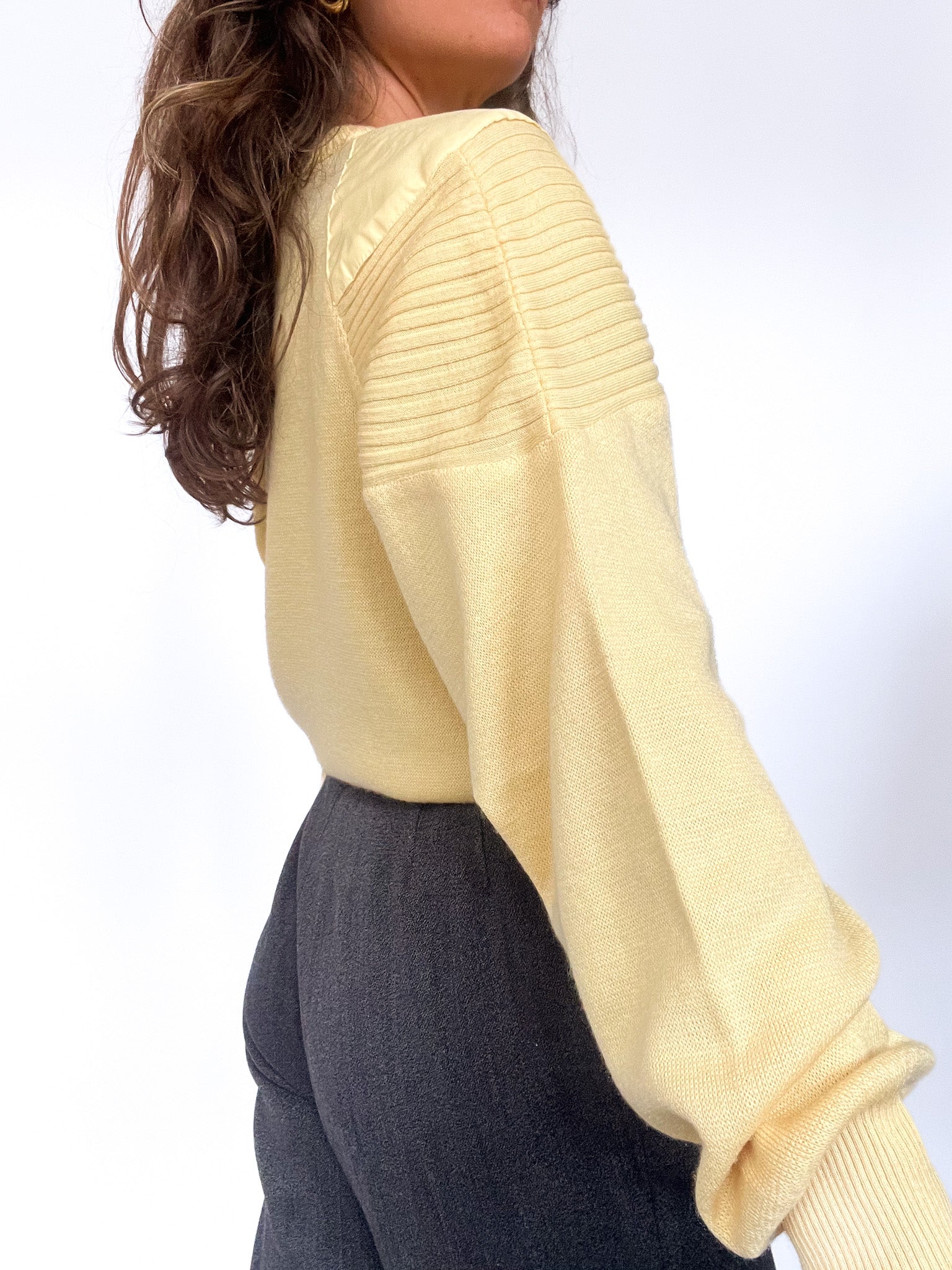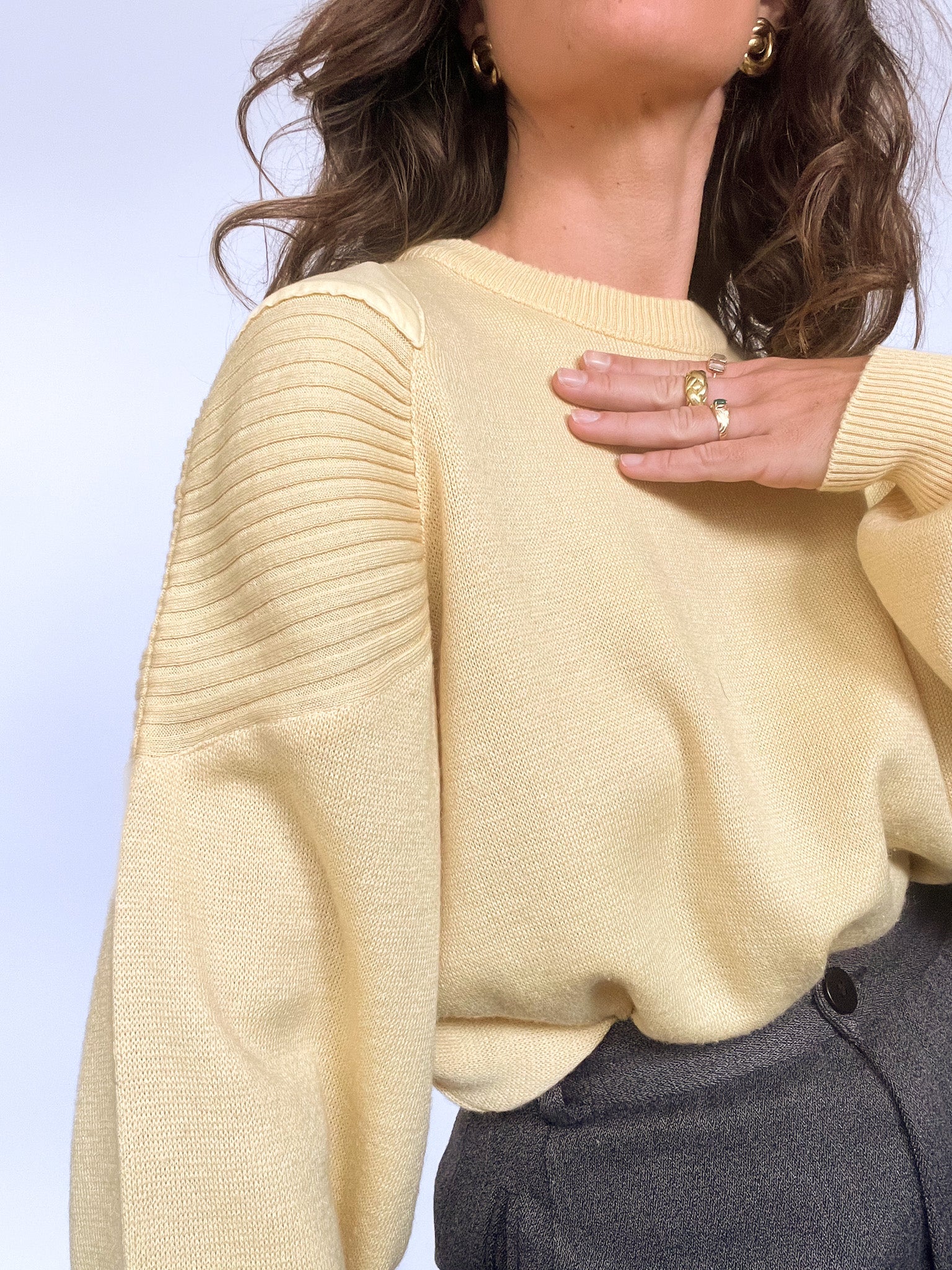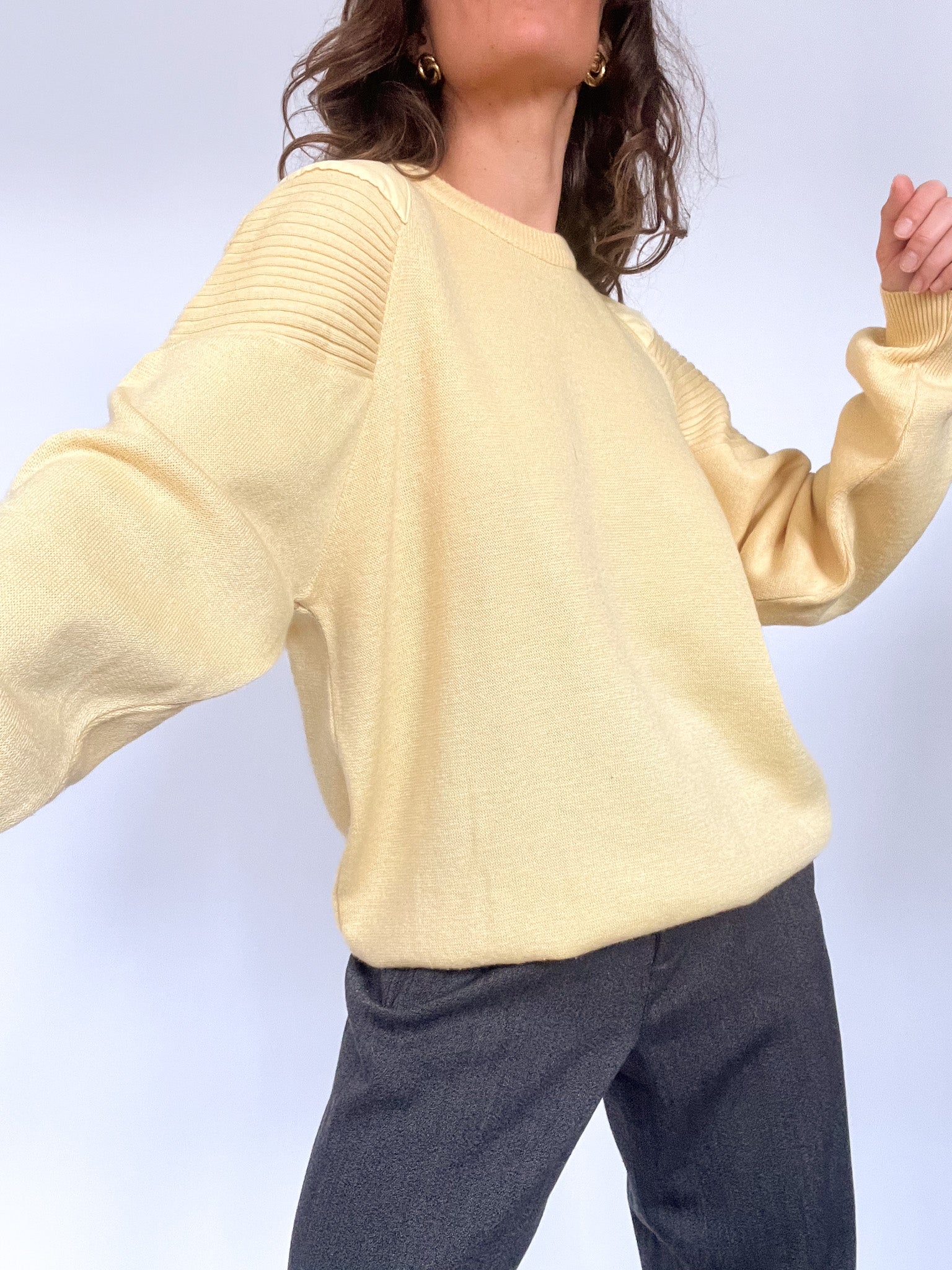 A refined vintage pullover in a soft pale yellow shade, designed with structured details for an elevated yet relaxed aesthetic. The ribbed shoulder accents and subtle sheen give it a unique and elegant touch.