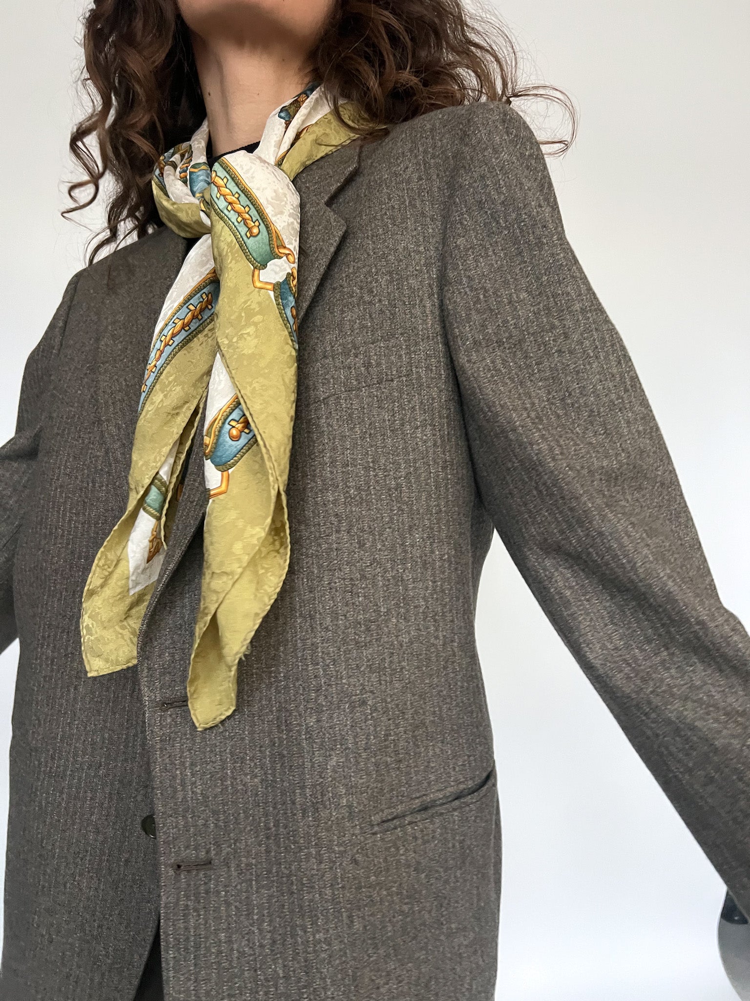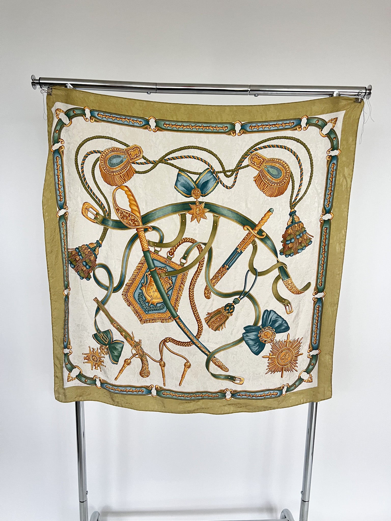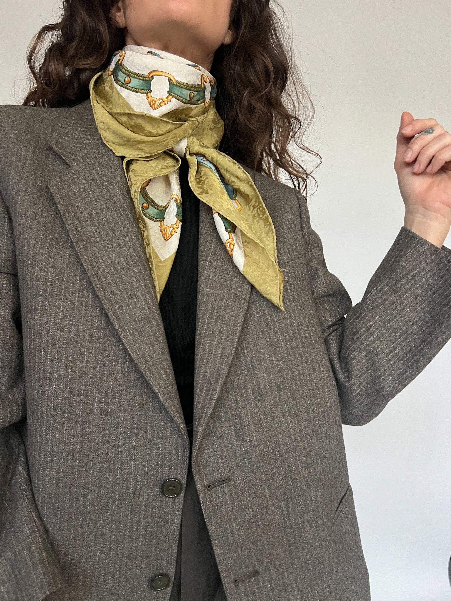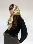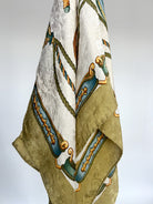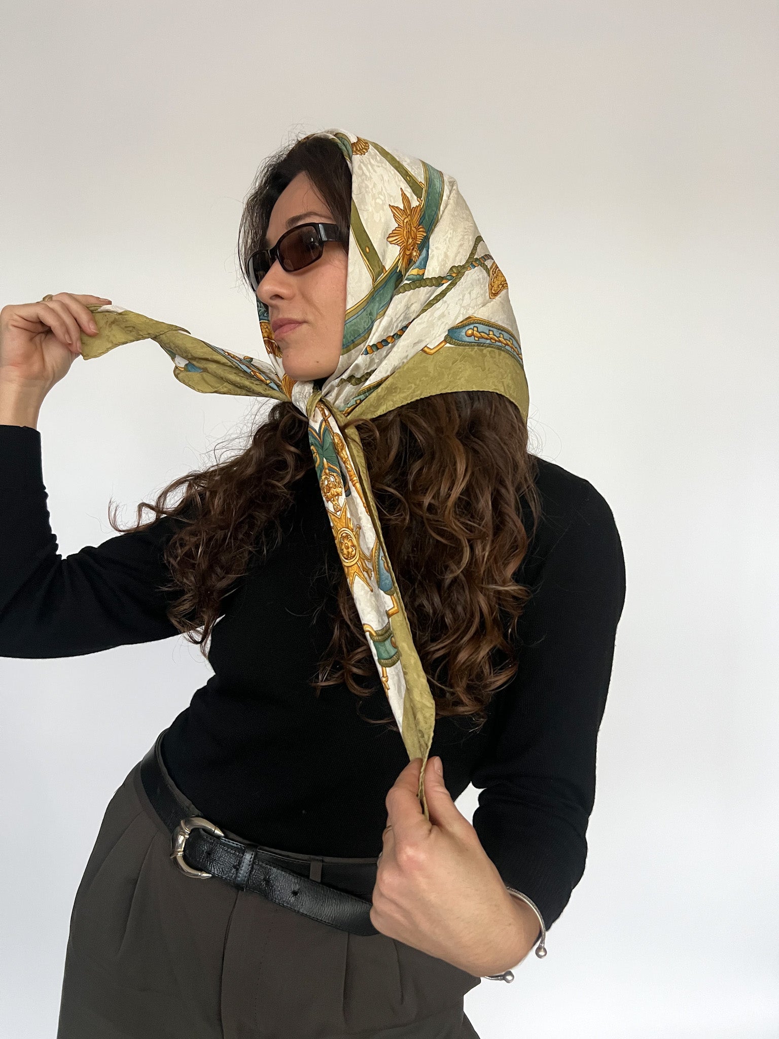 A refined pure silk scarf featuring a beautifully balanced palette of khaki, cream and turquoise with intricate ornamental detailing. Selected for its soft luminosity and sophisticated equestrian inspired motifs, it embodies the authentic elegance and expressive character that define the Skorpiones Vintage universe. The silk is lightweight with a subtle sheen, offering a fluid drape that styles effortlessly whether wrapped around the neck, tied over the head or added to a bag for a touch of refined individuality. A timeless accessory that elevates winter looks with ease and distinction.