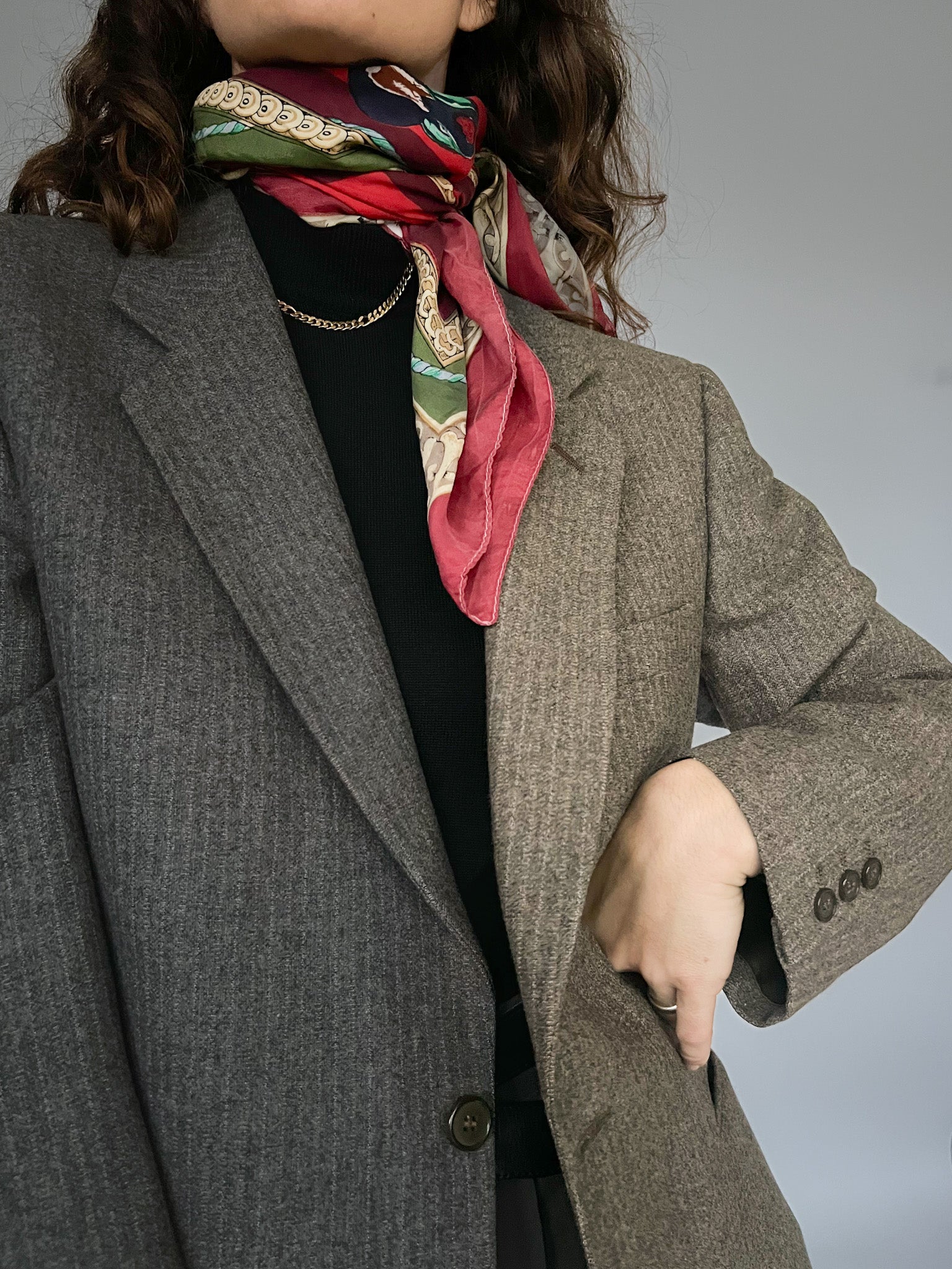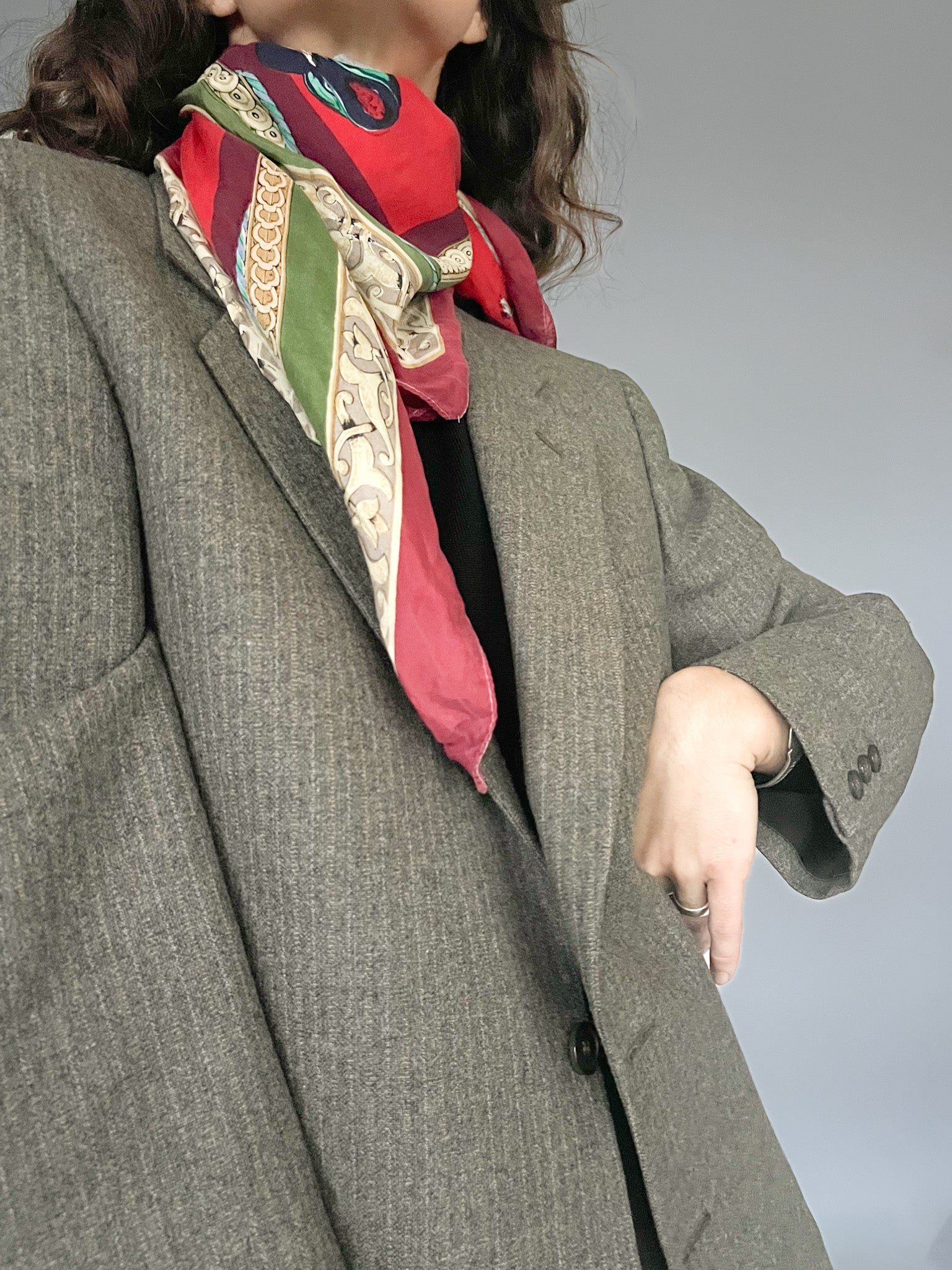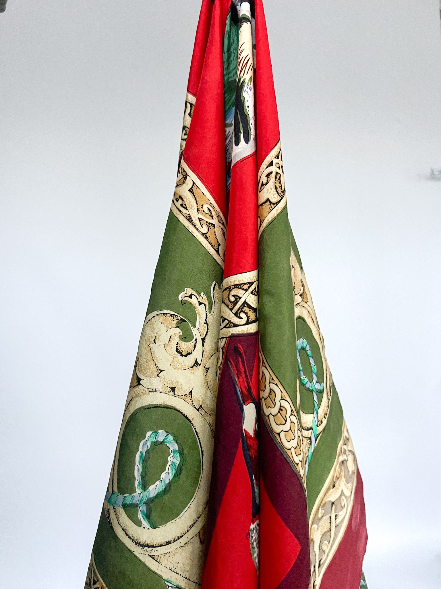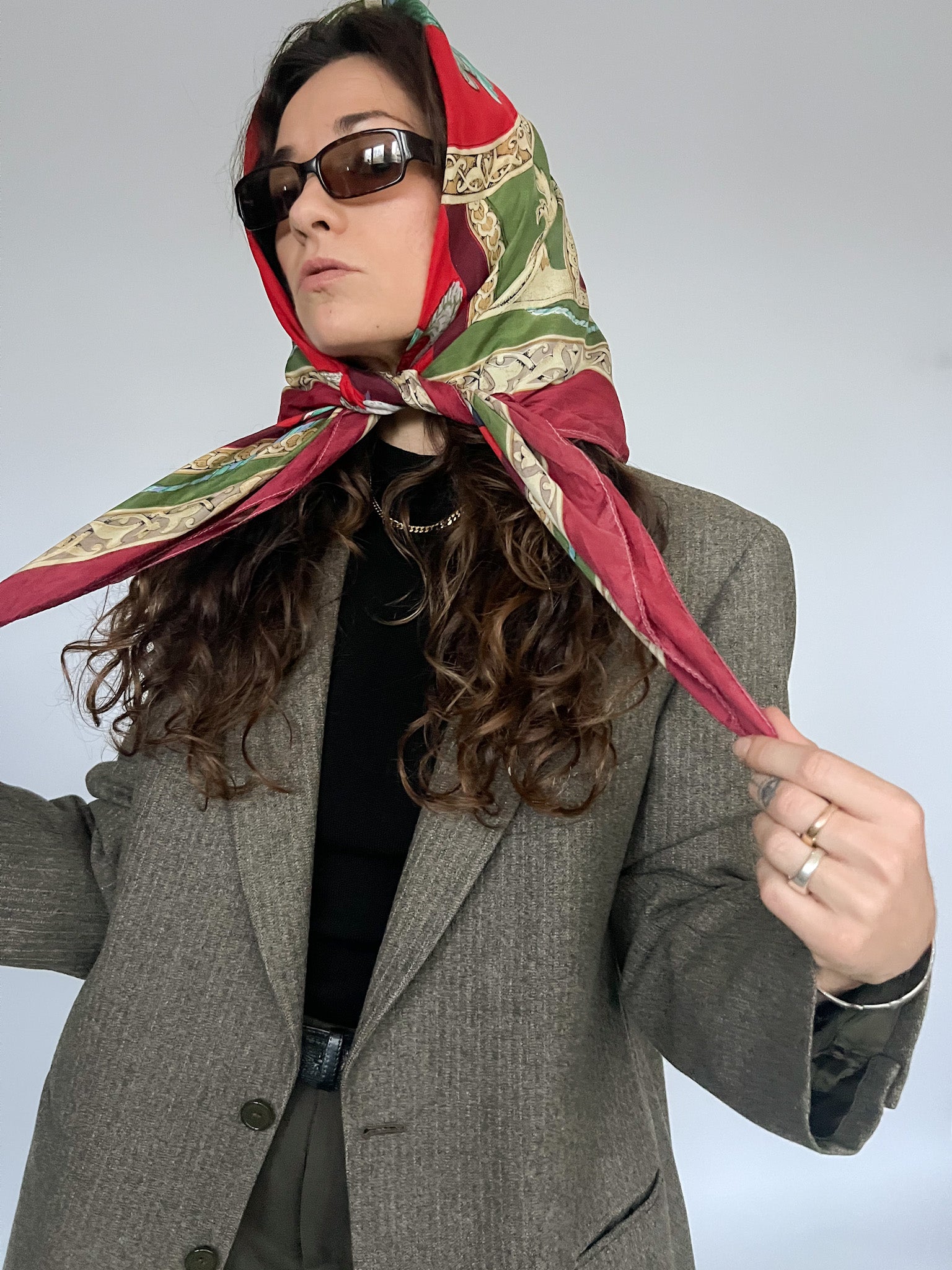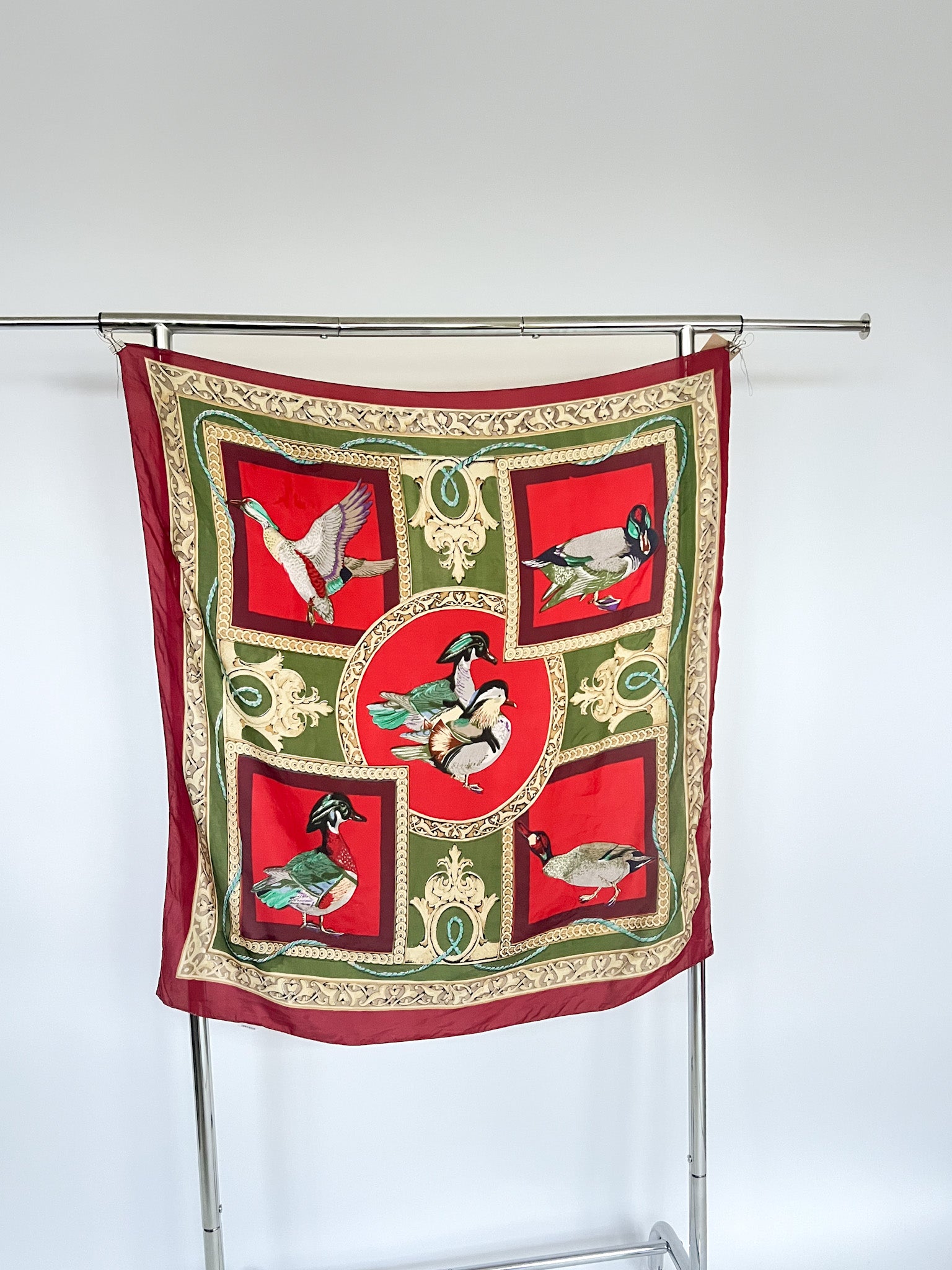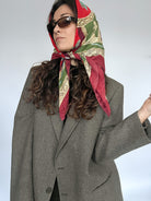 A stunning pure silk scarf featuring an intricate duck motif framed by rich Bordeaux red and deep khaki tones. Chosen for its luxurious colour palette and expressive design, this piece carries that unmistakable Skorpiones Vintage energy where elegance meets personality. The silk has a soft fluid drape that moves beautifully whether styled around the neck, tied over the head or wrapped on a bag for a touch of refined character. A timeless winter companion that adds warmth, artistry and individuality to every look.