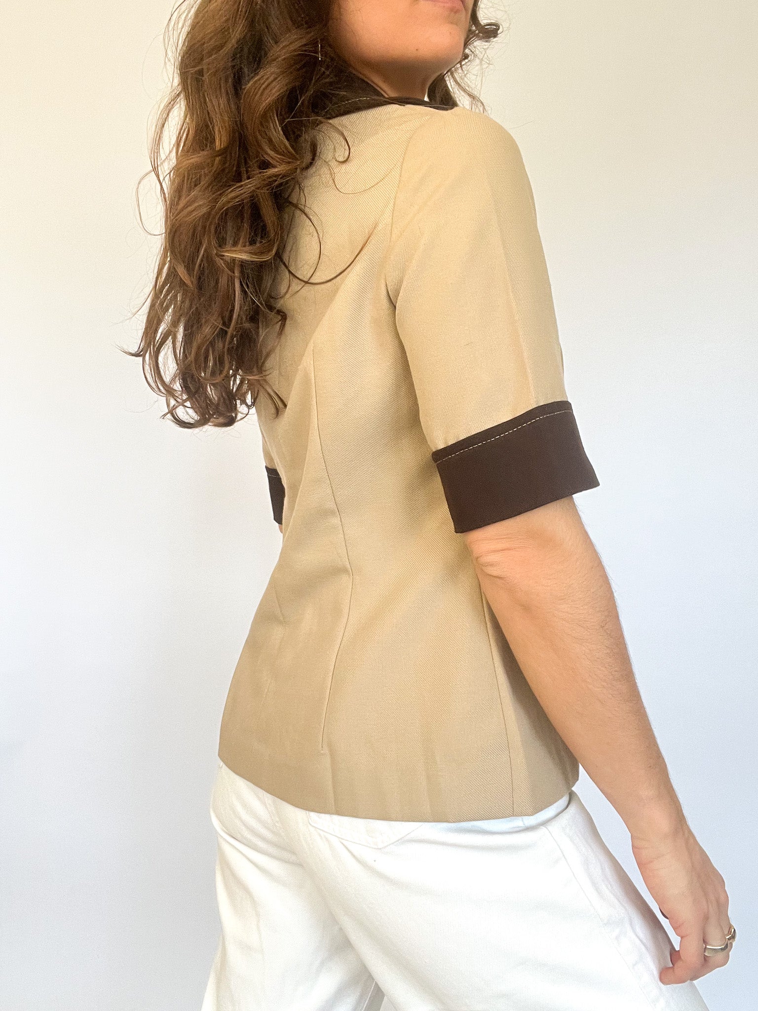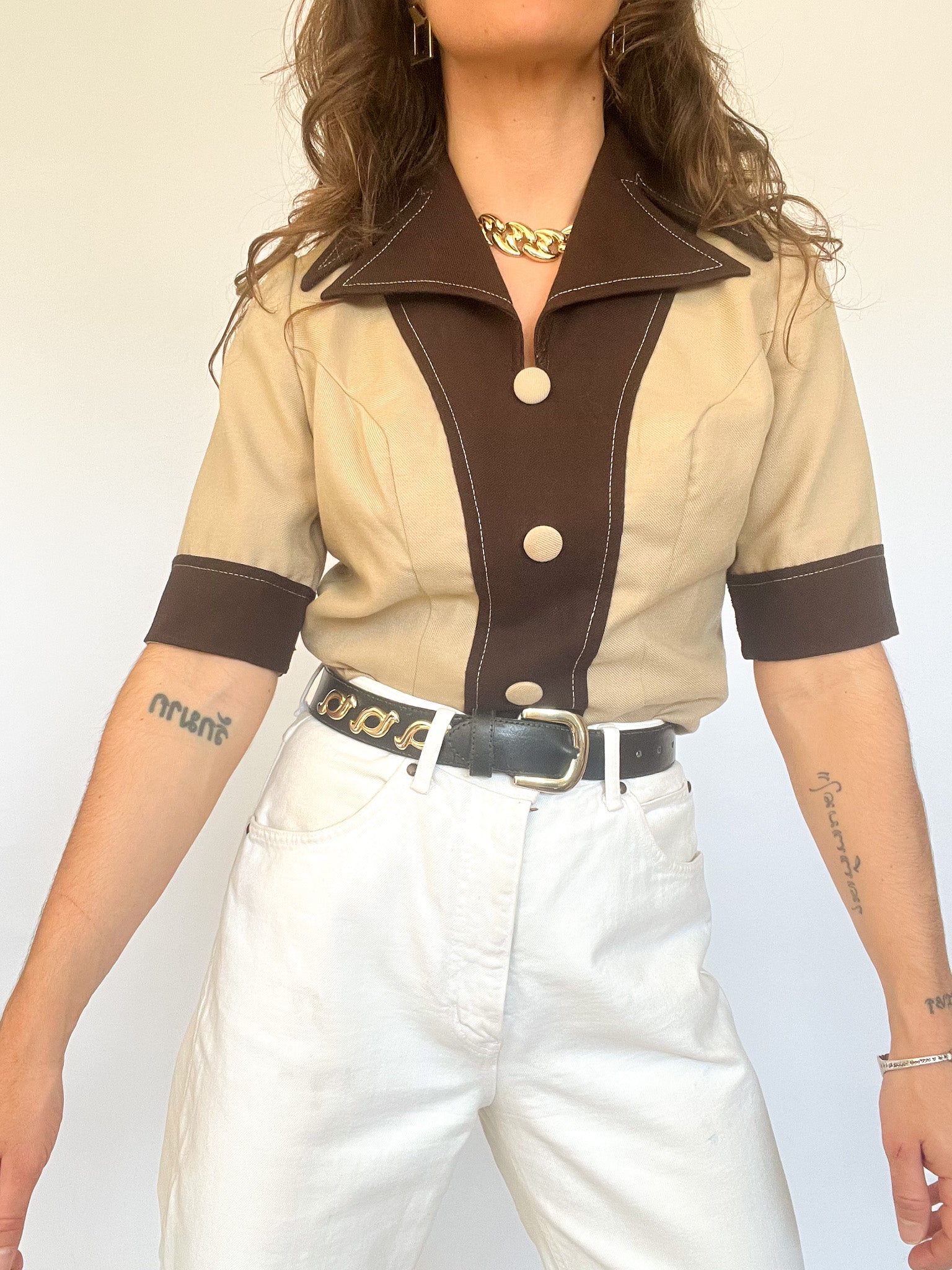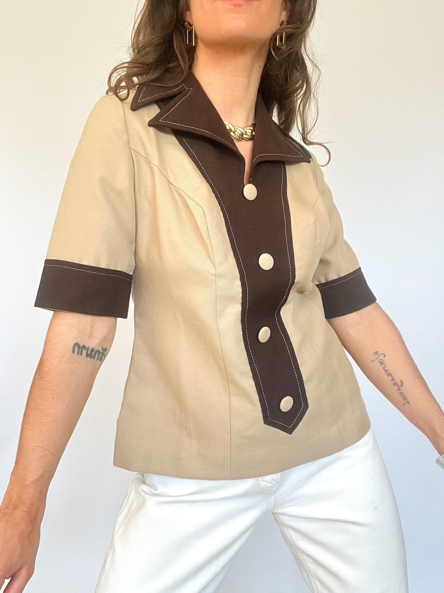 A rare find with couture-like flair, this hand-sewn piece is a visual standout. Crafted with precision, it mixes beige and deep chocolate brown panels with oversized buttons and contrast stitching. The fitted silhouette and structured fabric give it a strong, sculptural presence—a top for those who love fashion with personality.