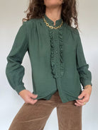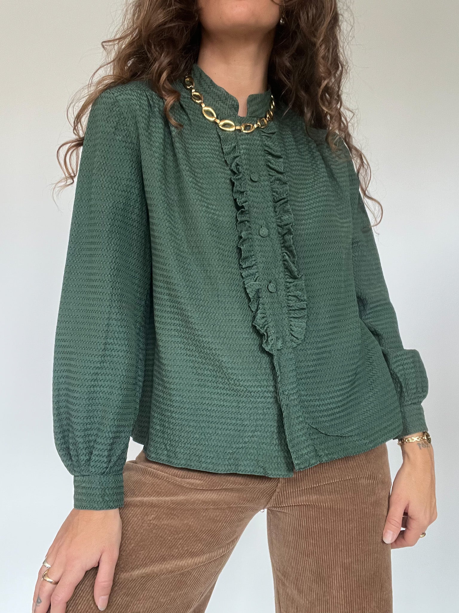 A delicate treasure from the 80’s, entirely handmade with care and character. This emerald green blouse stands out with its textured woven fabric and romantic ruffle detailing along the button placket. The high collar and fabric-covered buttons add that refined, almost couture touch typical of the era’s elegant craftsmanship.