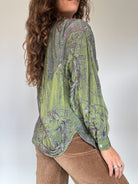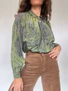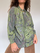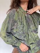 Straight out of the bold Italian 80’s aesthetic, this lightweight viscose blouse is statement on its own. The flowing fabric catches the light beautifully, revealing shades of olive and sage green layered with intricate paisley and abstract motifs in purple tones. Its slightly oversized cut and soft drape embody the effortless elegance of the era — that mix of opulence and ease Italian fashion mastered so well.