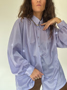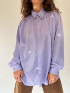 An eye-catching piece from the 80’s that perfectly captures the decade’s love for soft shine and volume. This lilac blouse features a subtle striped satin texture that reflects the light beautifully, giving it a luxurious yet playful feel. The gathered shoulders and wide cuffs add a touch of drama, while the loose, fluid cut keeps it effortlessly wearable. A statement piece that balances femininity and confidence — perfect tucked into high-waisted trousers or worn loose for a relaxed, elegant look.
