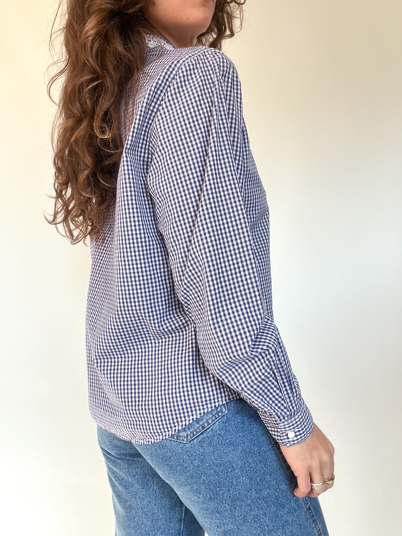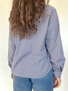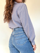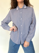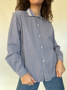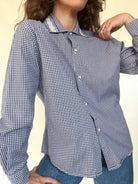 This Italian-made gingham shirt captures the essence of vintage sophistication with a subtle twist. Crafted in soft cotton, it features a delicate embroidered collar detail that contrasts beautifully with its navy check pattern. A piece that embodies timeless charm and the confident femininity at the heart of Skorpiones Vintage — effortless, poised, and unique.
