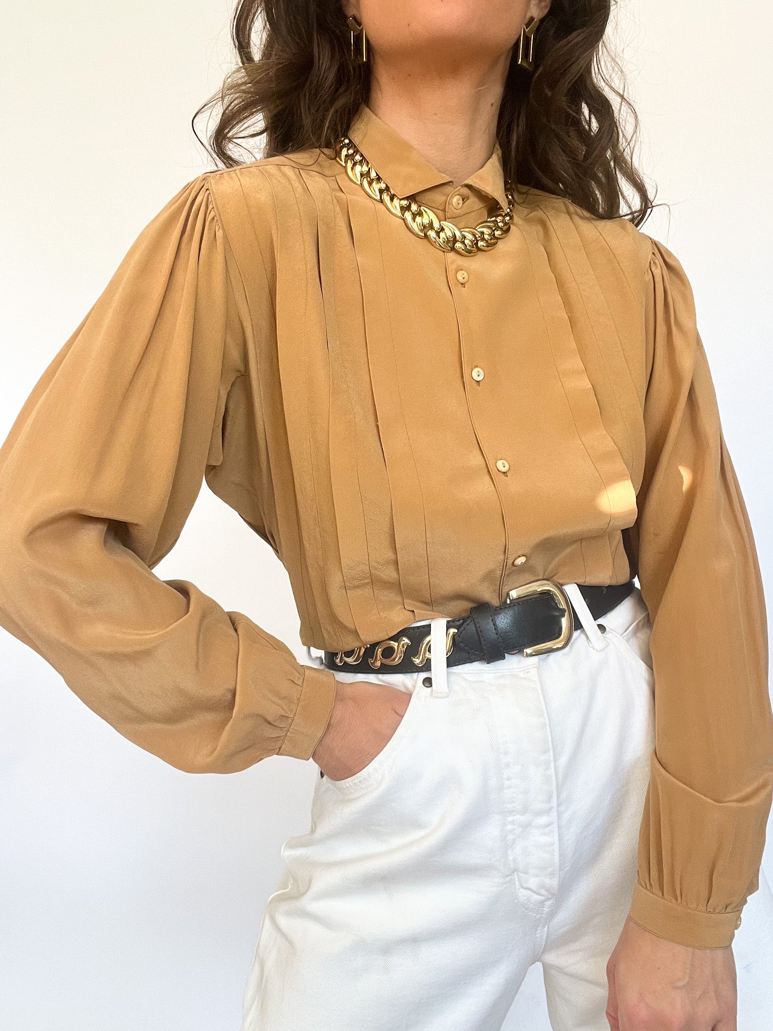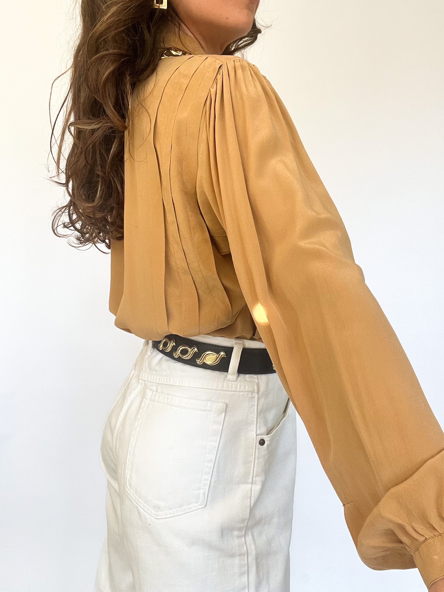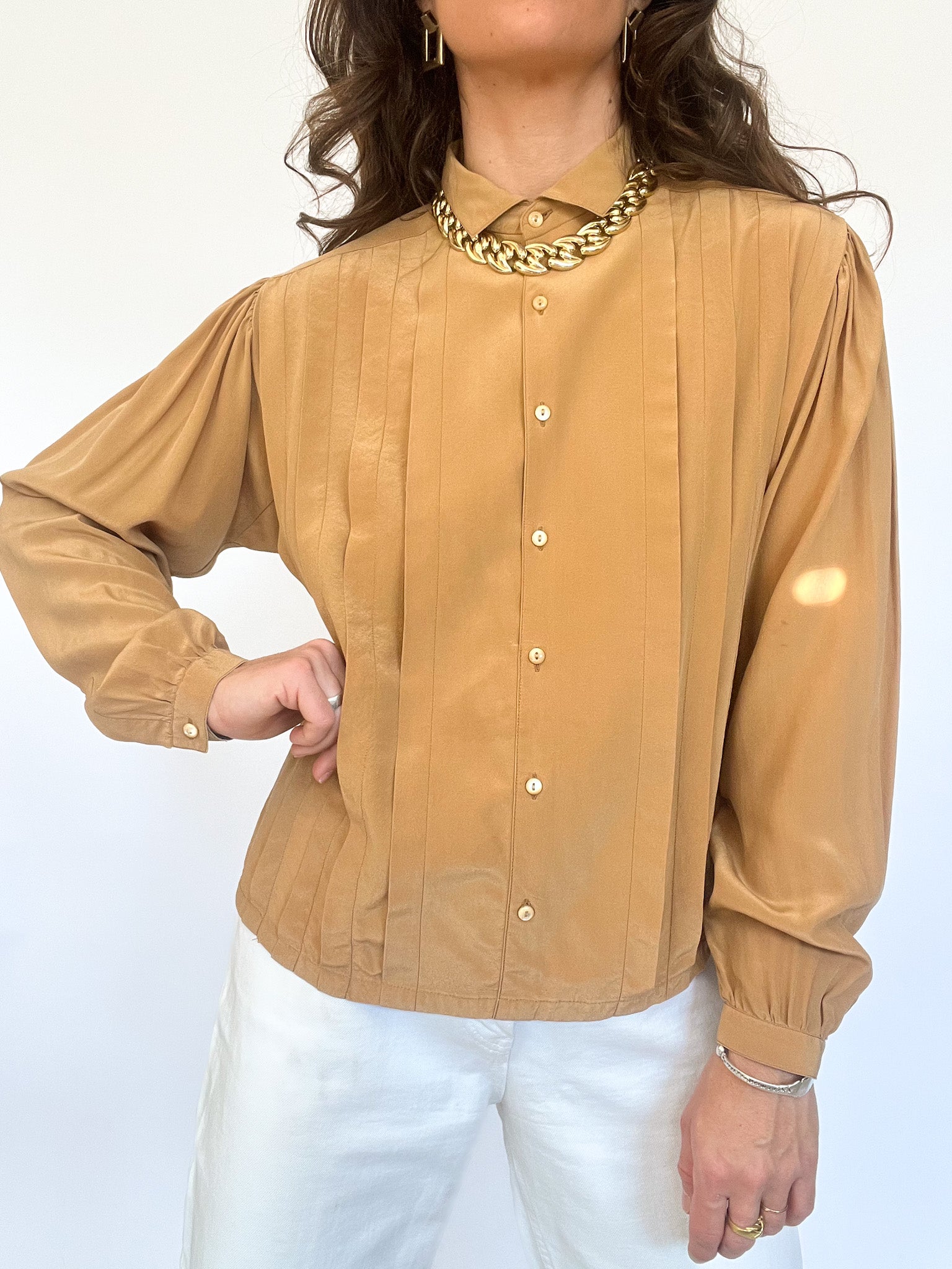 Made in Italy, this 80s silk blouse in a rich caramel tone is all about elevated softness. The vertical pleats bring movement and depth, while the fluid texture of silk embodies quiet luxury. It’s a refined piece that mirrors the values of Skorpiones Vintage — timeless, noble, and subtly iconic.