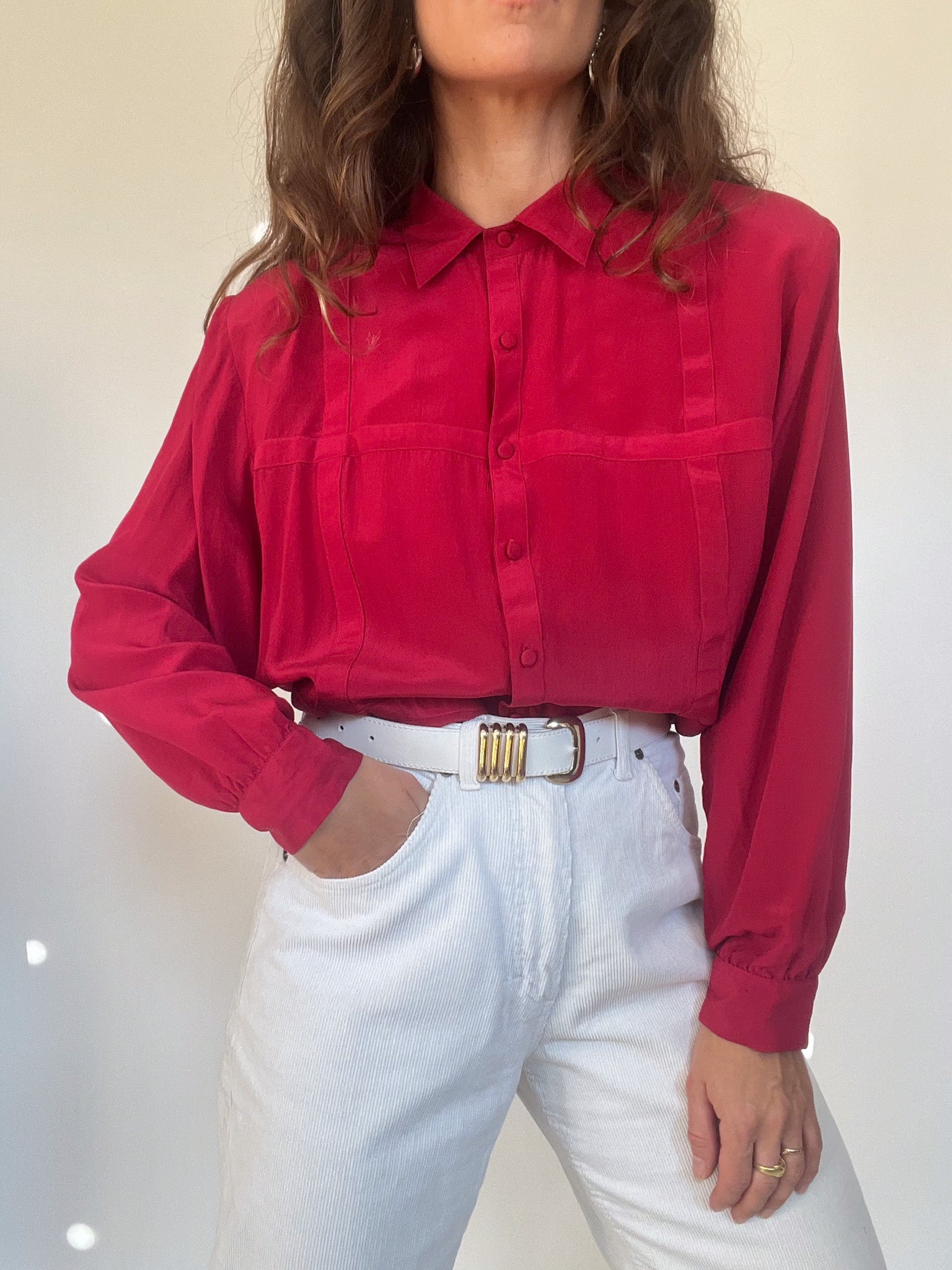 With its bold red hue and structured seam details, this blouse is a true statement piece. Its luxurious silk fabric enhances the richness of color while the panel-style seams elevate its sharp yet feminine look. A piece that speaks to individuality and power, embodying the Skorpiones Vintage aesthetic.
