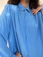 Elegant and effortlessly feminine, this 80’s sky blue blouse brings a soft sophistication to any look. The fluid drape and subtle sheen of the fabric create a refined silhouette, balanced by structured cuffs and gathered shoulders. A timeless staple that embodies Skorpiones Vintage’s vision of powerful yet understated style — where grace meets confidence.
