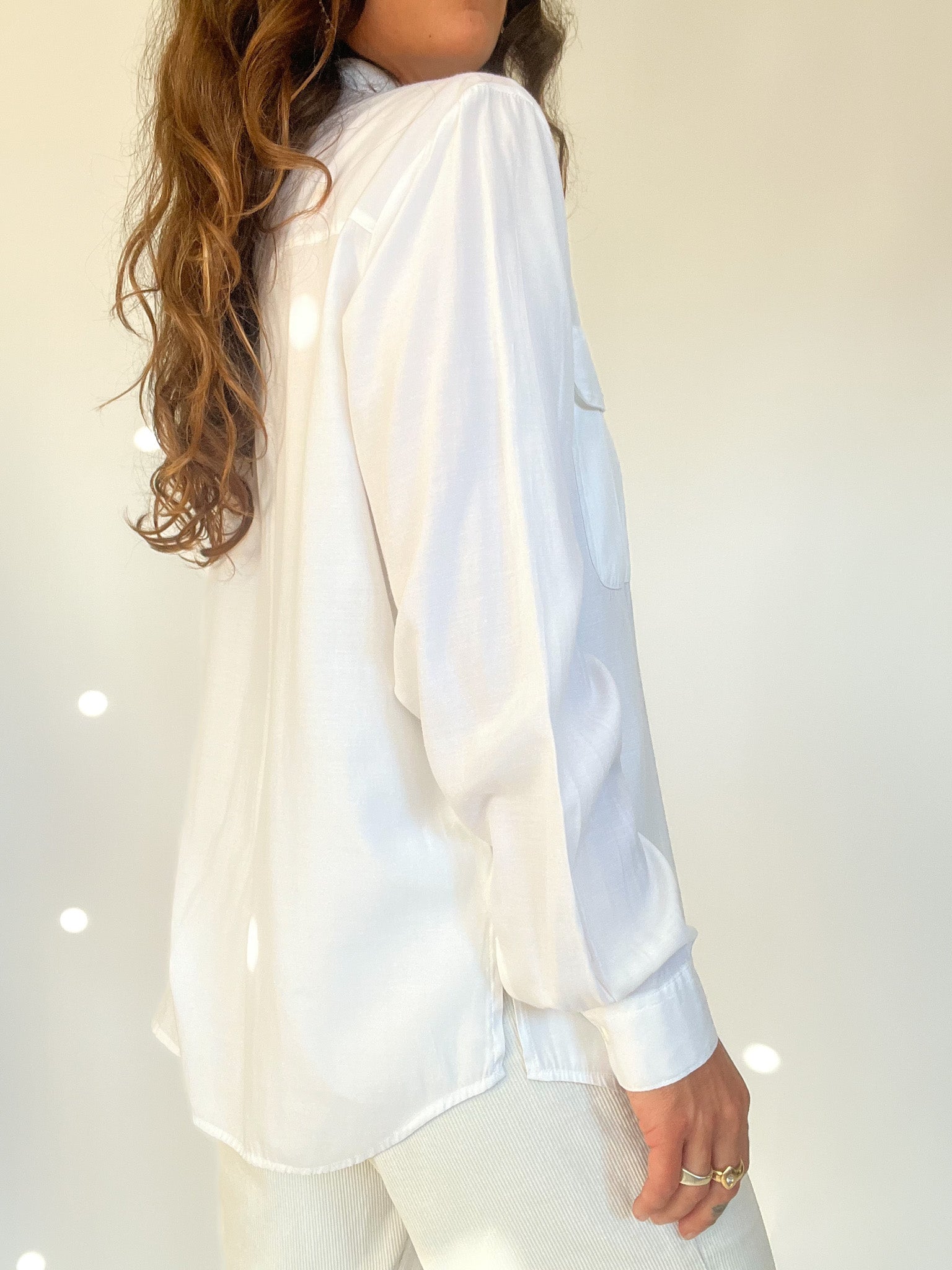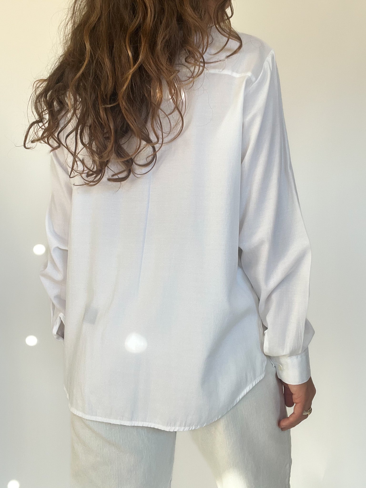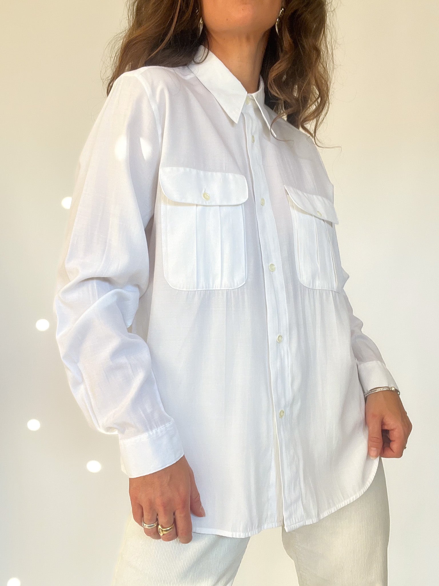 A timeless vintage white shirt with a structured design and oversized utility-style chest pockets. Its clean lines and sharp tailoring make it a versatile piece, perfect to pair with denim for a casual look or tailored trousers for an elevated touch. This piece reflects the Skorpiones Vintage ethos: unique, authentic, and effortlessly empowering, offering a fresh alternative to fast fashion staples.