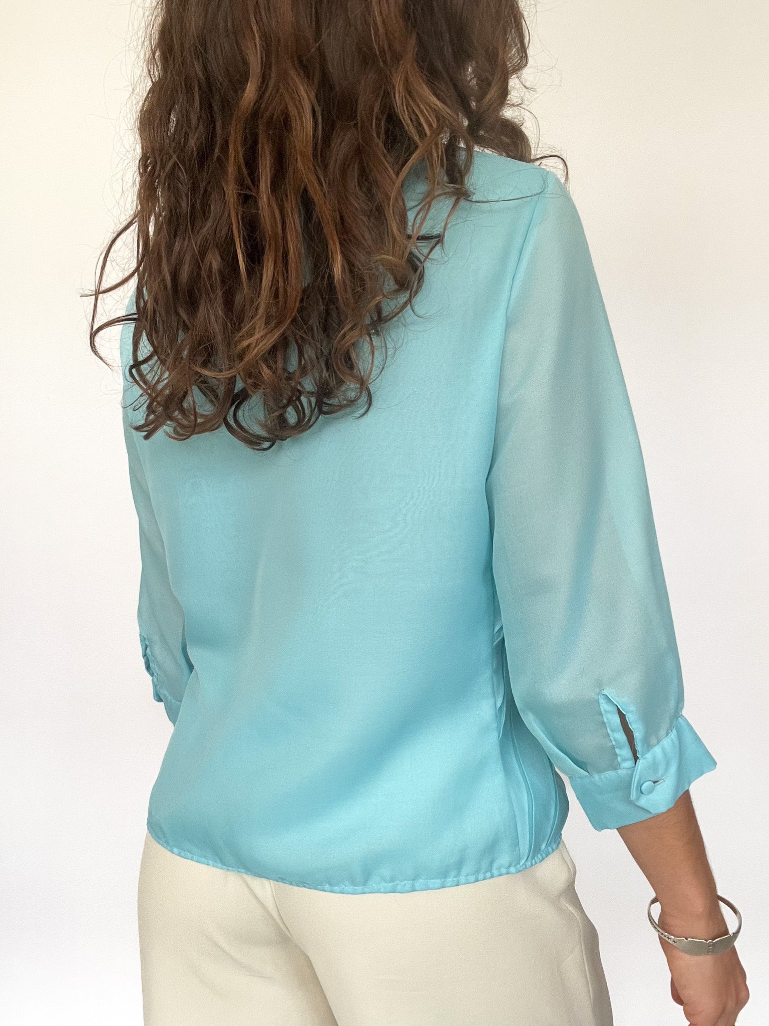 This dreamy piece in aqua blue is all about softness and structure. The vertical wave-like pattern adds texture and depth, while the sheer sleeves bring lightness and elegance. Decorative covered buttons with mini floral motifs elevate this blouse to a true vintage gem — delicate, feminine, and unmistakably unique.
