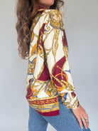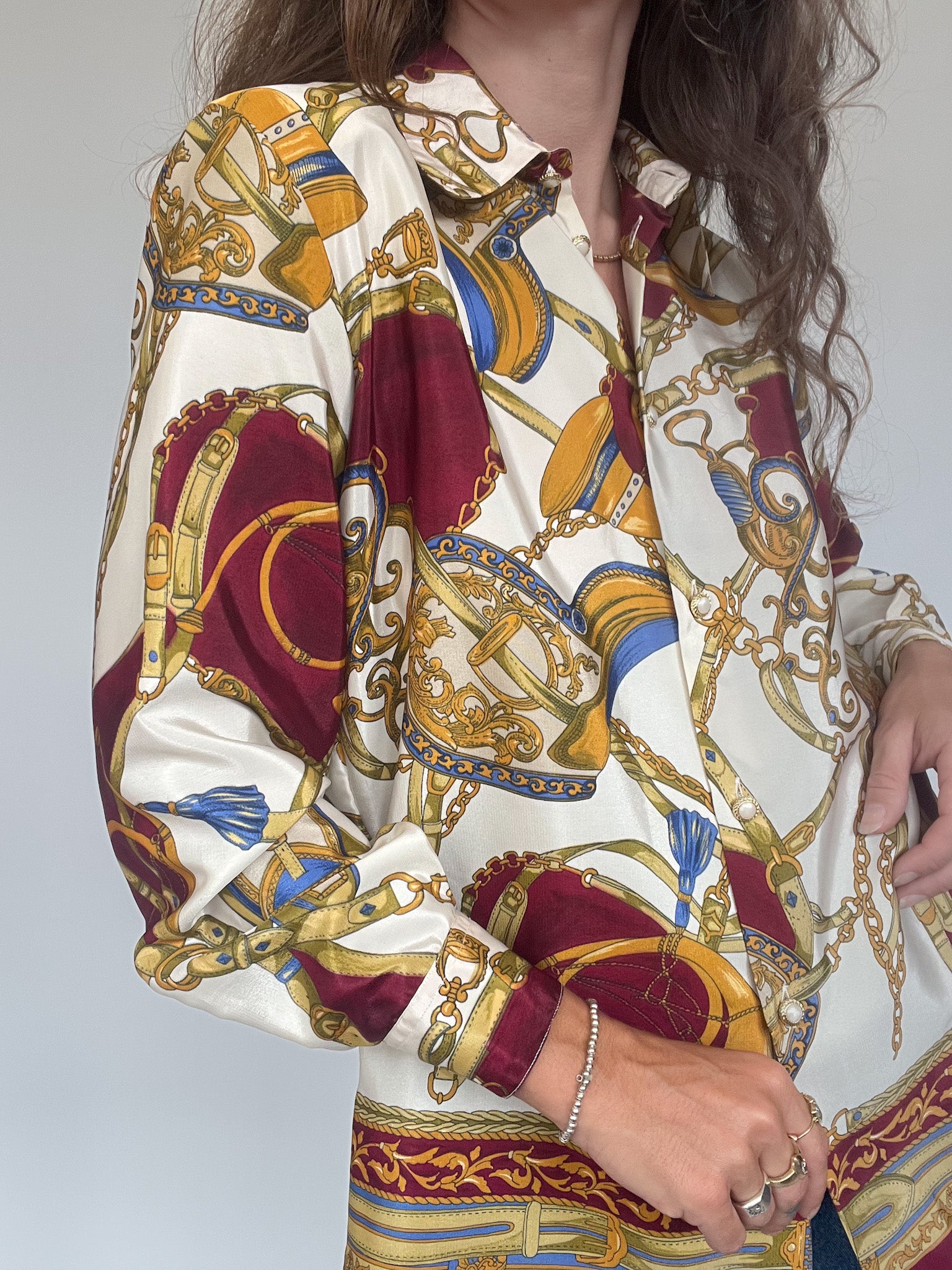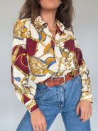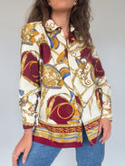 This stunning vintage shirt is a bold statement piece, featuring an opulent baroque-inspired print in rich burgundy, gold, and blue tones on a cream base. Crafted in Italy from soft viscose, it embodies the elegance and confidence of the 90’s, designed for those who want to stand out with a touch of sophistication. The relaxed fit makes it versatile—wear it tucked into denim for a casual yet striking look, or style it open over a top for effortless layering. A true one-of-a-kind treasure that reflects the exclusivity and timeless spirit of Skorpiones Vintage.
