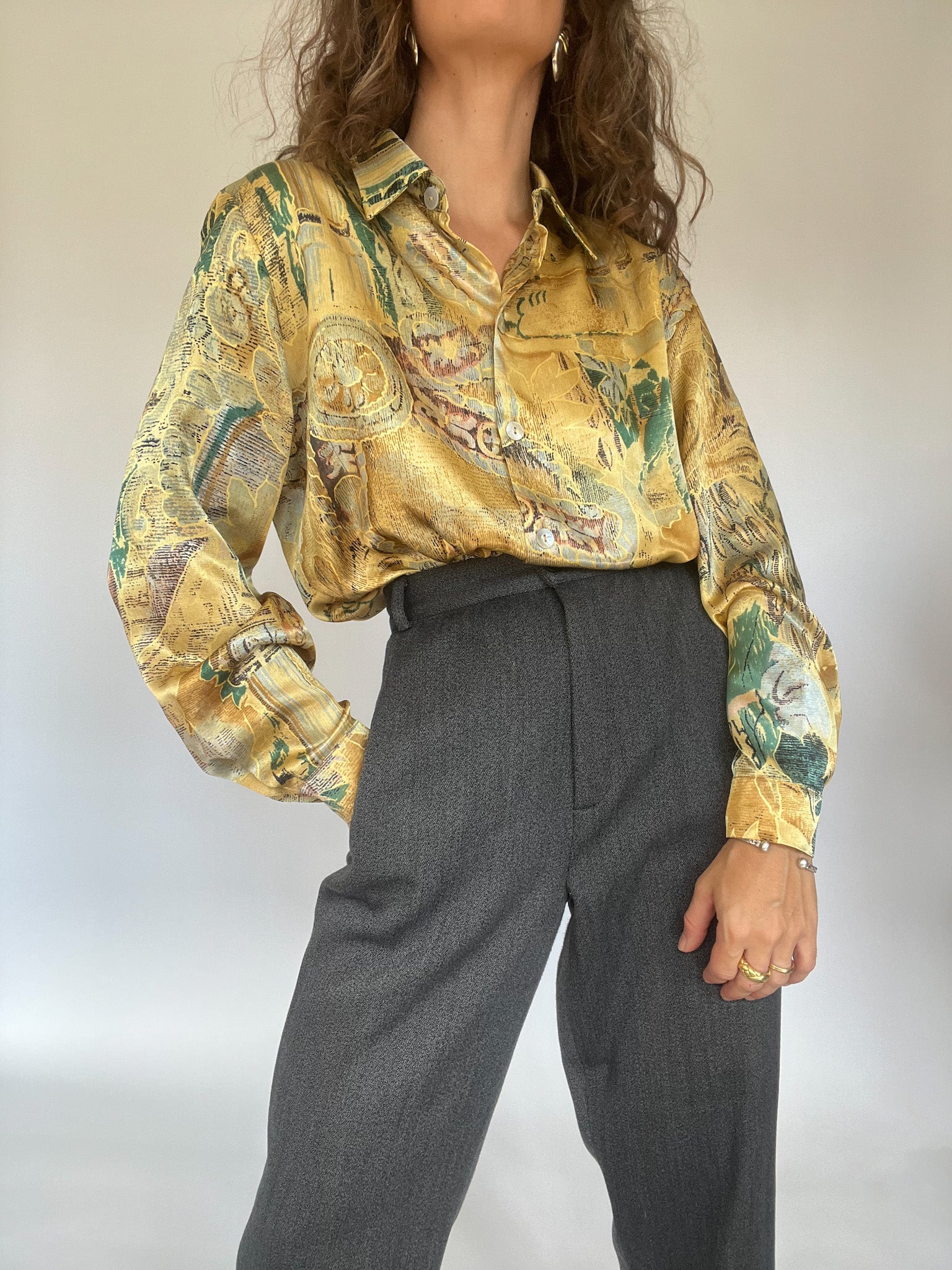 Add a touch of eccentric elegance to your wardrobe with this baroque print satin shirt. Featuring golden tones and lush details, it captures the essence of 90s glamour. Its lightweight, flowing texture offers comfort while giving a sophisticated look. Perfect for a day at the office or an evening out, it can be worn tucked into high-waisted trousers or loose over jeans.