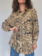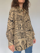 This vintage silk shirt is pure 90’s opulence—an oversized piece designed to stand out. Made from 100% silk, it features an intricate paisley print in golden beige over a deep black base, creating a striking contrast full of character. Its relaxed silhouette offers versatility, perfect to wear loose for a chic oversized look or tucked into high-waisted bottoms for added structure. This shirt embodies the exclusivity and timeless strength that define Skorpiones Vintage: bold, elegant, and unforgettable.
