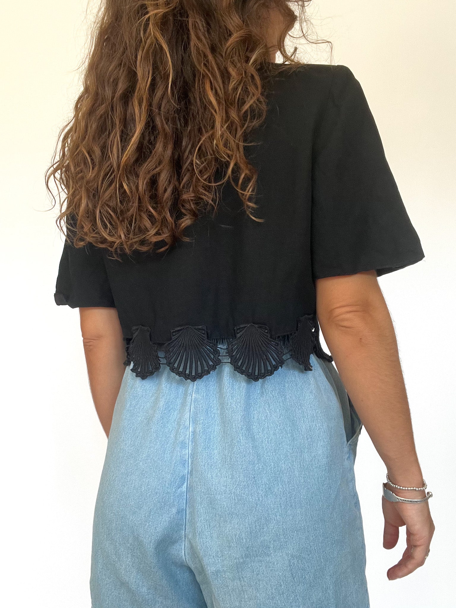 Vintage 90’s Black Linen-Blend Shell Trim Blouse