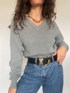 Understated yet full of character, this vintage black V-neck sweater in 100% merino wool embodies quiet confidence. Its refined cable details add subtle texture while keeping the silhouette sleek and timeless. Versatile and effortlessly elegant, it’s a piece that reflects the Skorpiones Vintage ethos — strength and sophistication through simplicity, designed for women who own their style with poise and edge.
