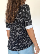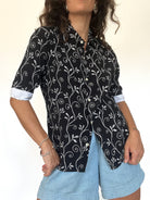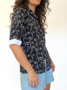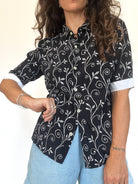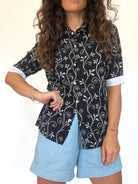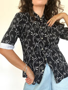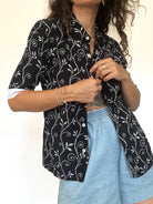 A fresh and timeless 90’s staple, this shirt pairs a crisp botanical print with a versatile silhouette. The black background is adorned with delicate white vine and leaf motifs, creating a refined yet relaxed look. Designed with rolled-up sleeve cuffs and a classic button-down front, it offers easy styling for both casual and elevated outfits. In true Skorpiones Vintage spirit, this piece blends authenticity, quality, and that touch of individuality that makes vintage so special.