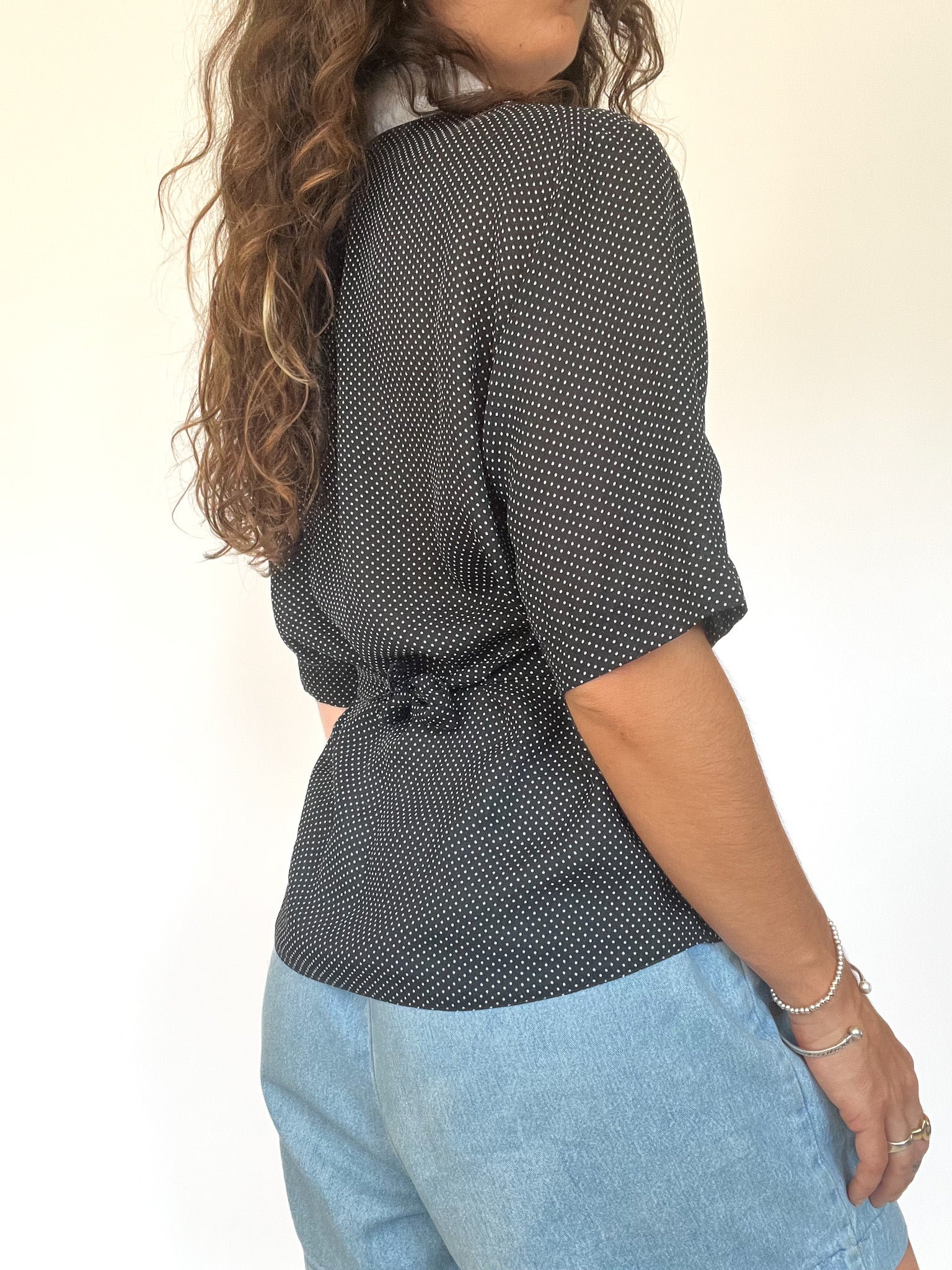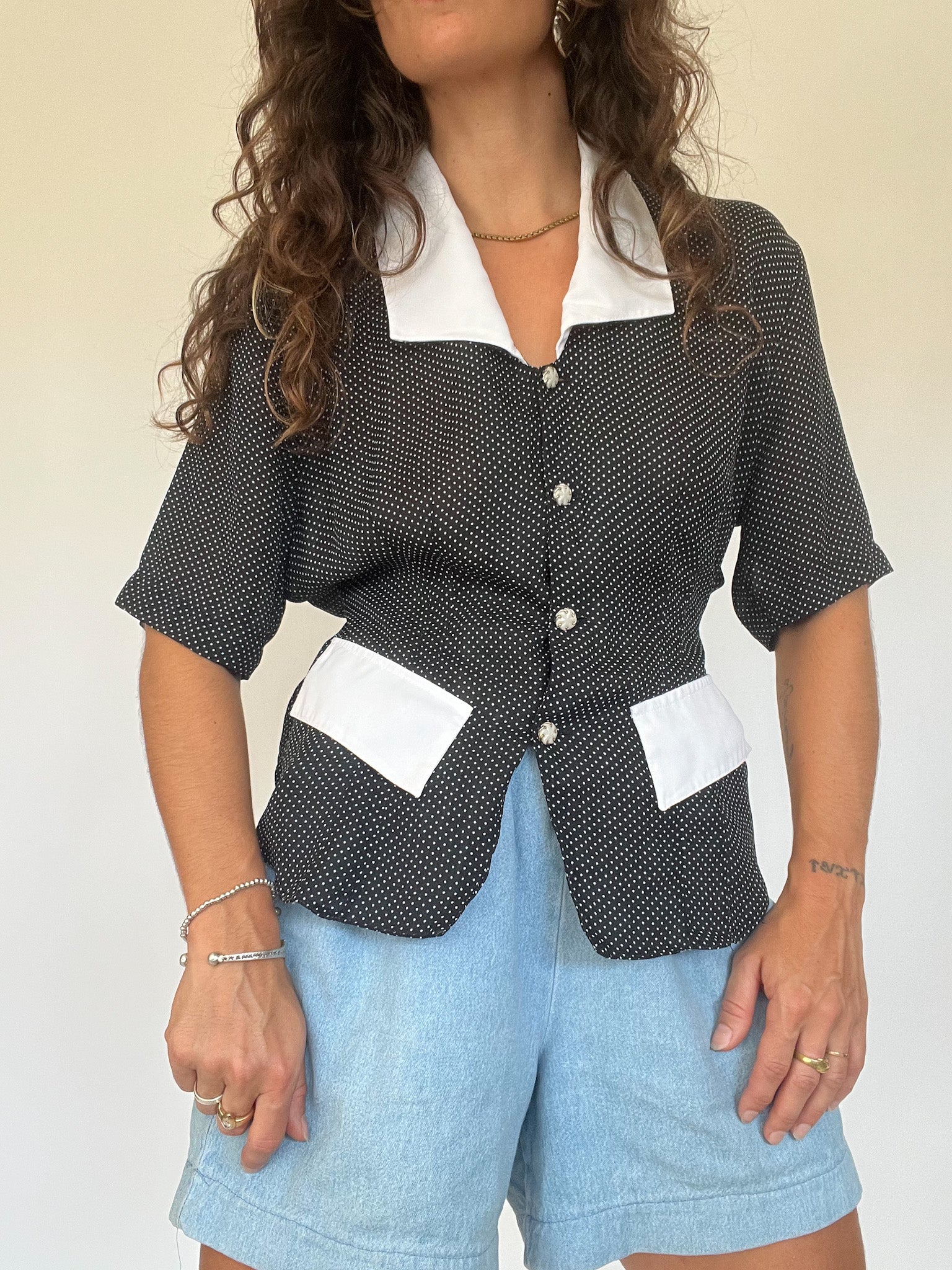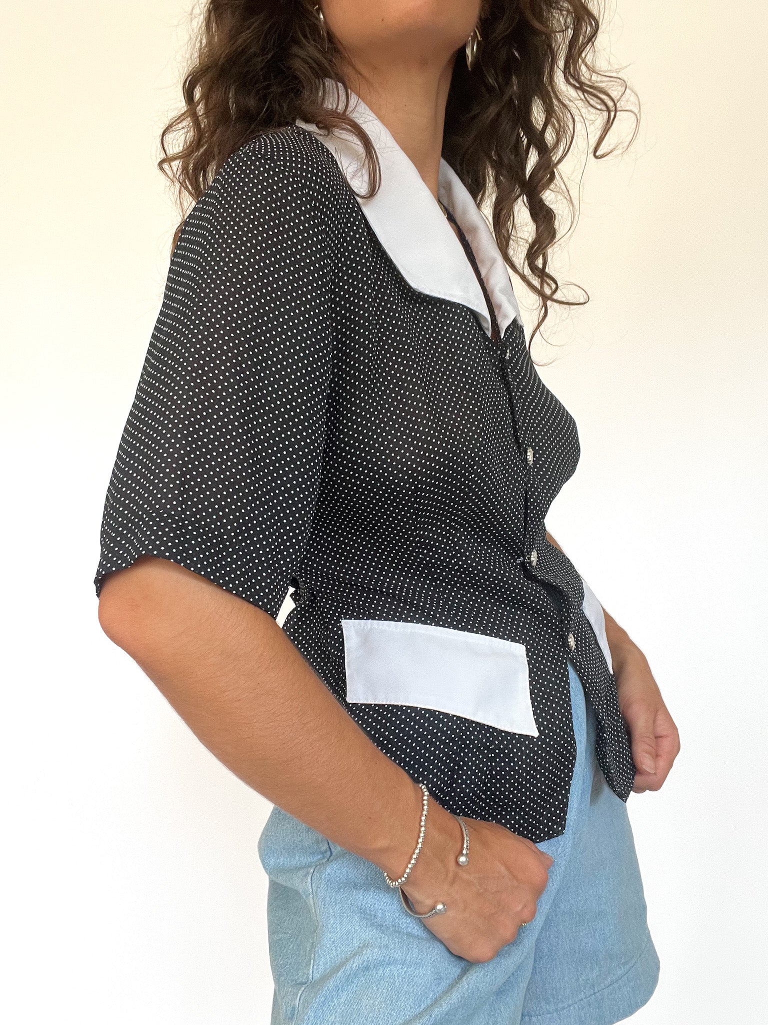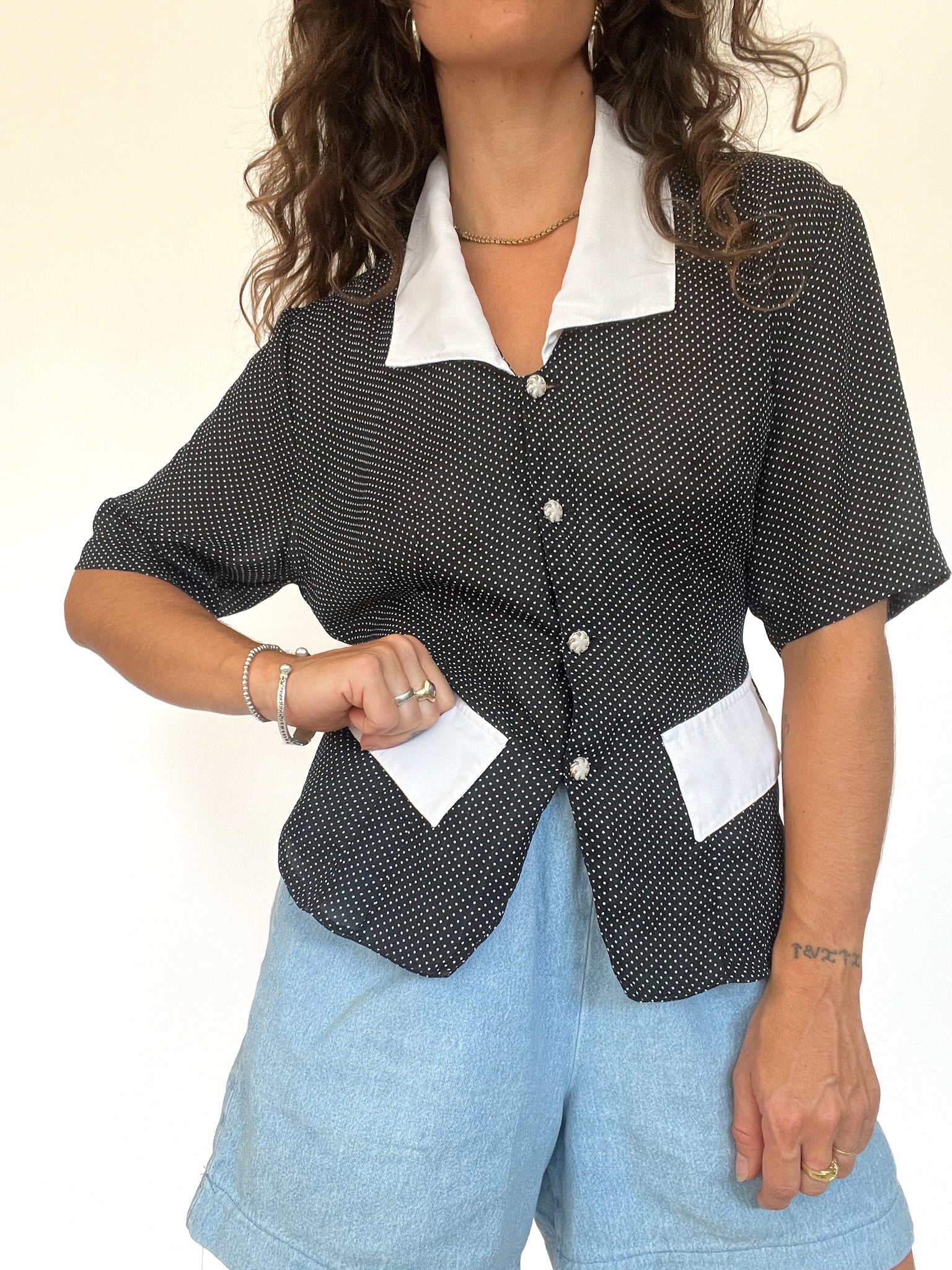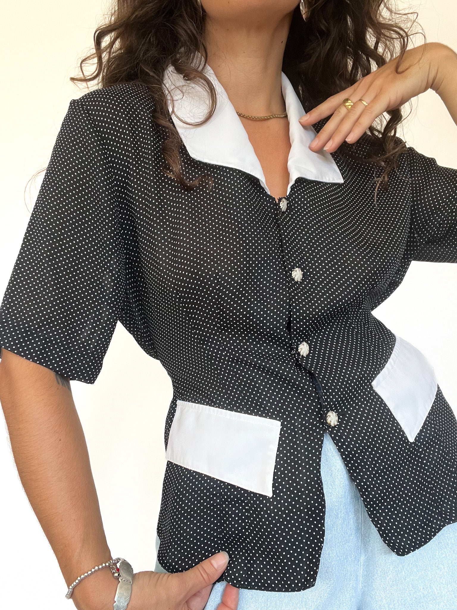 Vintage 90’s Black & White Polka Dot Blouse with Contrast Collar and Pockets