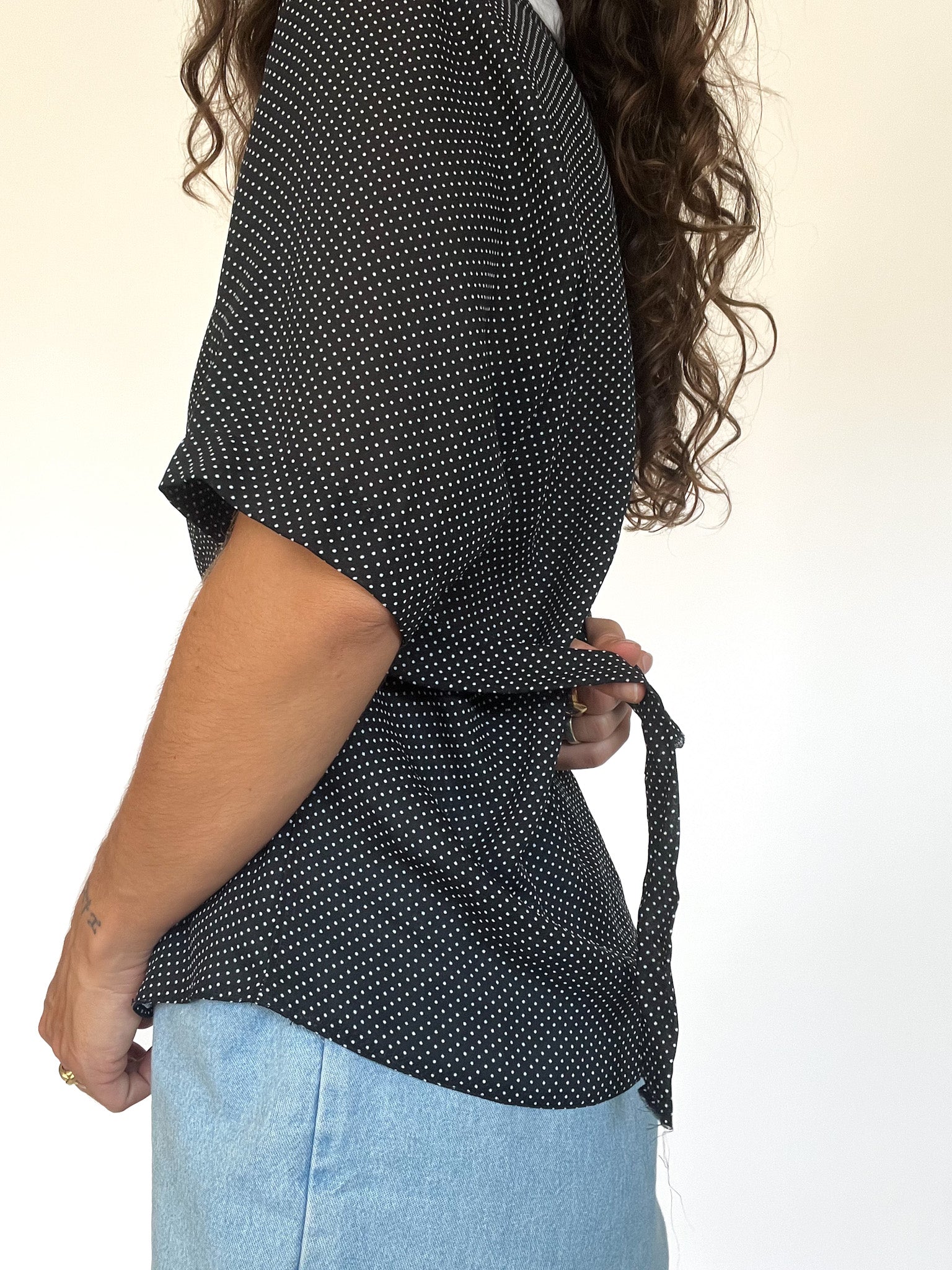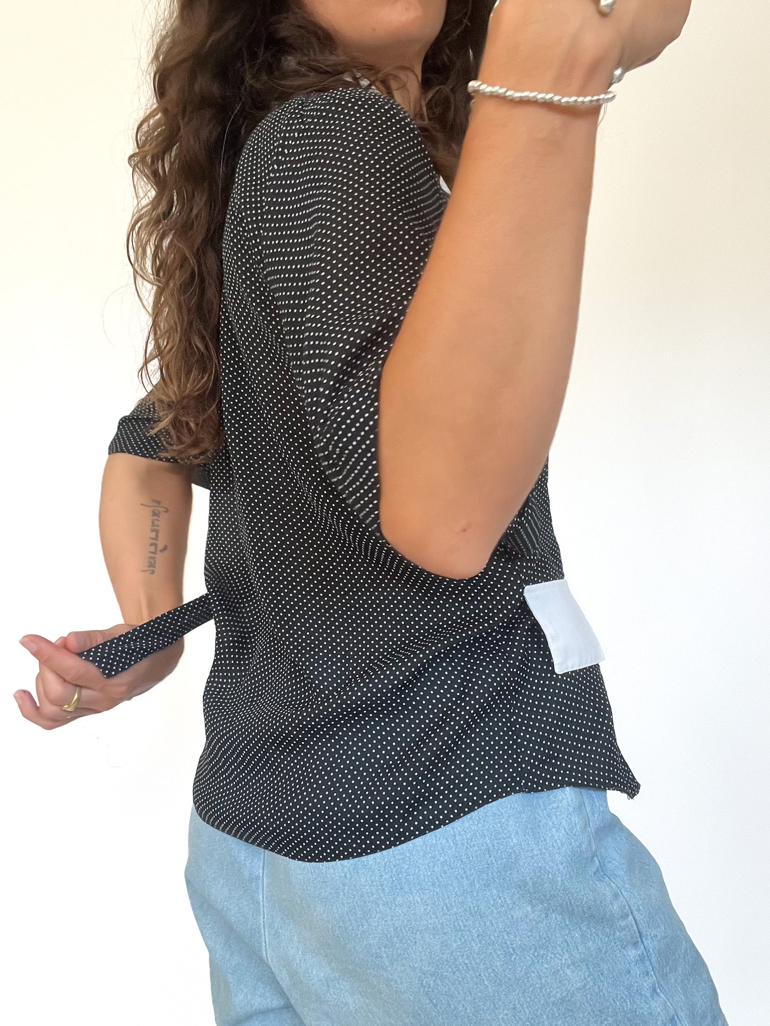 A playful twist on classic tailoring, this 90’s blouse features a delicate black-and-white polka dot print contrasted by a crisp white collar and matching pocket accents. The adjustable waist tie at the back allows for a custom fit, making it flattering whether worn relaxed or cinched. With its short sleeves and lightweight drape, it’s a versatile piece that perfectly embodies the Skorpiones Vintage values of authenticity, exclusivity, and effortless style. Ideal for pairing with denim for casual charm or a pencil skirt for a retro-inspired work look.