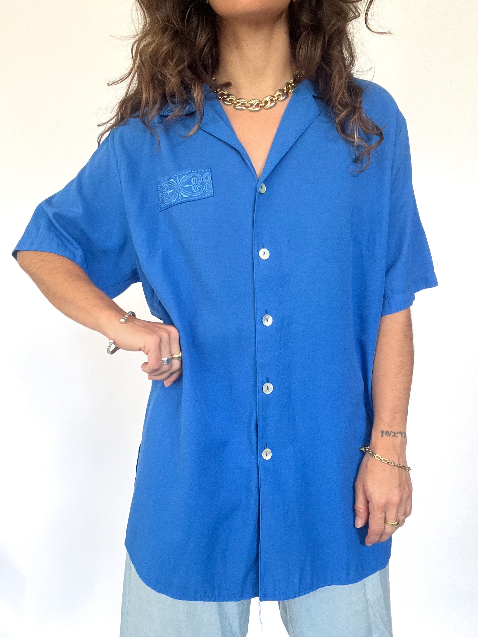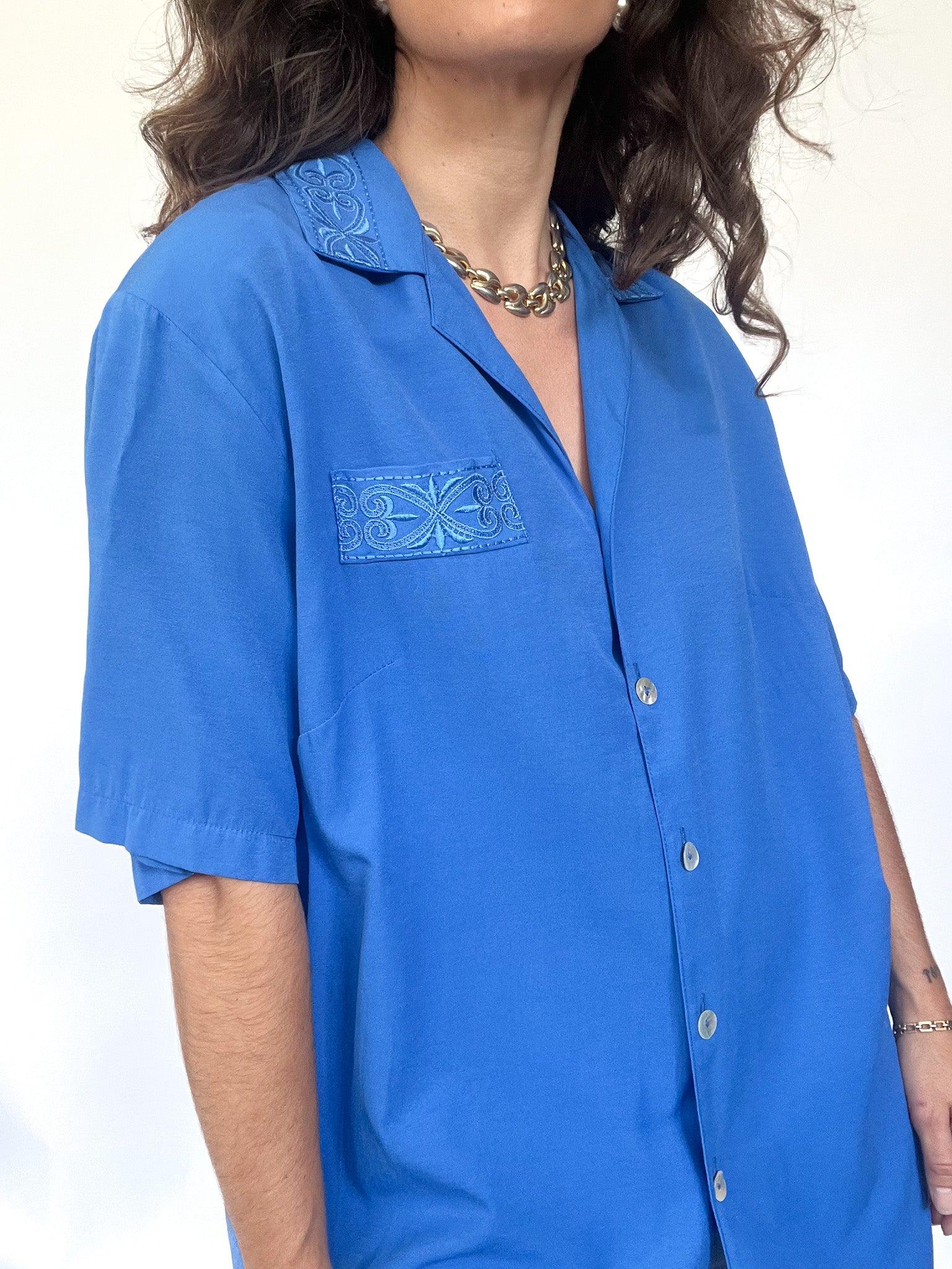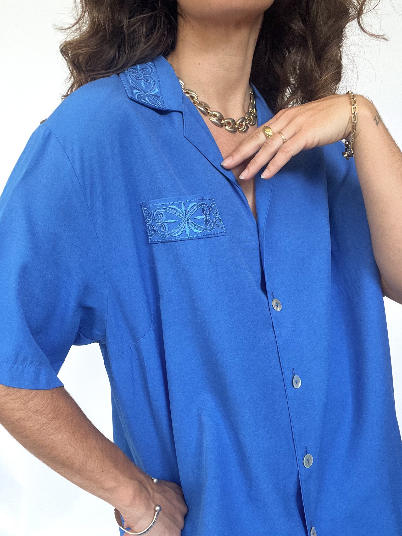 Bright and refined, this electric blue shirt balances simplicity with elevated details. The delicate embroidered patches on the chest and collar add a subtle yet distinctive twist. Worn loose or tucked in, it brings a fresh pop of color to your vintage rotation.