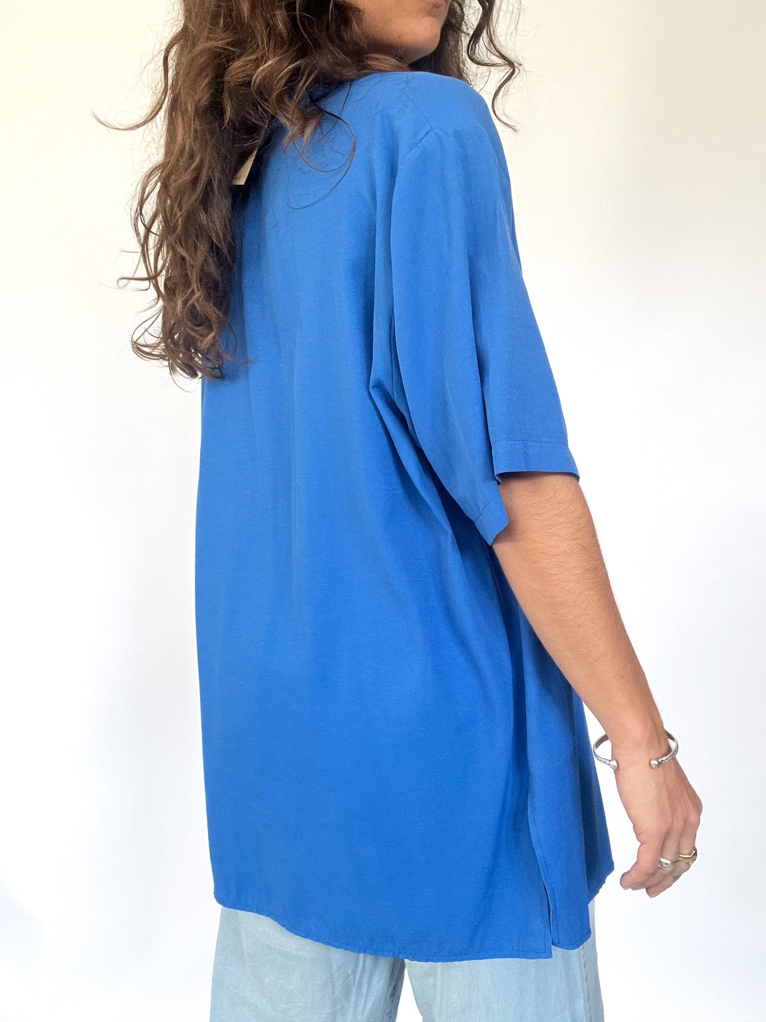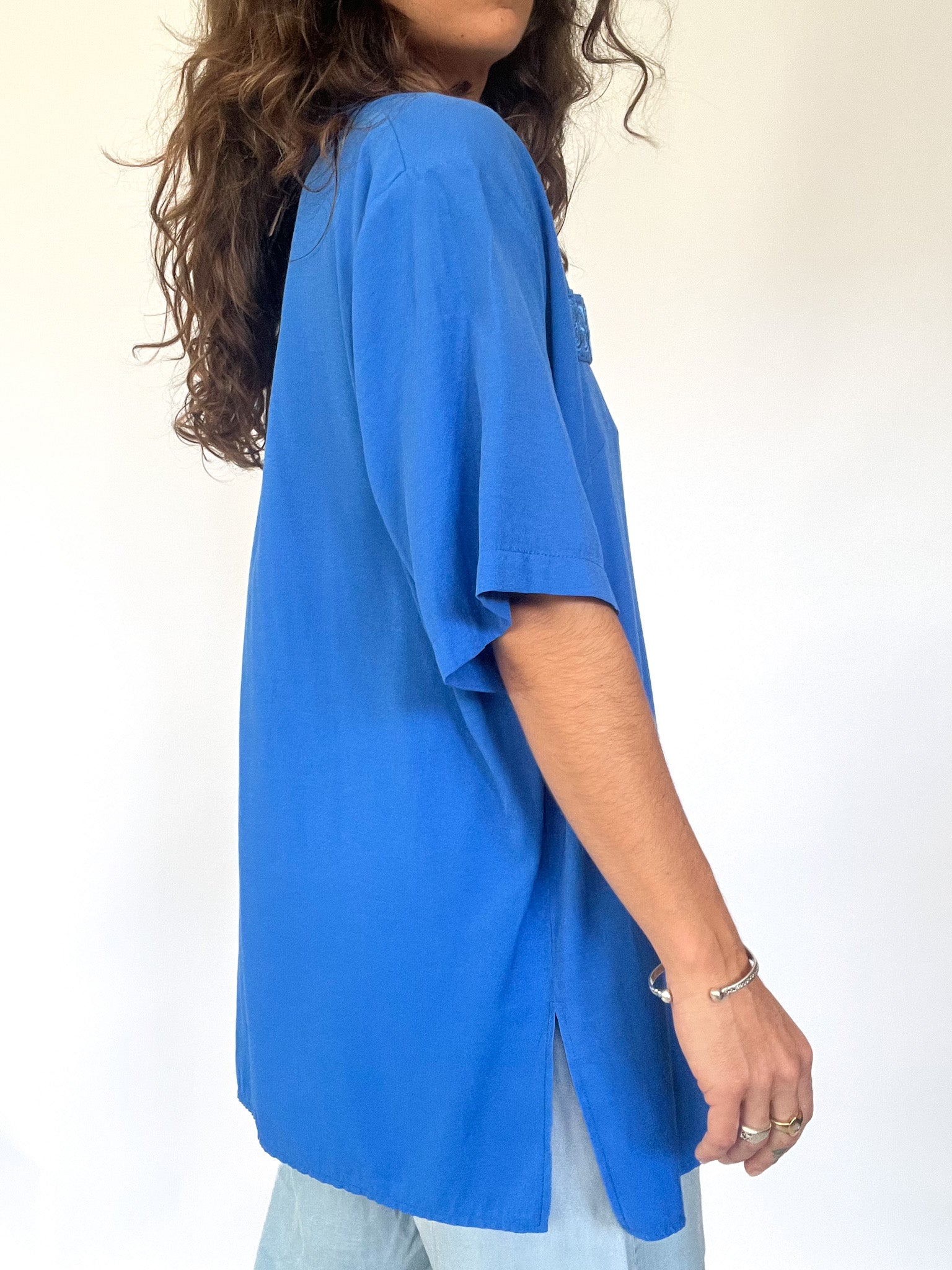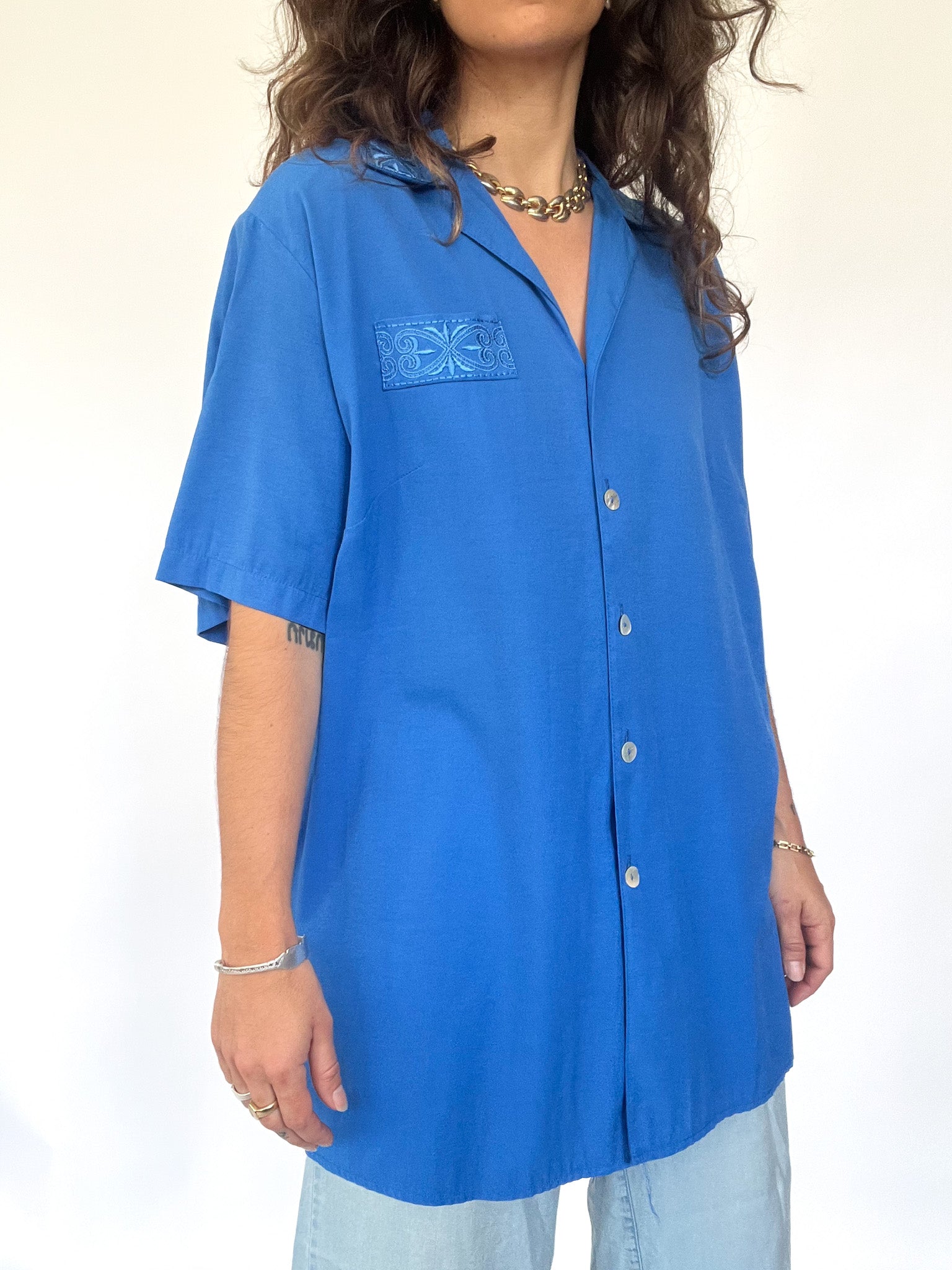 Bright and refined, this electric blue shirt balances simplicity with elevated details. The delicate embroidered patches on the chest and collar add a subtle yet distinctive twist. Worn loose or tucked in, it brings a fresh pop of color to your vintage rotation.