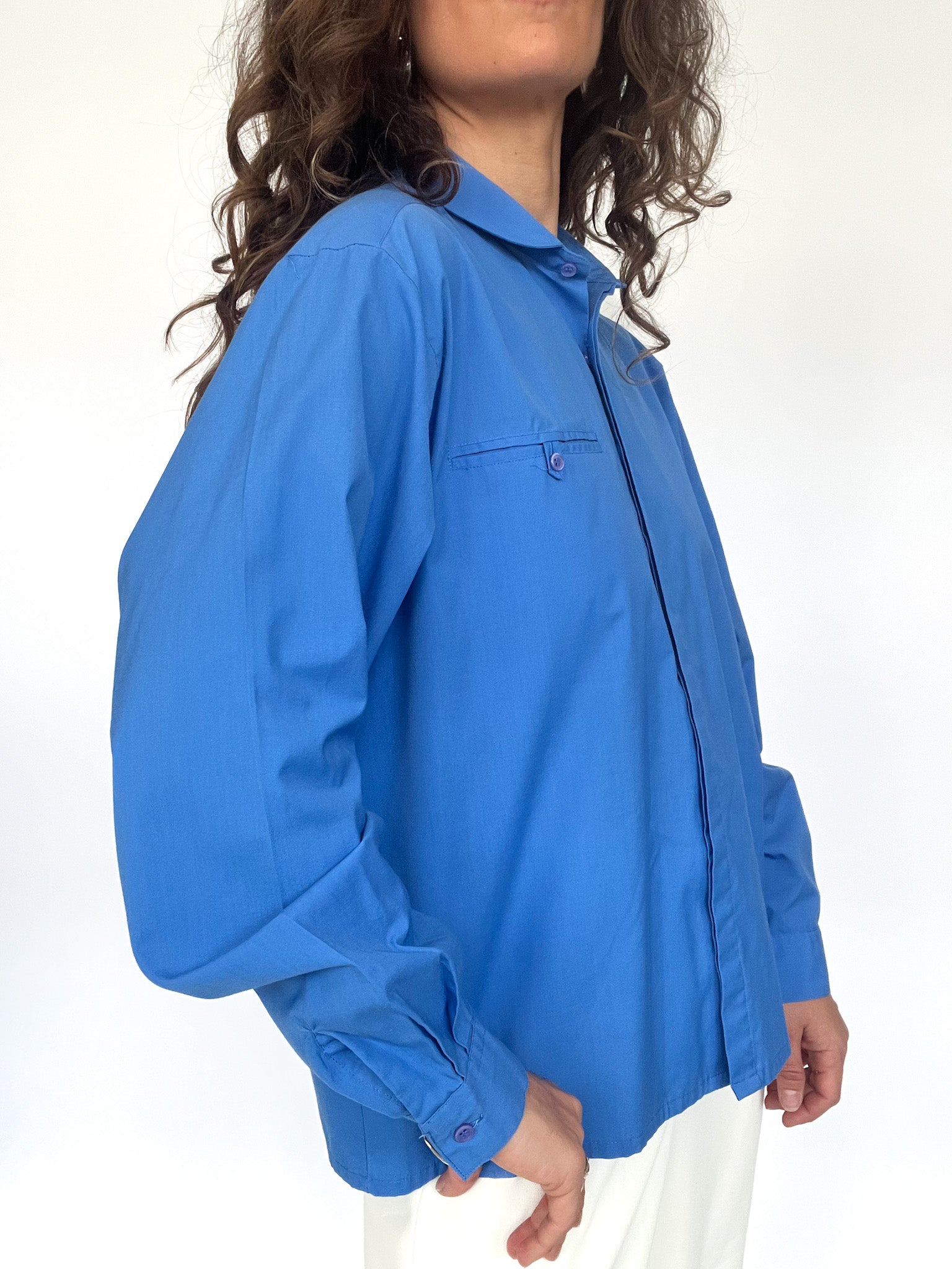- Special features: Utility pocket, hidden button placket, vivid blue tone