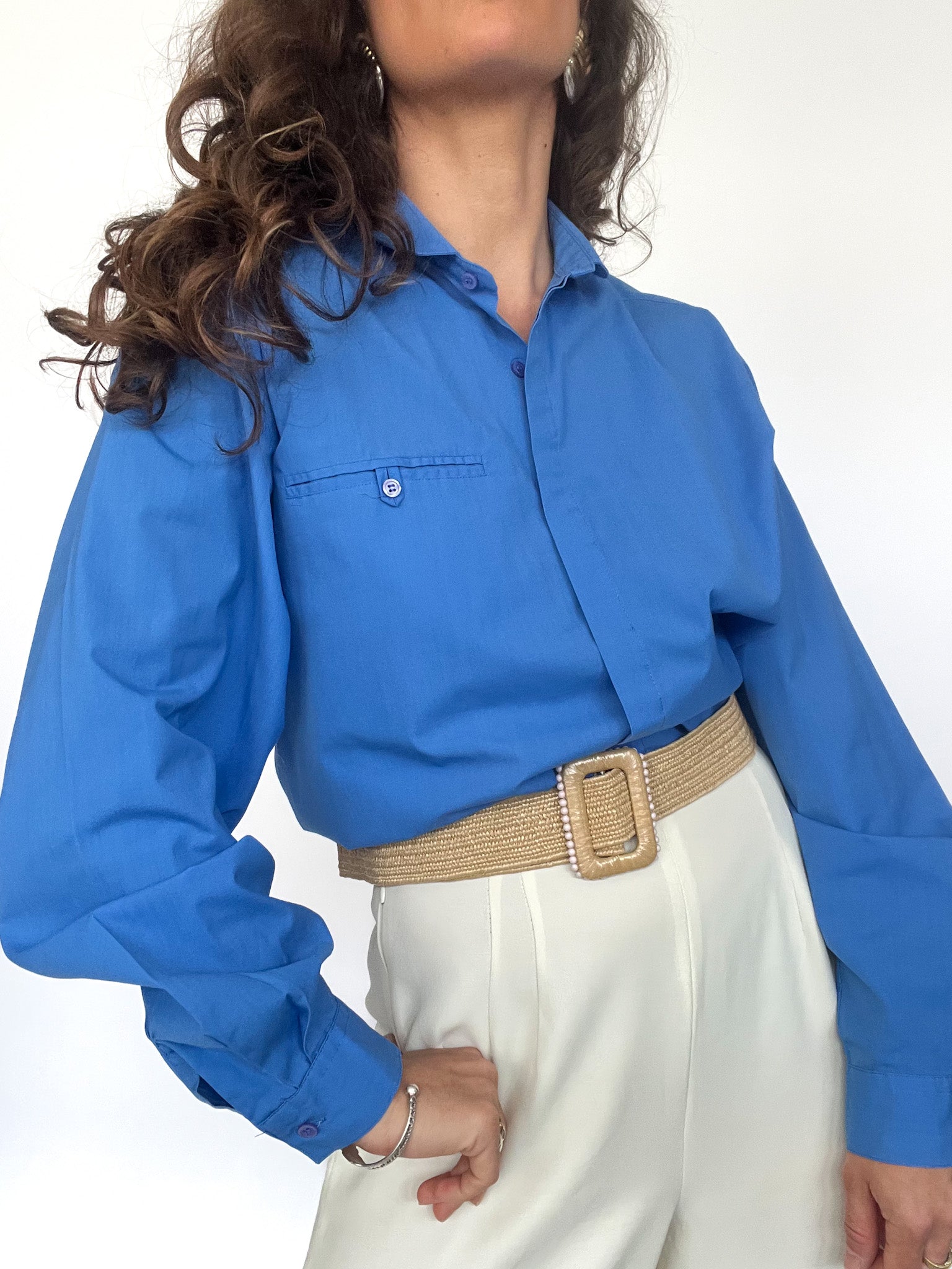 This bold cobalt shirt nods to utilitarian vintage aesthetics with its boxy cut and structured chest pocket. The hidden button placket and smooth cotton-blend fabric give it a polished twist. Wear it tucked into tailored trousers or loose over shorts — it’s a striking everyday layer with just enough edge.