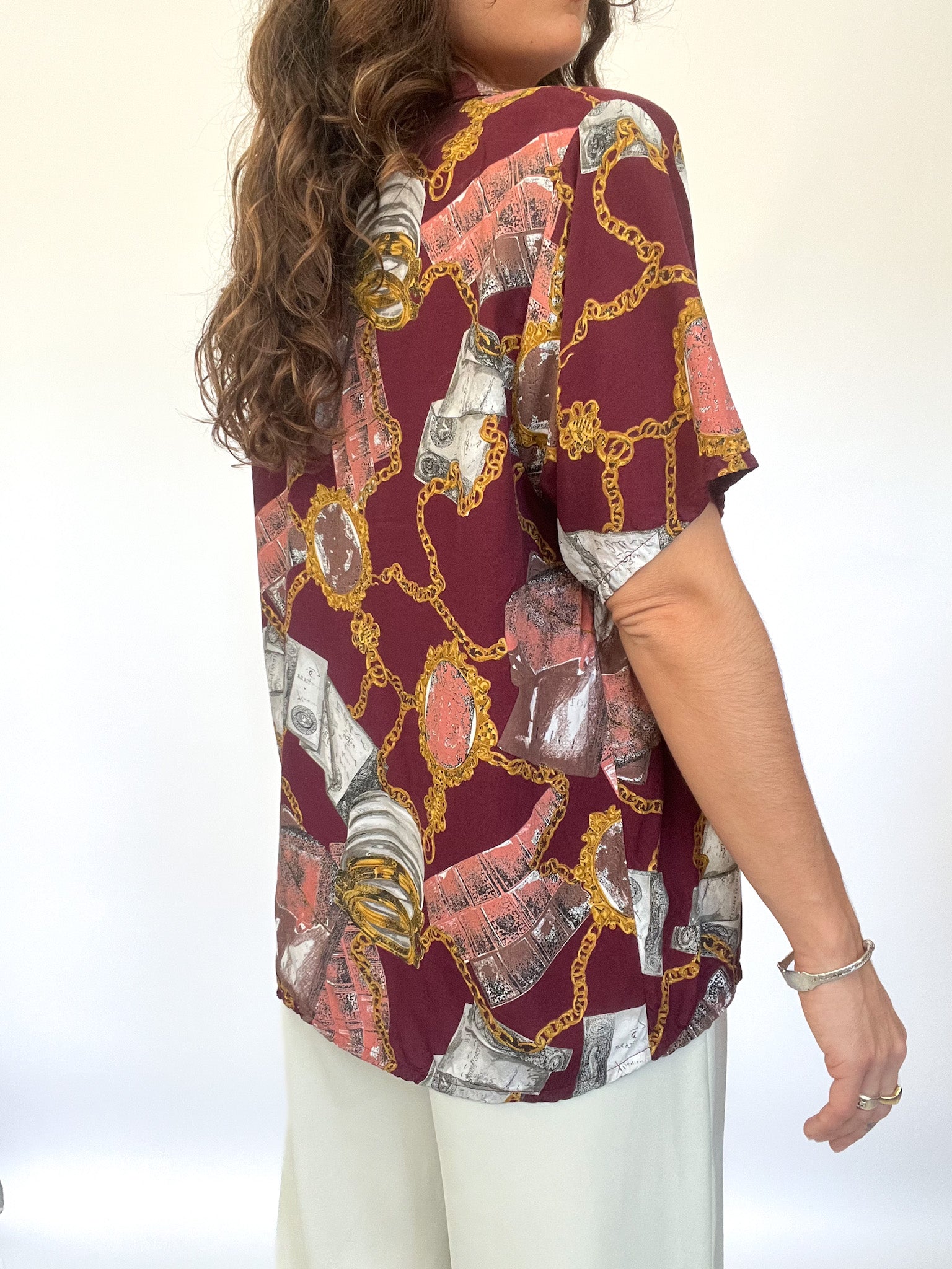 - Special features: Burgundy base with baroque-style gold chain and jewel print, short sleeves, classic collar, made in Italy
