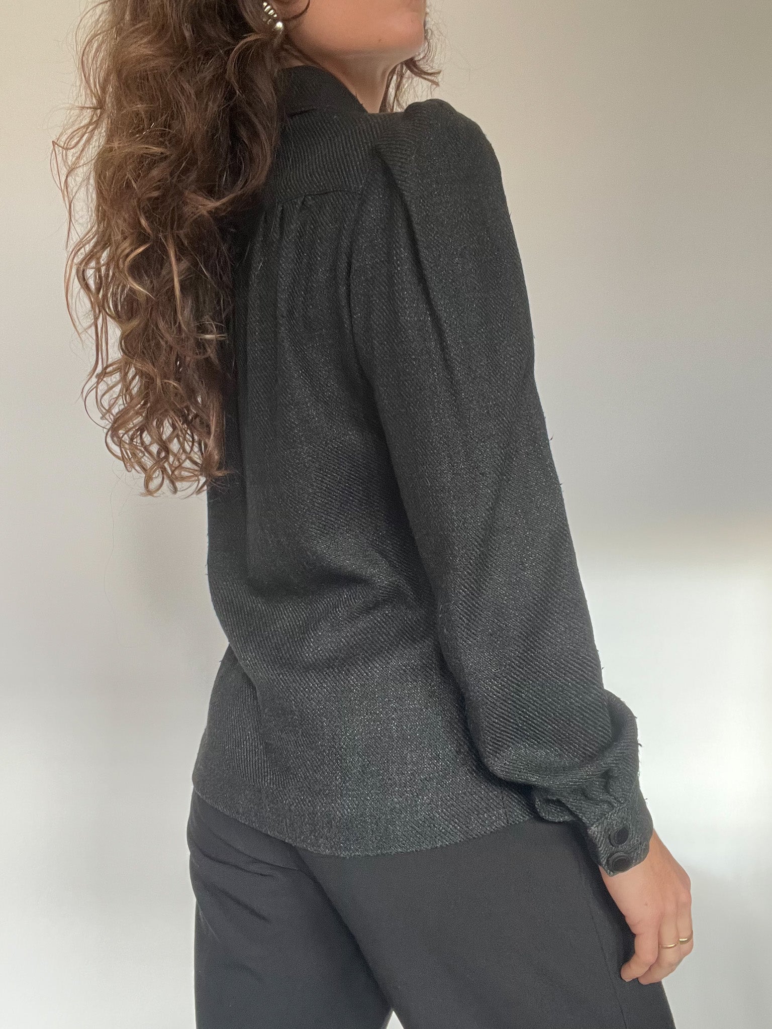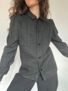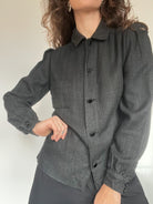This beautifully structured shirt jacket from the 1990s stands out for its strong tailoring and refined texture. The fabric is dense and substantial, suggesting a wool or cotton blend, giving the piece a reassuring weight and a clean, sculpted silhouette. Its deep charcoal tone adds a timeless elegance, while the precise cut brings a confident, almost architectural presence. Chosen for its exceptional buttons and impeccable shirt style construction, this piece reflects the power dressing codes of the 90s with a modern sensibility. It can be worn as a structured shirt or as a light jacket, offering versatility without compromising character. A statement piece that embodies the Skorpiones Vintage vision of strength, elegance and individuality.