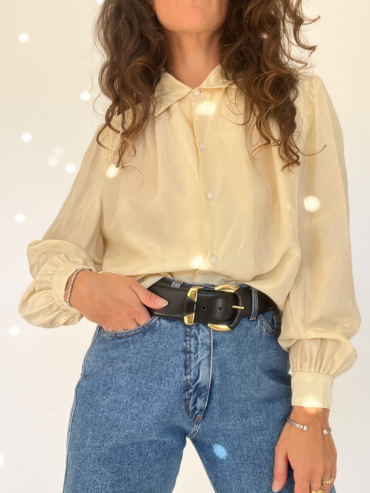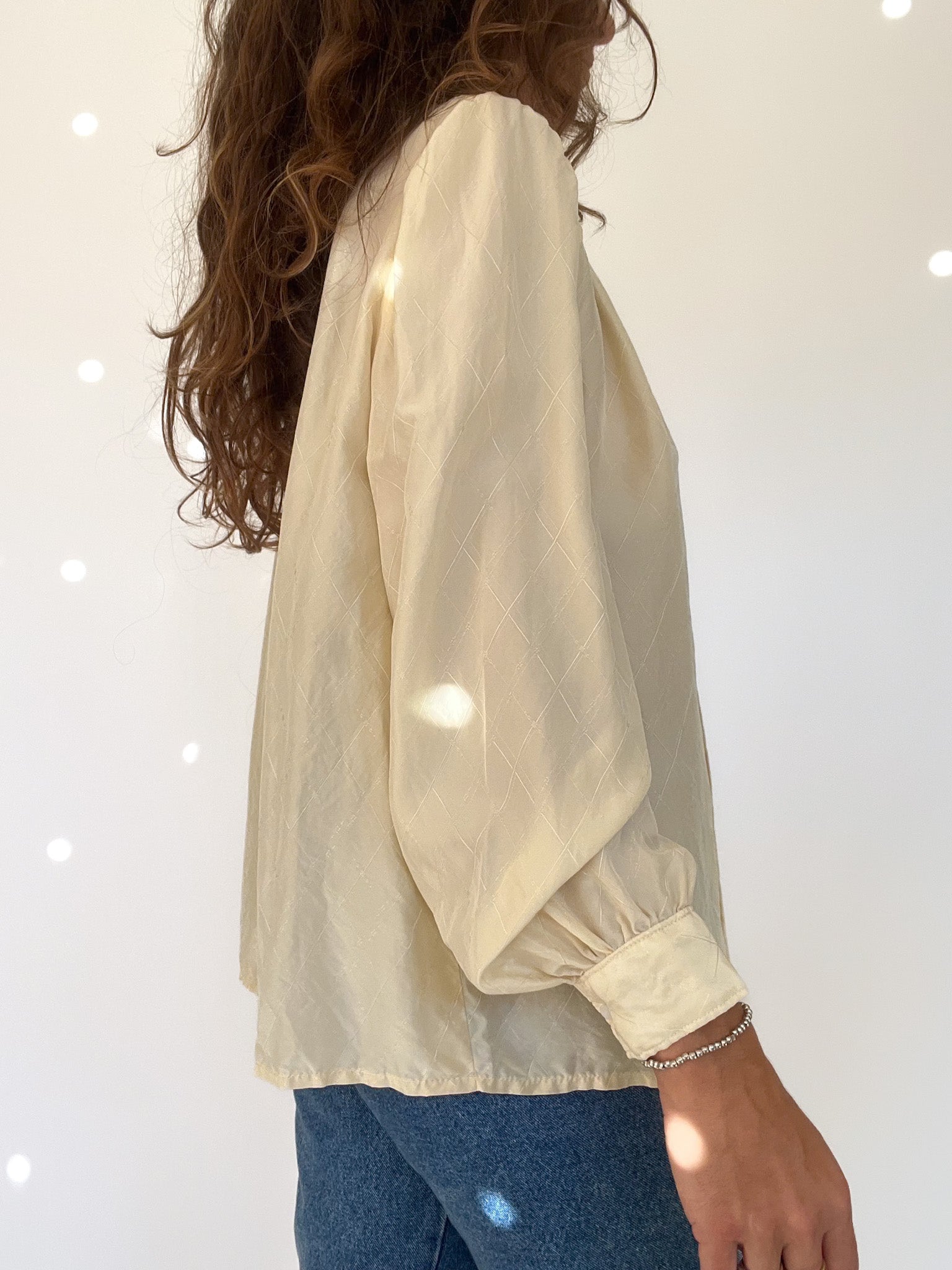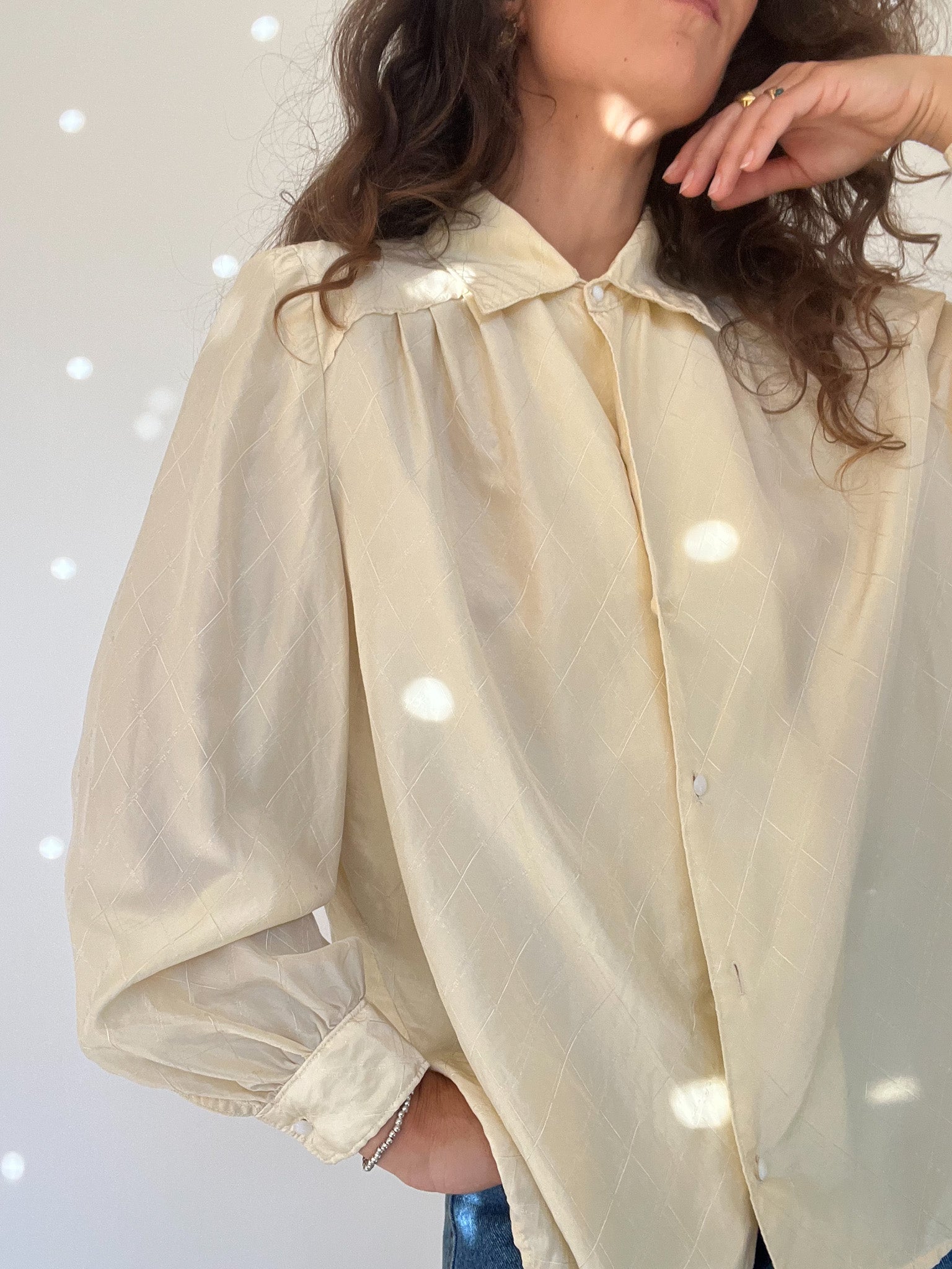This vintage 90’s silk blouse embodies quiet elegance with its soft cream tone and delicate diamond-patterned texture woven directly into the fabric. Its fluid drape and slightly puffed sleeves add a touch of sophistication, while the gentle sheen of pure silk enhances its refined allure. Designed for timeless versatility, it can be worn casually tucked into jeans or styled elegantly for more formal occasions. A true Skorpiones Vintage piece, blending authenticity, exclusivity, and quality into a blouse that empowers the wearer with understated confidence.