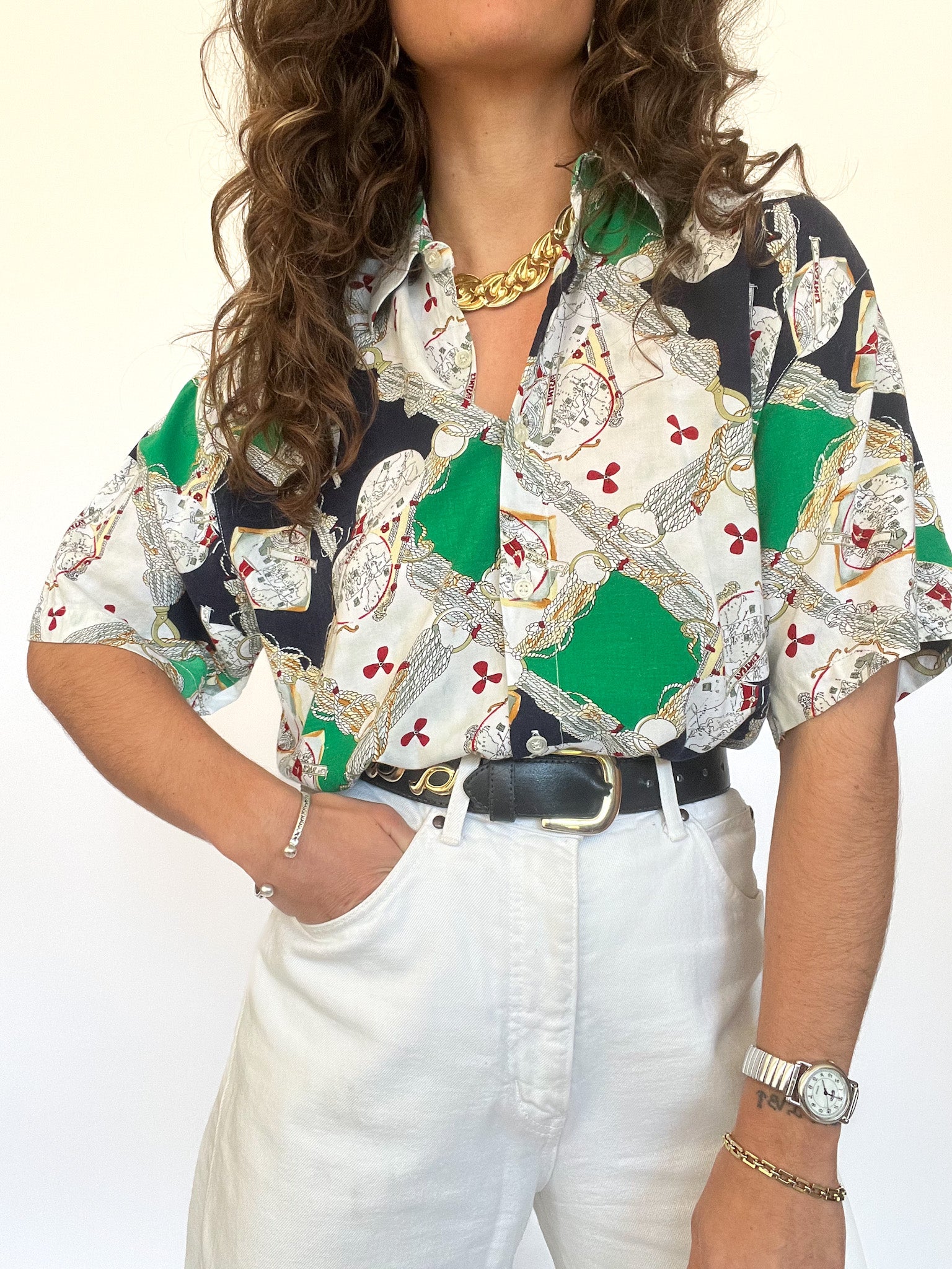 A bold, heritage-inspired chain print in unexpected green and navy tones. This shirt is full of charisma—perfect for turning heads while staying comfortably chic. Its fluid viscose drape and standout motif embody the Skorpiones ethos: elegance with an edge.