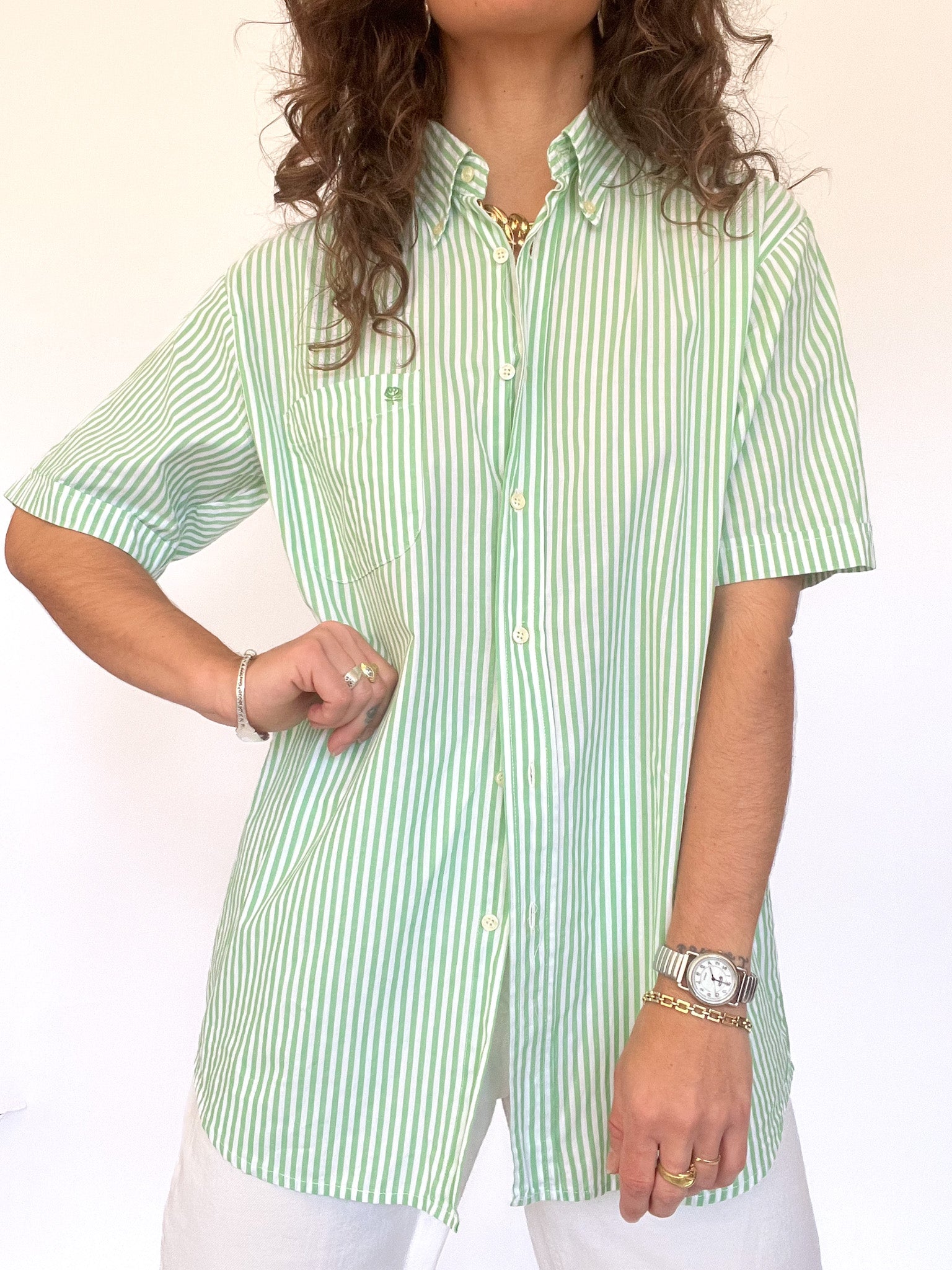 Easy and timeless — this lightweight short-sleeved cotton shirt offers the perfect pop of green for spring-summer. With its classic cut and vertical stripes, it can be worn loose or tucked in, paired with jeans or tailored trousers for a relaxed yet elevated look.