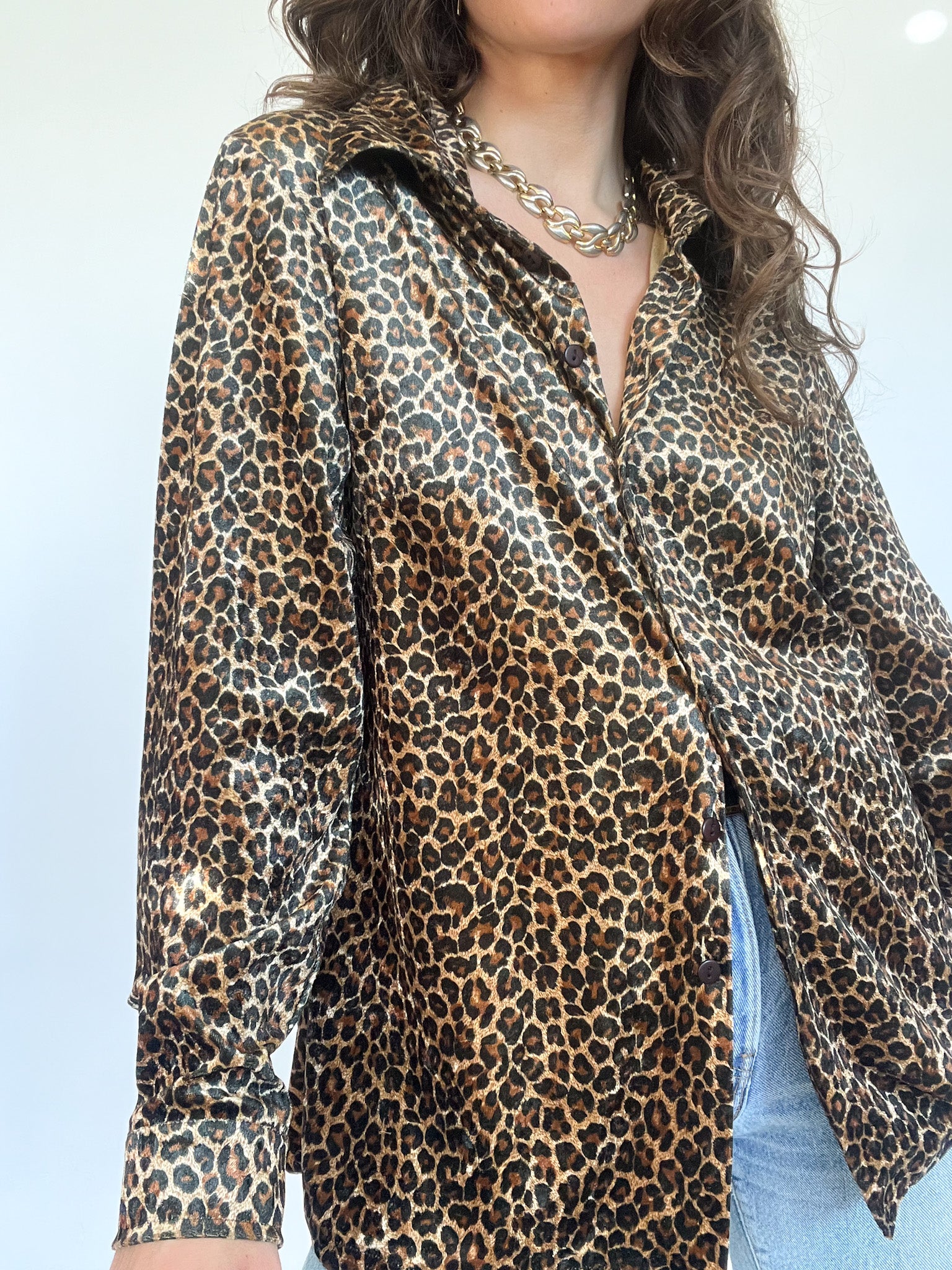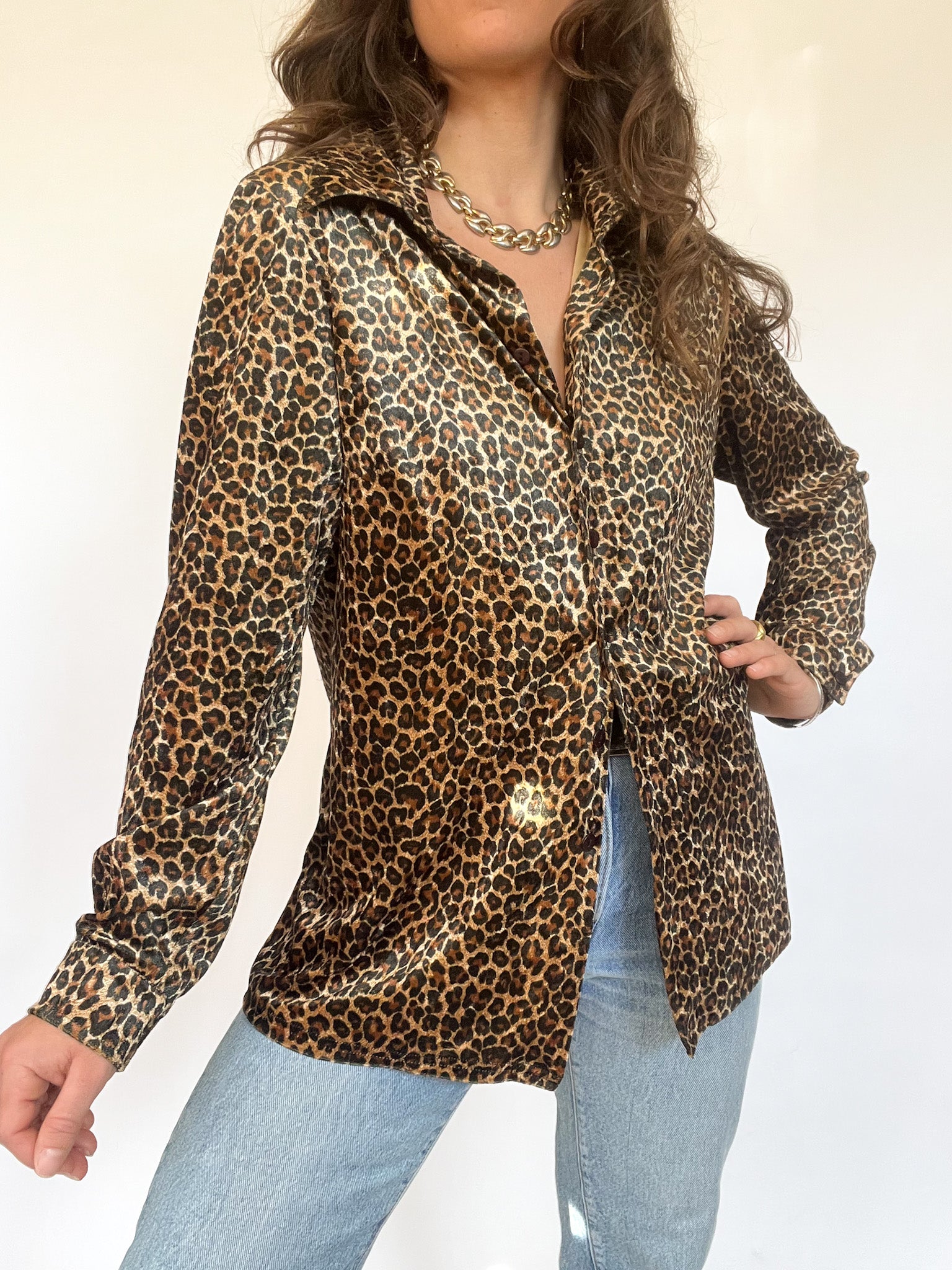 Fierce and unapologetic, this 90s leopard print shirt is for those who don’t mind turning heads. Crafted in a silky, slightly shimmering fabric, it celebrates the bold femininity and confident style that define the Skorpiones Vintage spirit. Wear it buttoned up for an empowered silhouette or open over a tee for a more rebellious attitude.