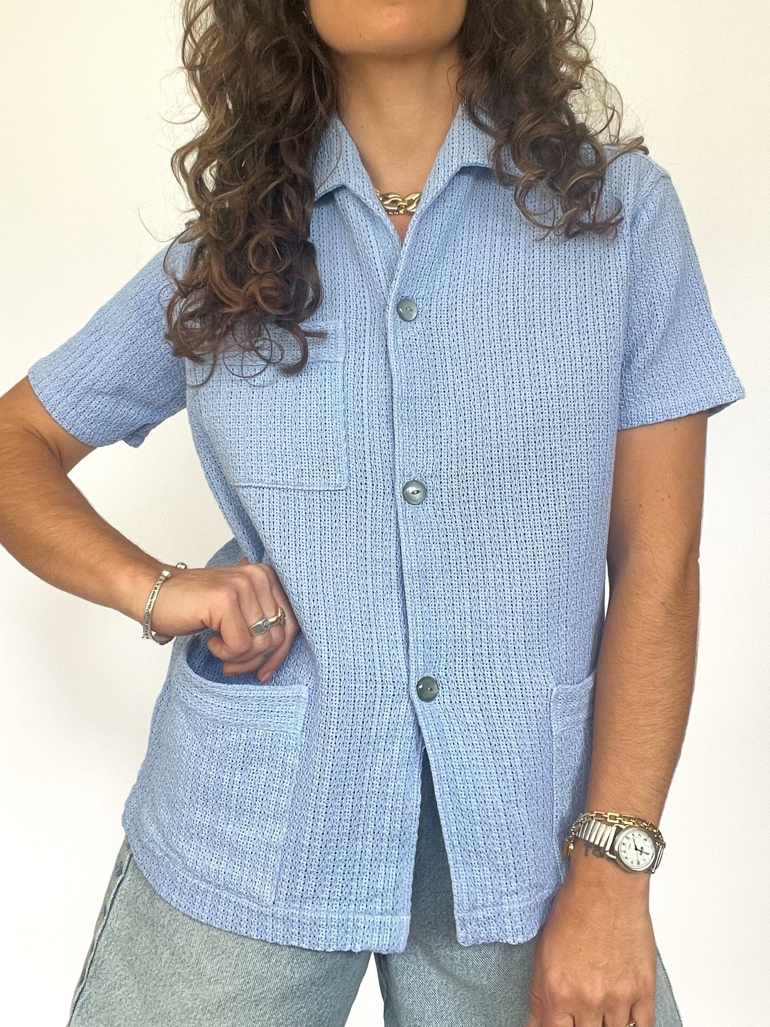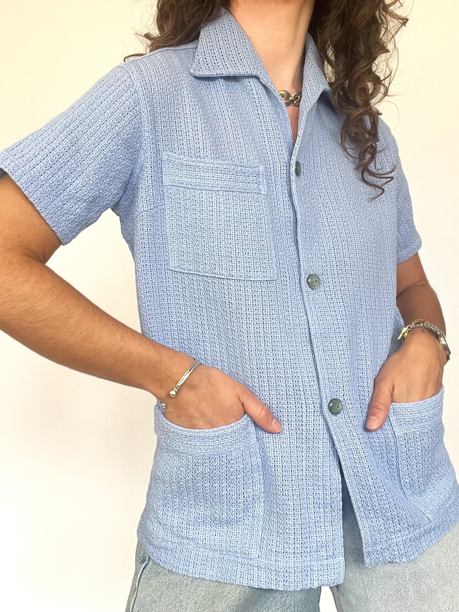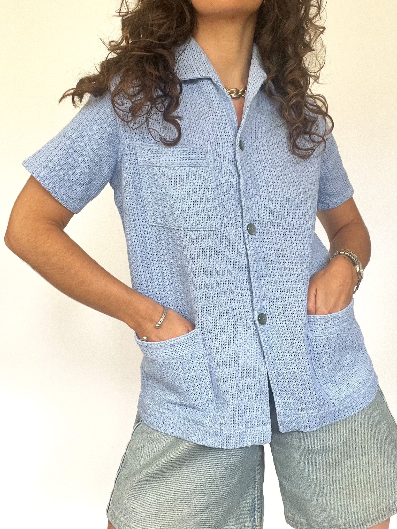 Crafted in a textured, open-knit weave, this soft blue shirt combines utility and softness with its patch pockets and straight cut. It blends the charm of a vintage French Riviera wardrobe with modern ease — perfect worn over a tank or buttoned up on its own. It’s a classic example of quiet style that whispers rather than shouts.