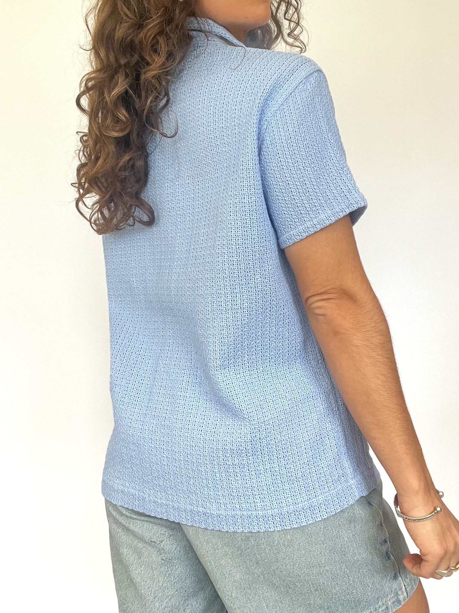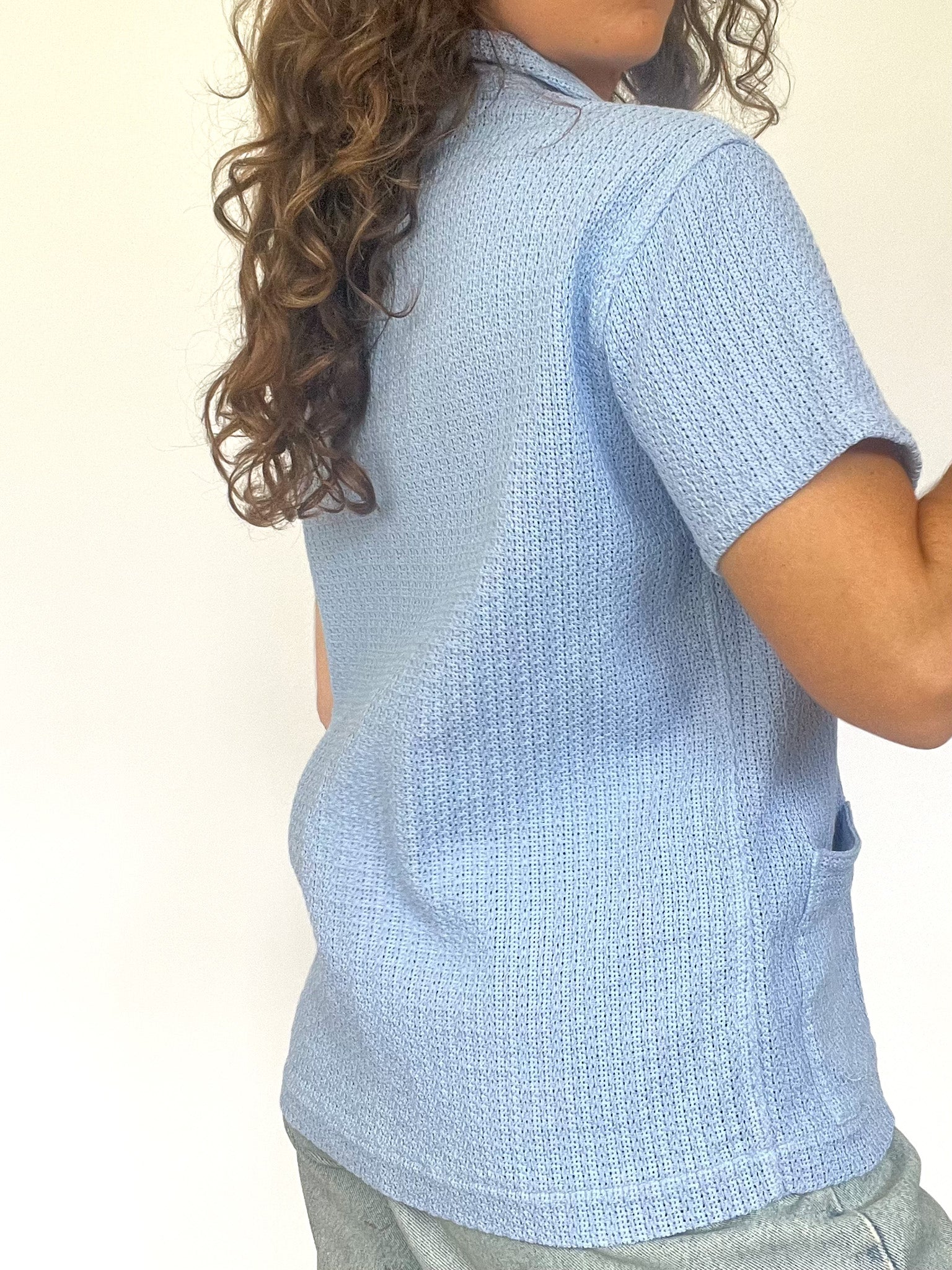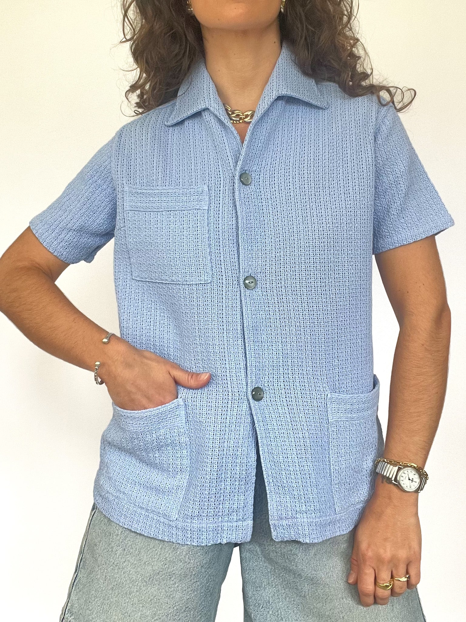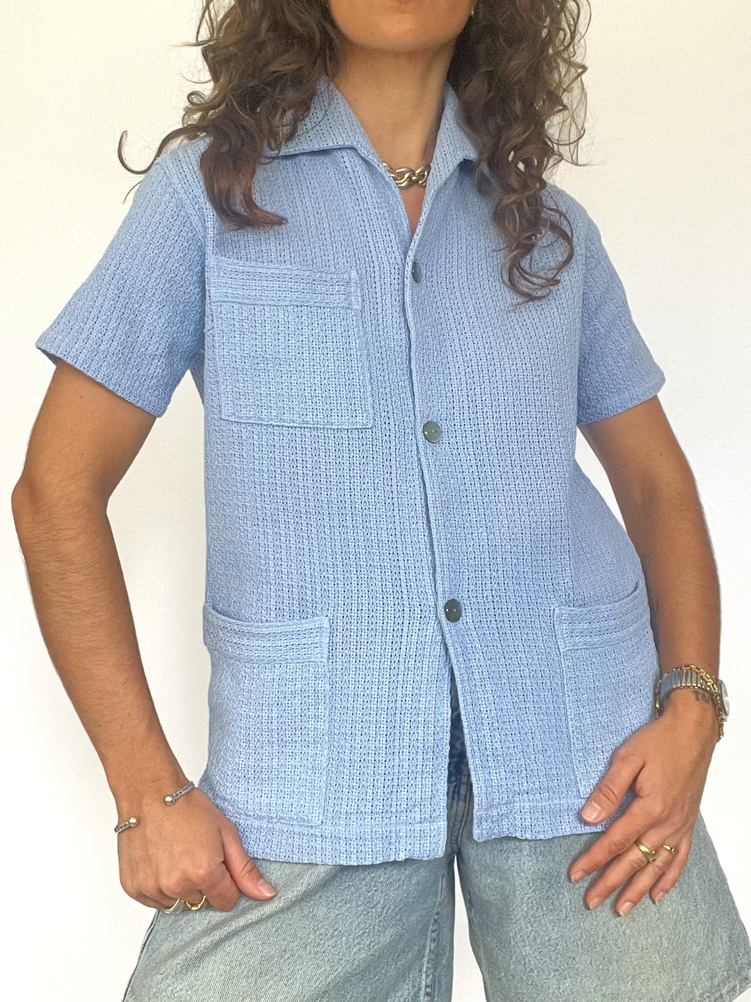 Crafted in a textured, open-knit weave, this soft blue shirt combines utility and softness with its patch pockets and straight cut. It blends the charm of a vintage French Riviera wardrobe with modern ease — perfect worn over a tank or buttoned up on its own. It’s a classic example of quiet style that whispers rather than shouts.
