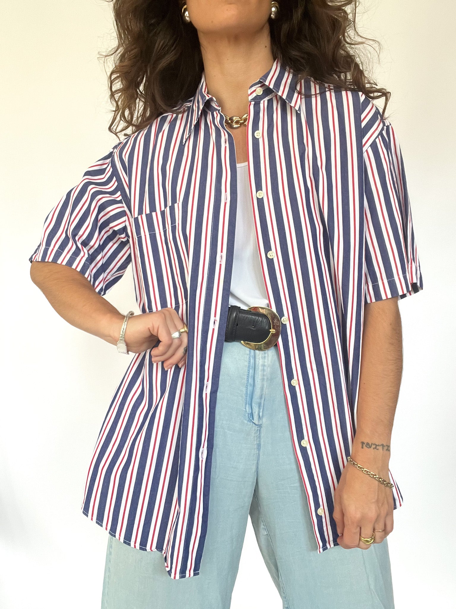 Effortlessly androgynous, this striped shirt was made to be shared. With a crisp cotton structure and classic navy, red, and white palette, it delivers timelessness with a touch of retro American spirit. Wear it loose over denim or tied up for summer chic.