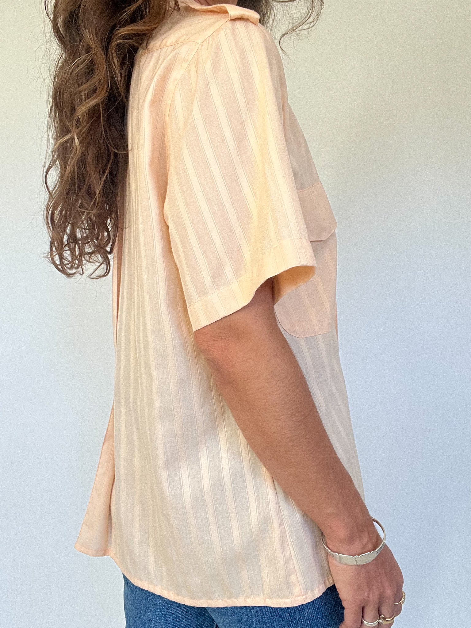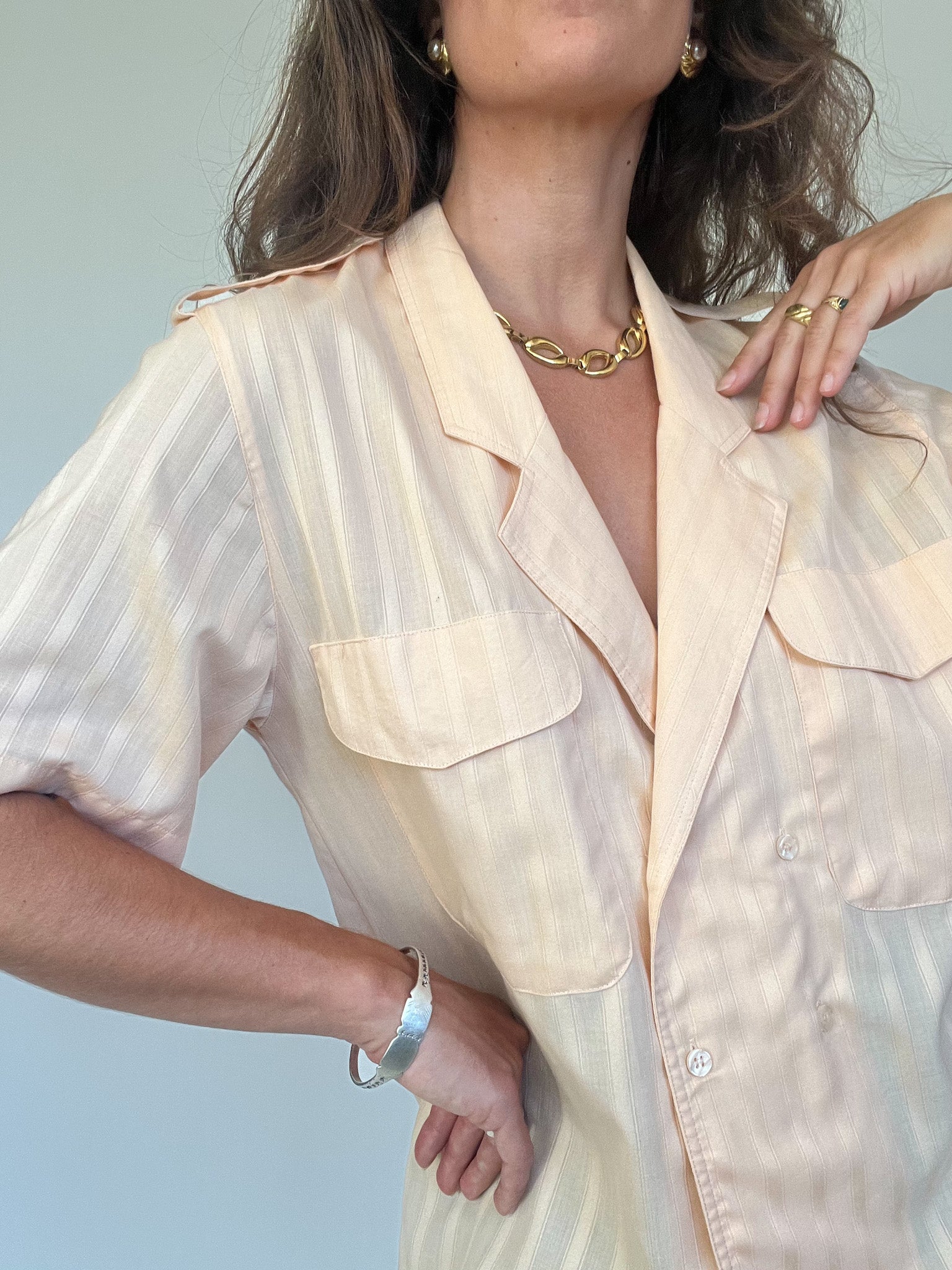 This playful yet refined vintage blouse captures the essence of 90’s summer elegance. In a delicate peach tone with subtle vertical stripes, it features a double-breasted front and flap chest pockets that give it a touch of structure. The short sleeves and lightweight fabric make it perfect for warmer days, while the soft tailoring ensures versatility—style it open over a tank top or buttoned up for a polished look. A piece that celebrates the effortless authenticity and exclusivity of Skorpiones Vintage.
