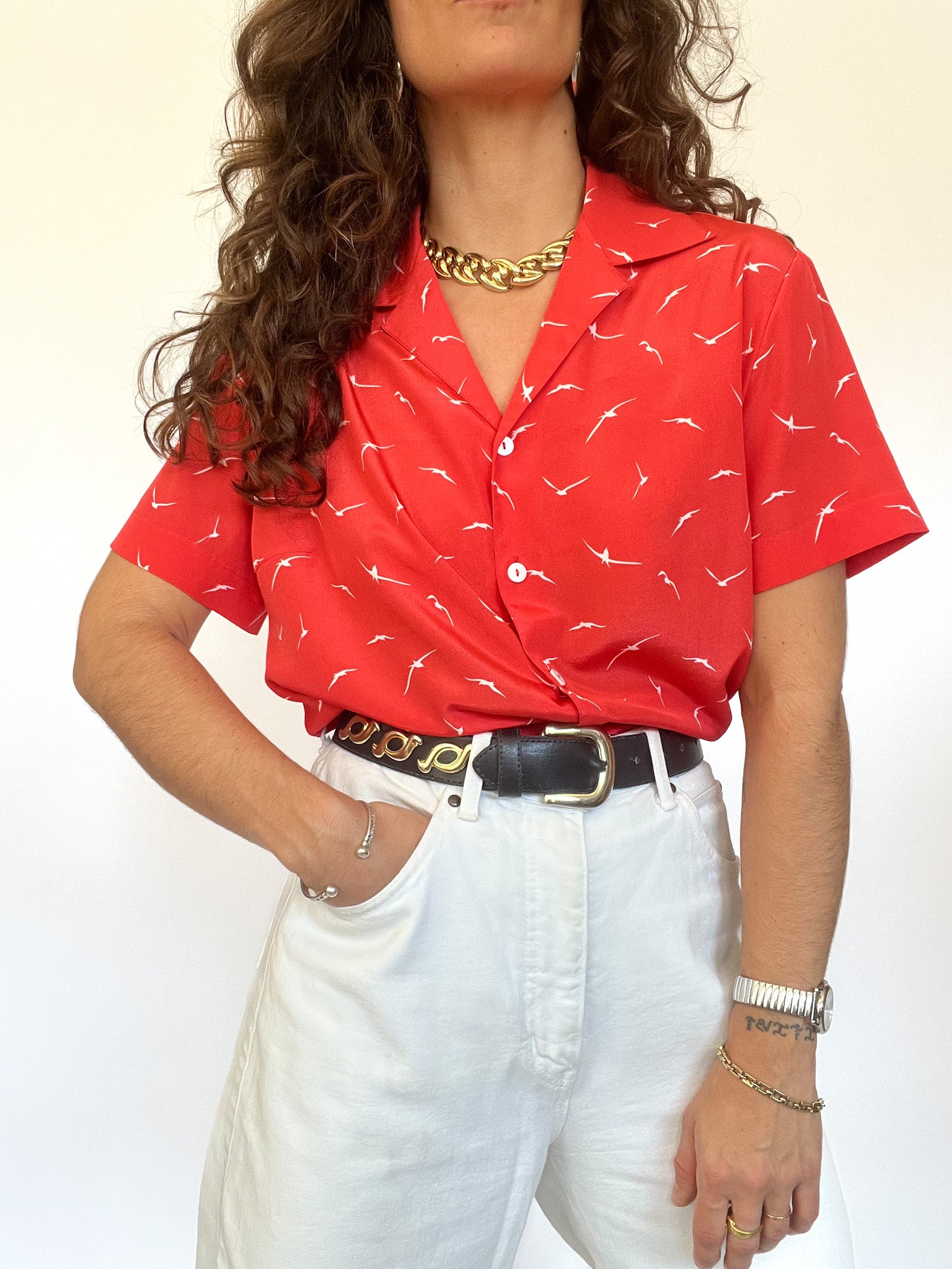 Vivid and full of character, this vintage 90s shirt captures the spirit of a carefree summer escape. Made in Italy from a lightweight flowy polyester, it features a striking red base with an all-over white bird print — adding just the right touch of whimsy to a bold silhouette. Perfect tucked in or worn loose, it’s an effortless way to make a statement, whether you’re by the sea or in the city.