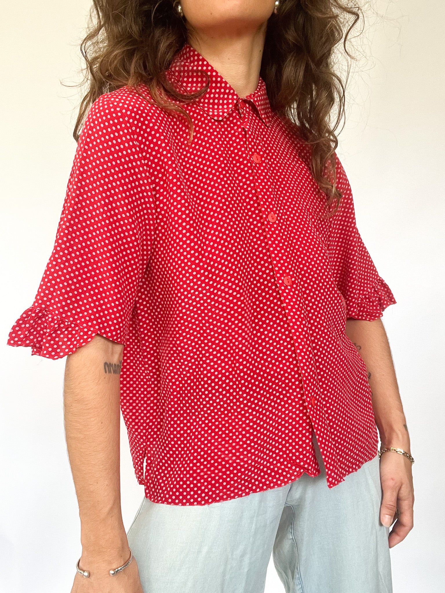 Light as air and full of movement, this vintage silk shirt with delicate polka dots feels like a breath of summer. The slightly flared sleeves and fluid silhouette add a romantic feel, while the pure silk makes it an elevated essential.