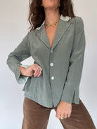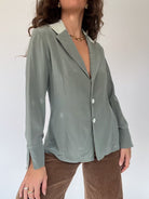 - Special features: Sage green tone, covered buttons, split cuffs, soft tailored structure, smooth silk drape