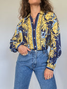 A bold and sophisticated vintage piece that captures the unapologetic spirit of the 90’s. Crafted in Switzerland, this shirt showcases a striking baroque-inspired print in navy, gold, and light blue, evoking a sense of opulence and timeless elegance. With its structured collar, gold-tone buttons, and fluid drape, it’s a statement garment designed to empower and elevate any look. A true expression of Skorpiones Vintage’s ethos—authentic, exclusive, and iconic.