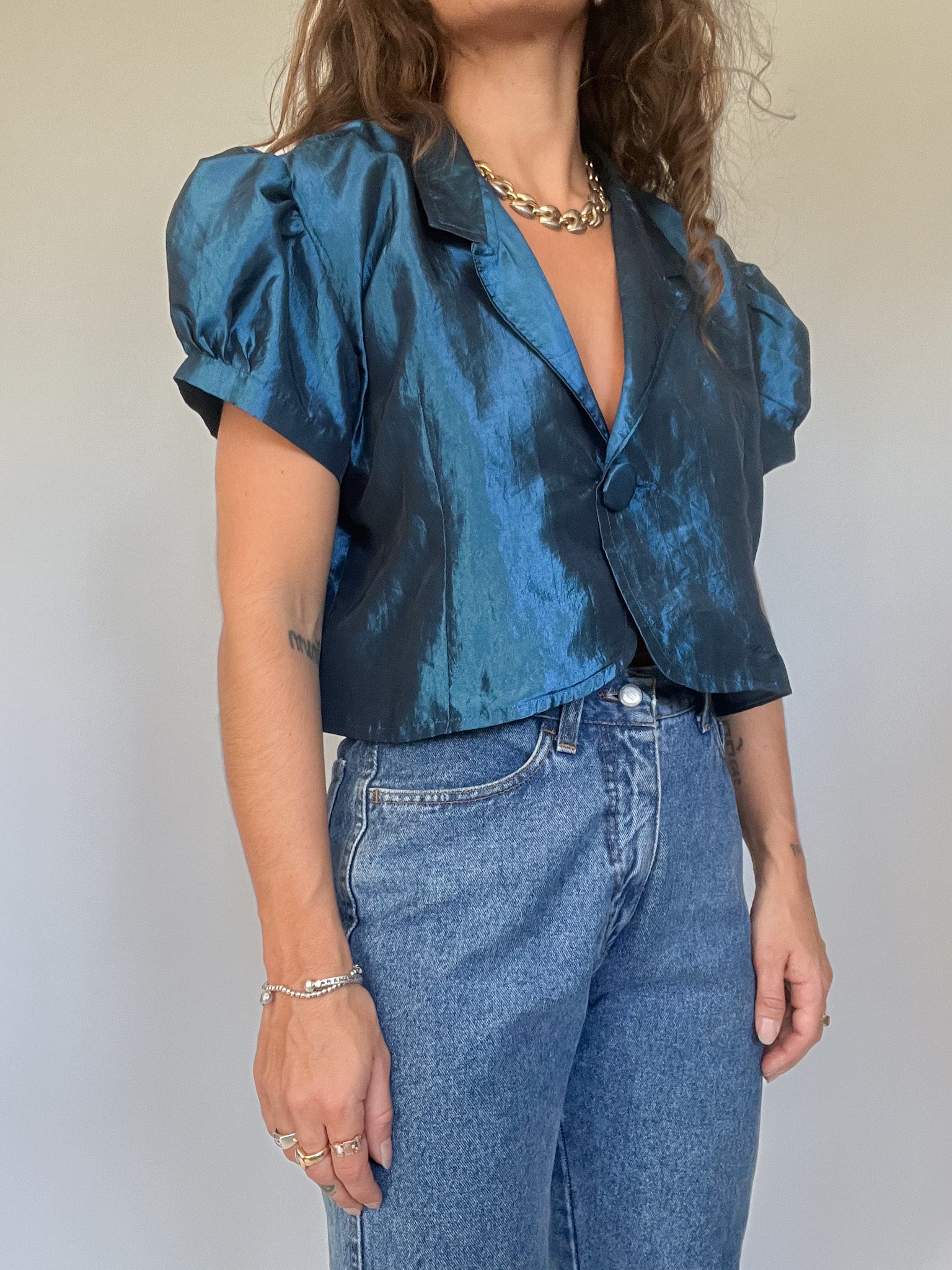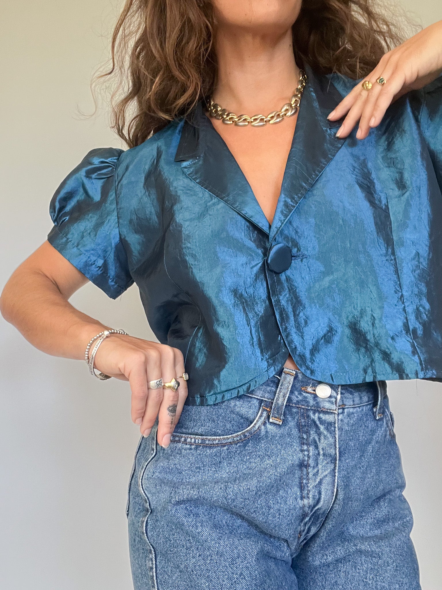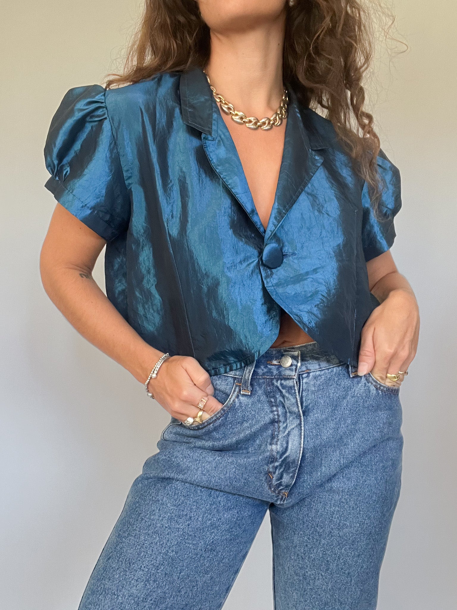This one-of-a-kind handmade cropped blazer brings a bold 90’s twist to tailoring. Its lustrous teal fabric and puffed sleeves create a strong silhouette, balanced by the single button closure and cropped cut. Both daring and elegant, it channels empowerment and exclusivity, key to the Skorpiones Vintage ethos.