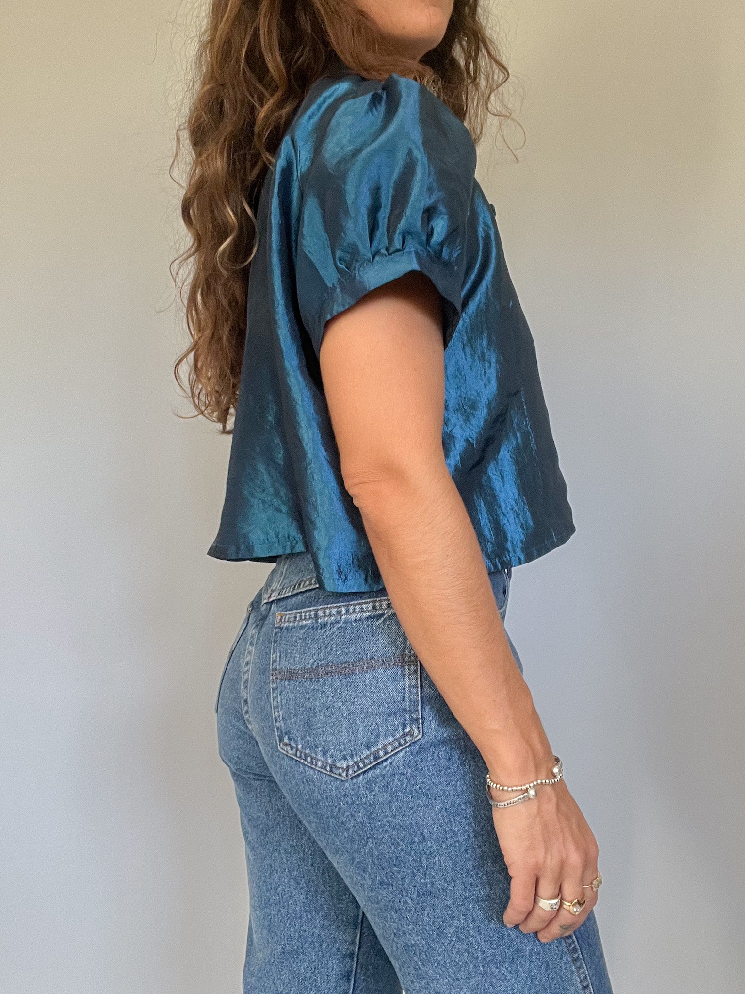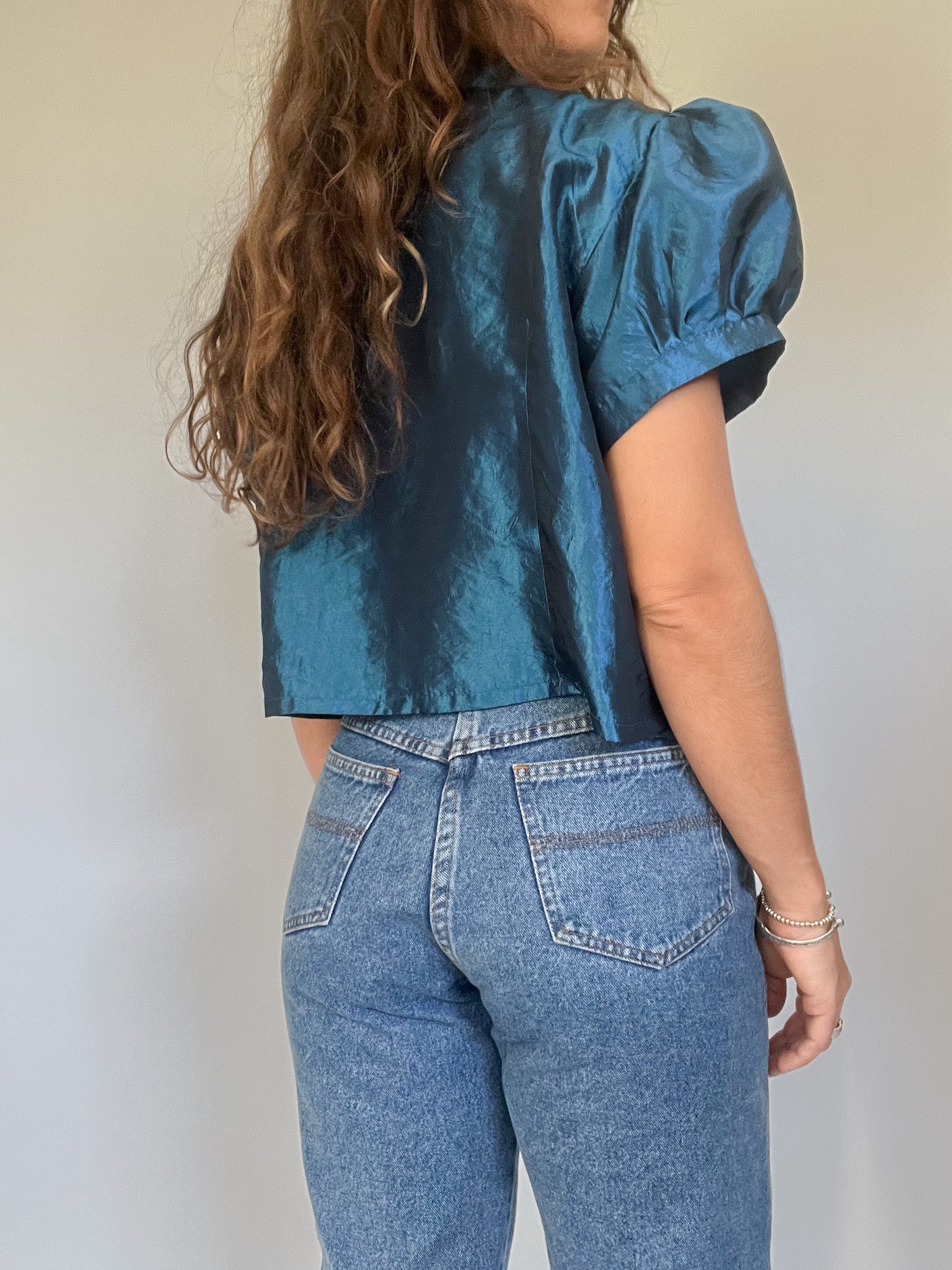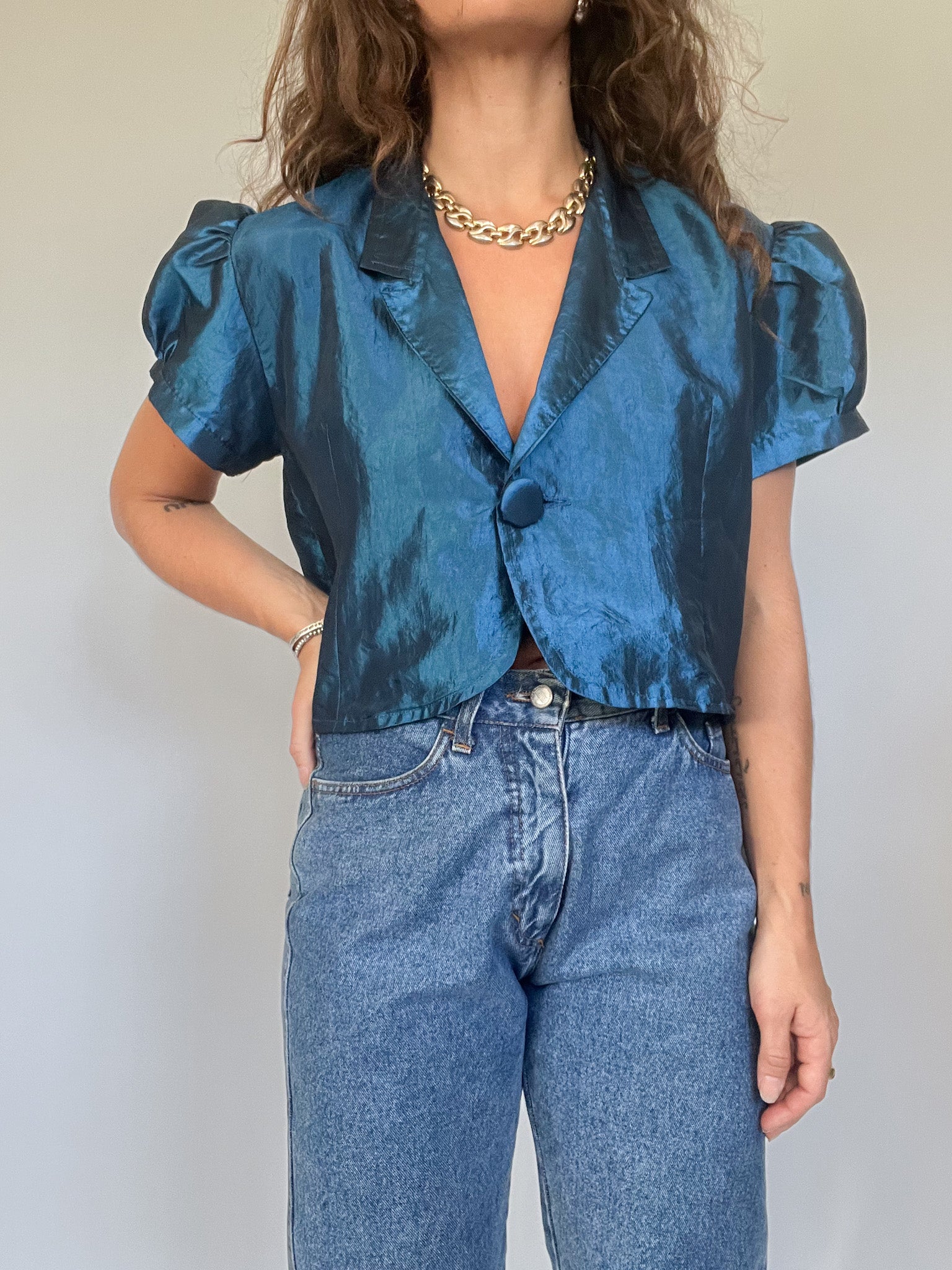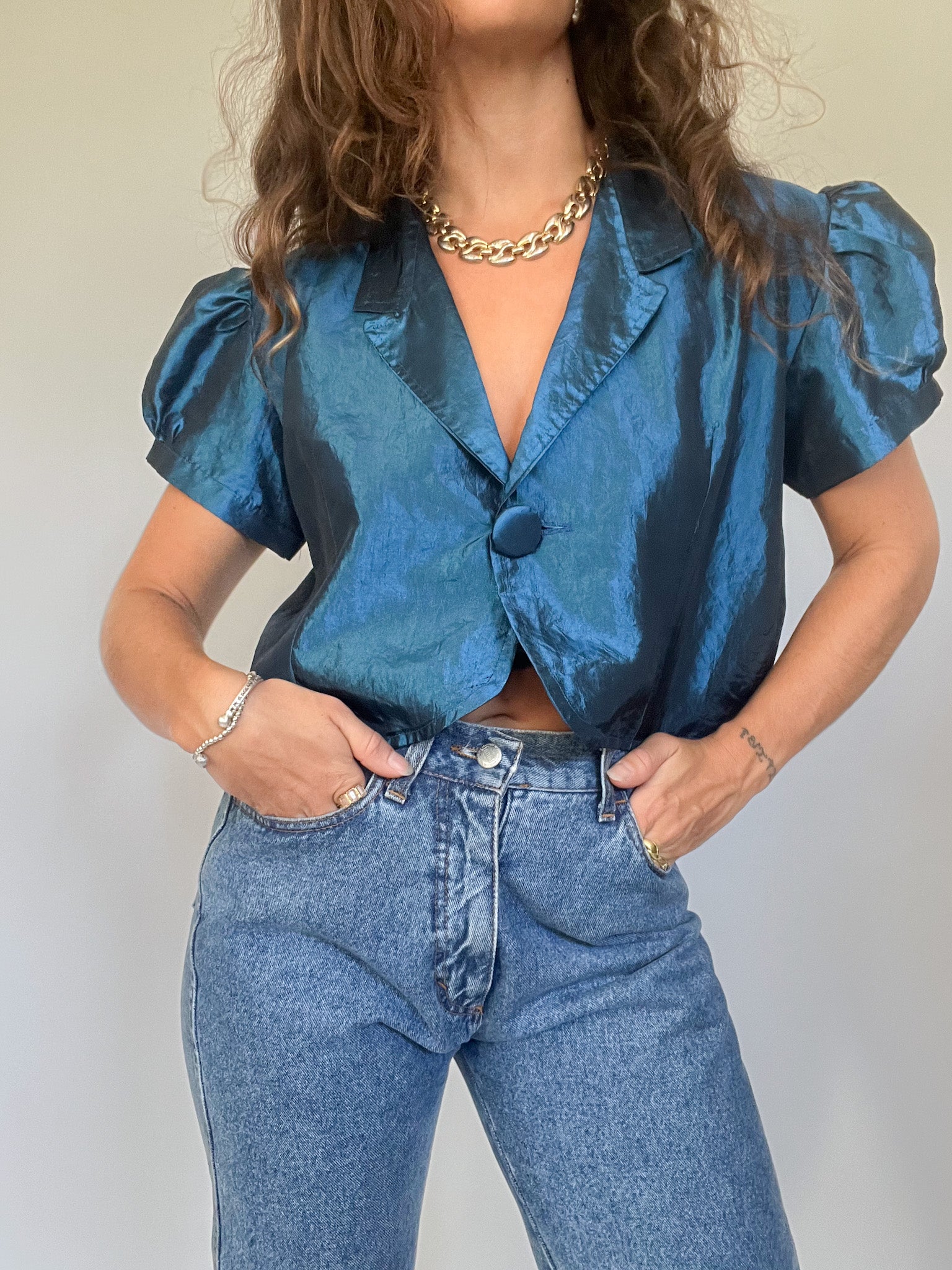 This one-of-a-kind handmade cropped blazer brings a bold 90’s twist to tailoring. Its lustrous teal fabric and puffed sleeves create a strong silhouette, balanced by the single button closure and cropped cut. Both daring and elegant, it channels empowerment and exclusivity, key to the Skorpiones Vintage ethos.