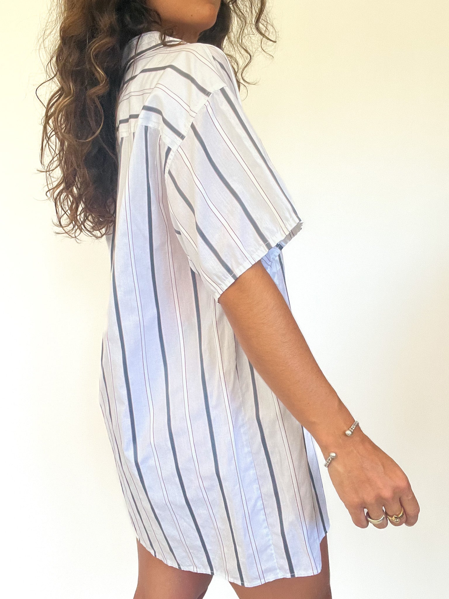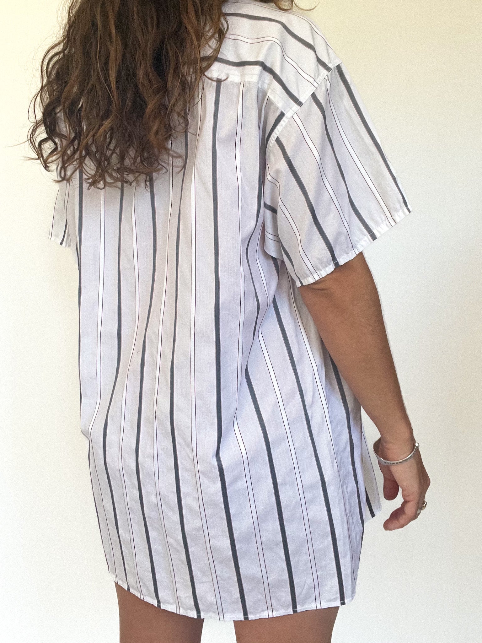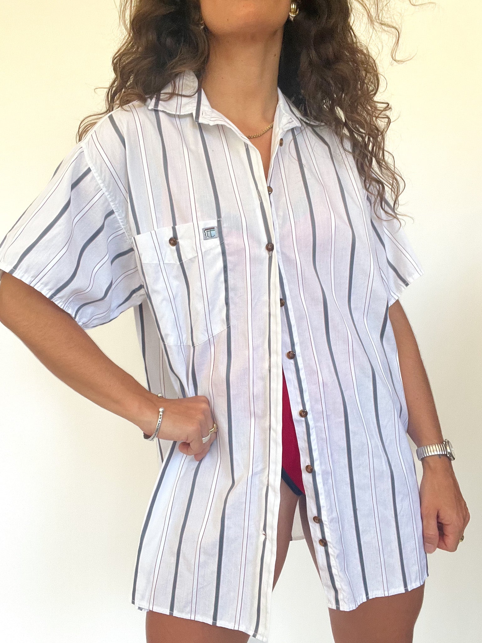 A crisp classic with a playful twist. This vintage 90’s men’s shirt features fine black and burgundy pinstripes on fresh white cotton, giving it that retro summer energy we love. Lightweight and breathable, it’s perfect thrown over a swimsuit or tucked into high-waisted denim.