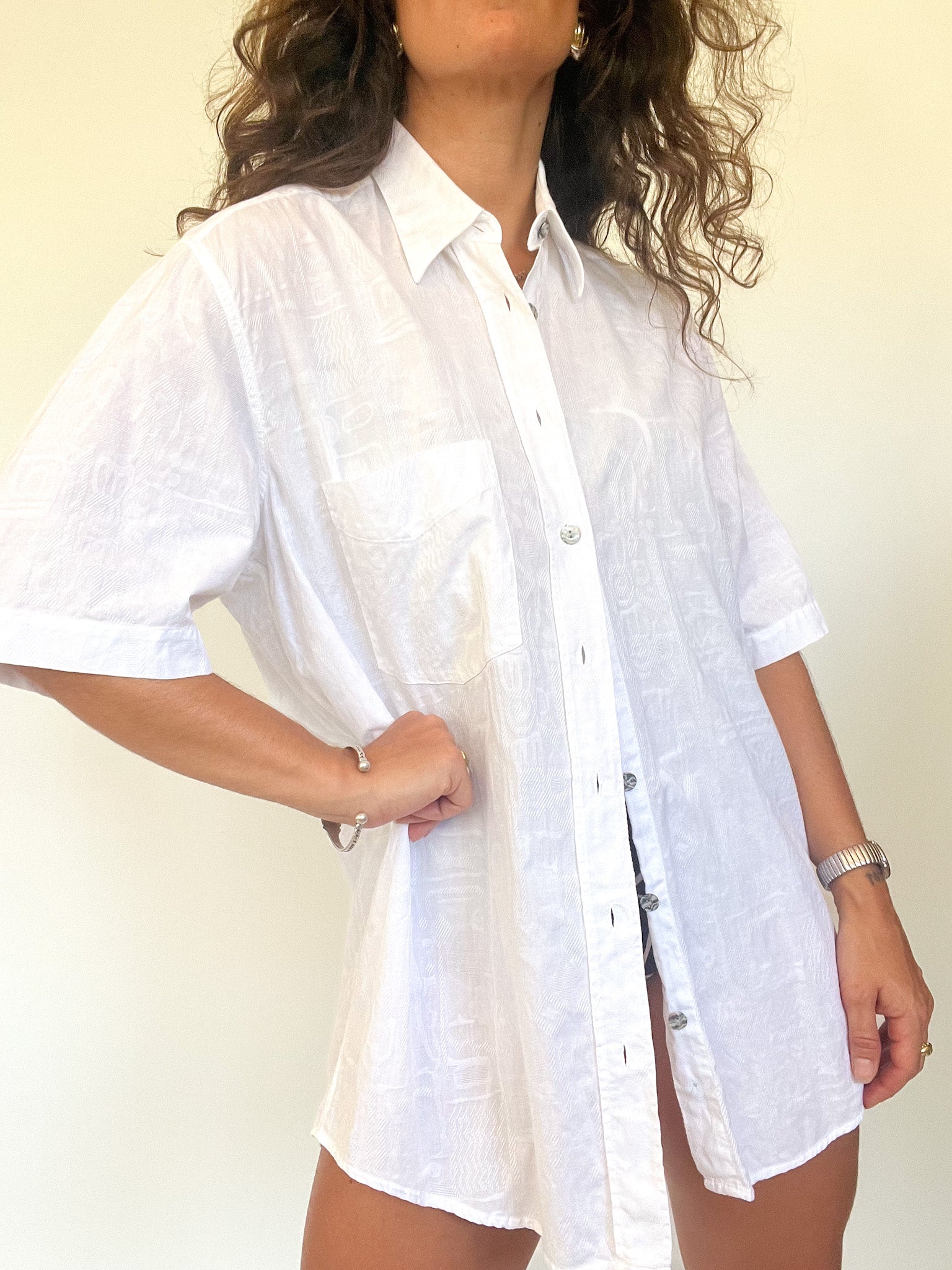 Minimalist from afar, rich in detail up close. This vintage short sleeve shirt is crafted from 100% cotton with a tone-on-tone jacquard texture that catches the light and elevates its clean silhouette. Lightweight and oversized, it’s the kind of summer piece that becomes your everyday go-to—layered over swimwear or paired with crisp tailoring. True to the Skorpiones philosophy, it’s an understated essential with just the right amount of edge.
