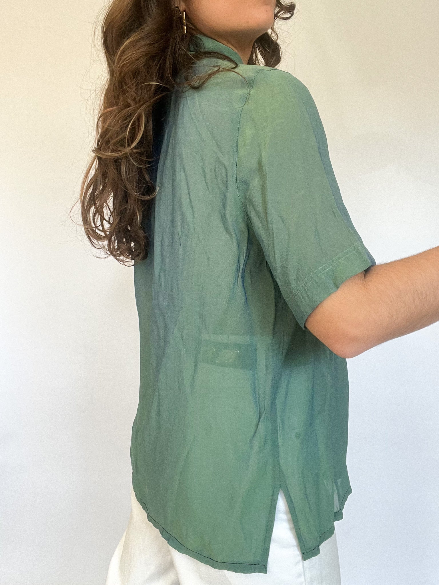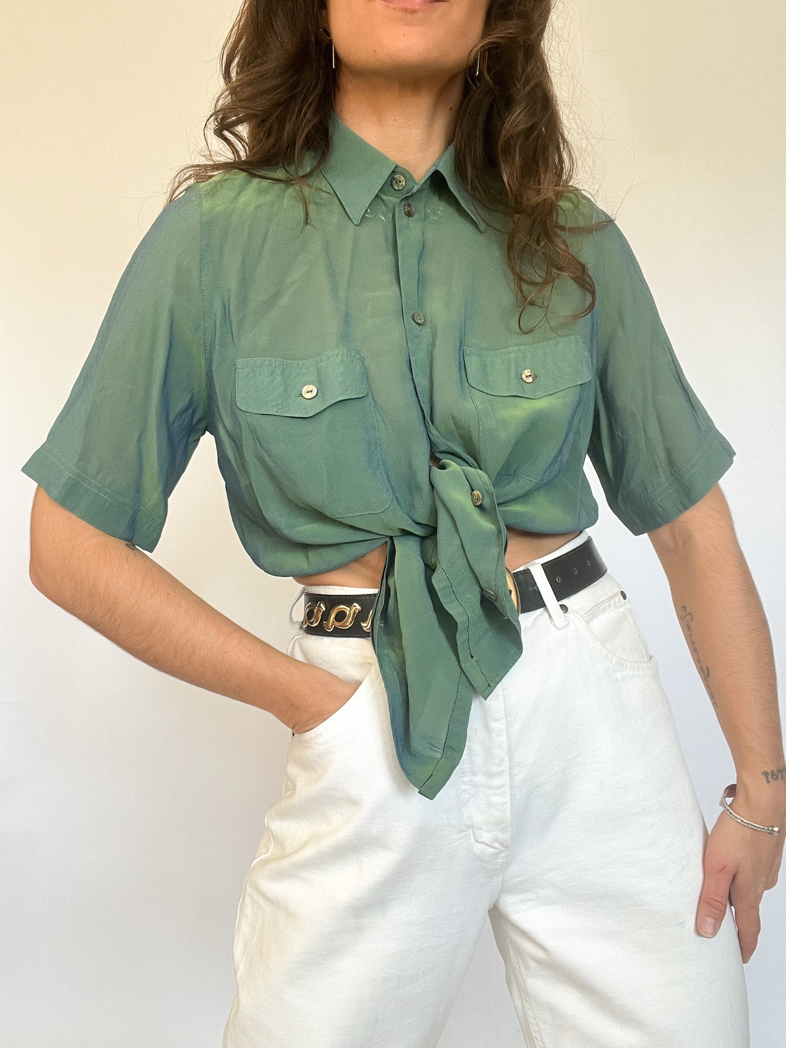 This vintage shirt from the 90s is a minimalist dream with maximum impact. The chameleon green tone feels effortlessly refined. Its sharp collar, pleated chest details and slightly puffed sleeves create a subtle structure, while the fluid drape adds a relaxed elegance. A timeless piece that blurs the line between masculine tailoring and feminine finesse — wear it tucked, belted or open for endless versatility.